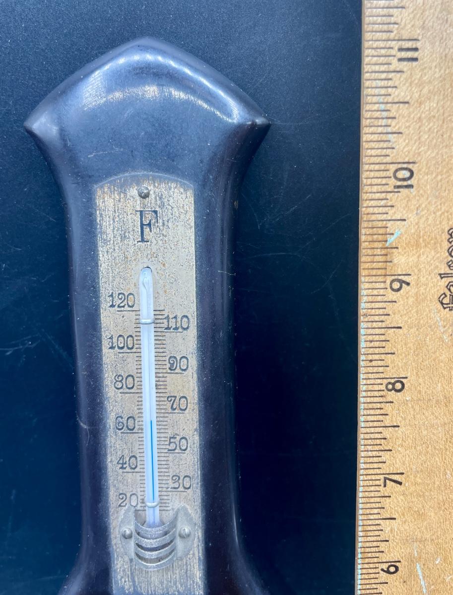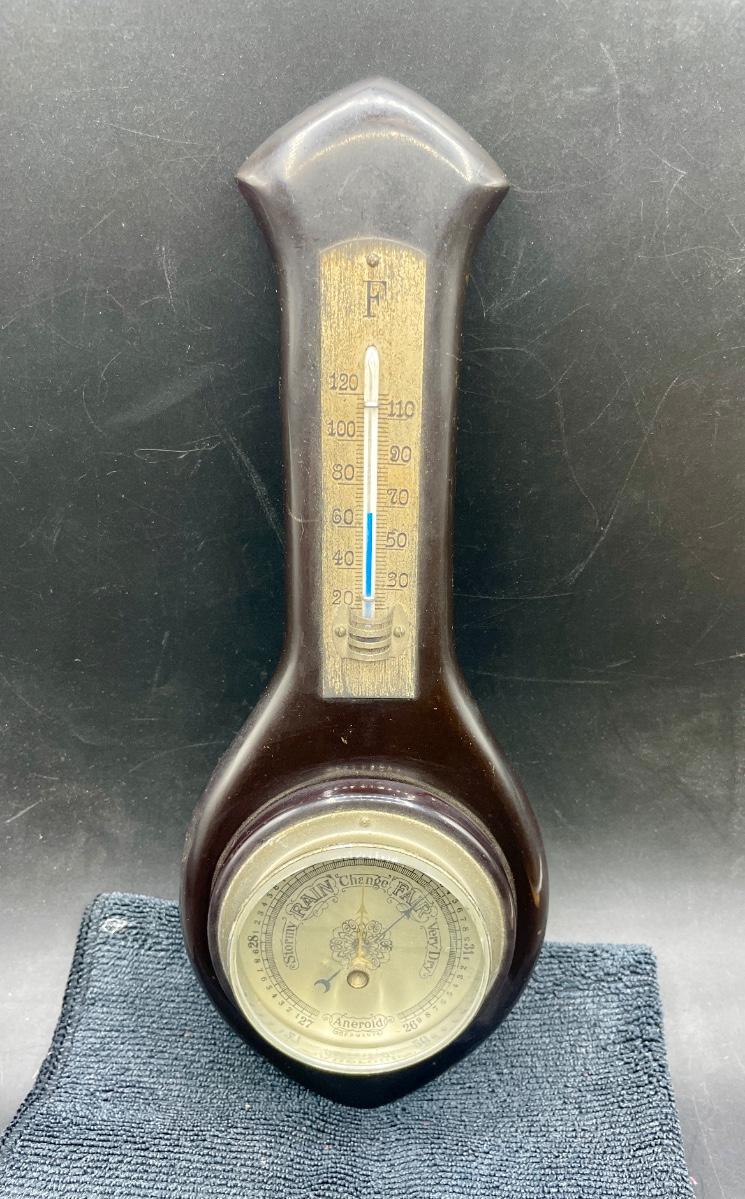 Thermometer and barometer in a beautiful Mahogany case. Working condition. Approx. 11" tall. For hanging on a wall. Age unknown, possibly made in West Germany.