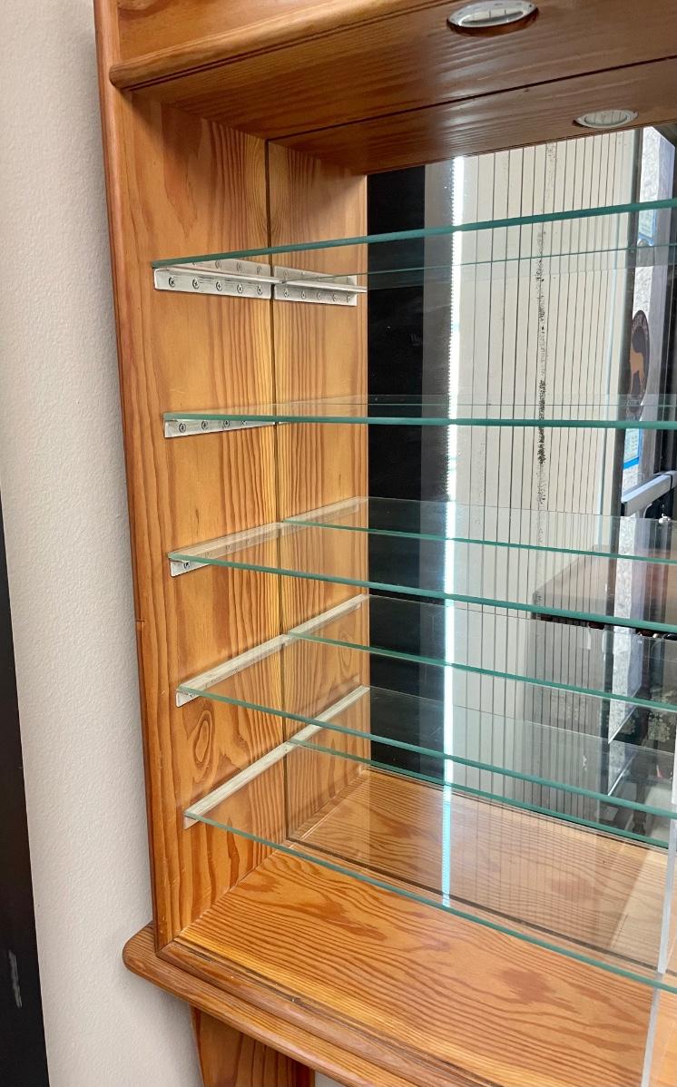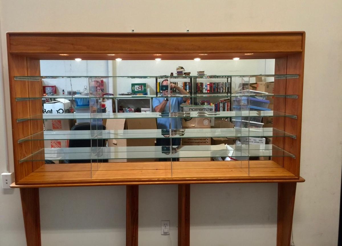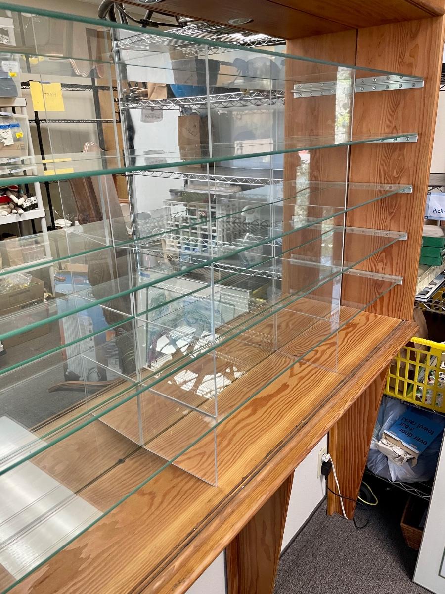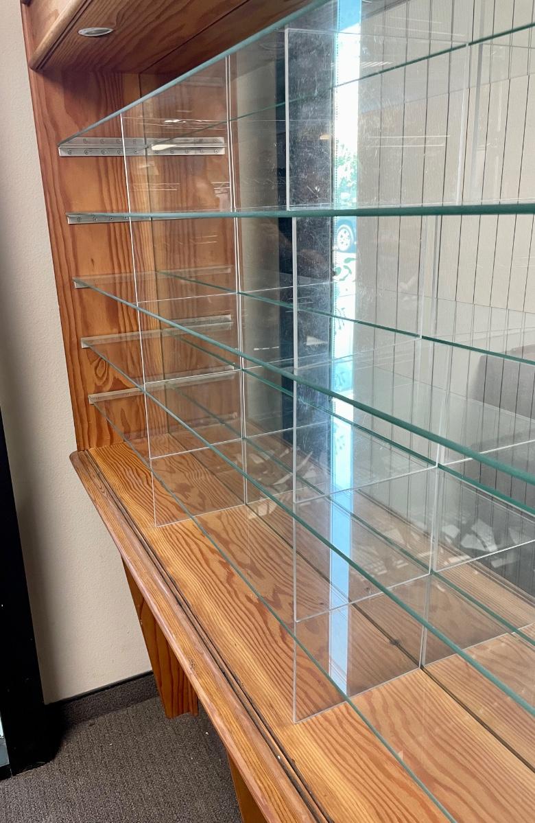 Custom built 2-piece display shelf, has 5 tempered glass shelves with 3 clear plexiglass dividers per shelf. Dividers also act as supports to keep the glass shelves from bowing. Has 5 halogen lights, all controlled by a switch in the cord. Overall height is approx. 77” ( display portion is 41”, support base is 36”); 82” wide and 8” deep. Has a mirror on the back. Also includes 2 tempered and edge-polished sliding glass doors. There is some marks on mirror from shelves and use. Not noticeable unless you remove shelves.