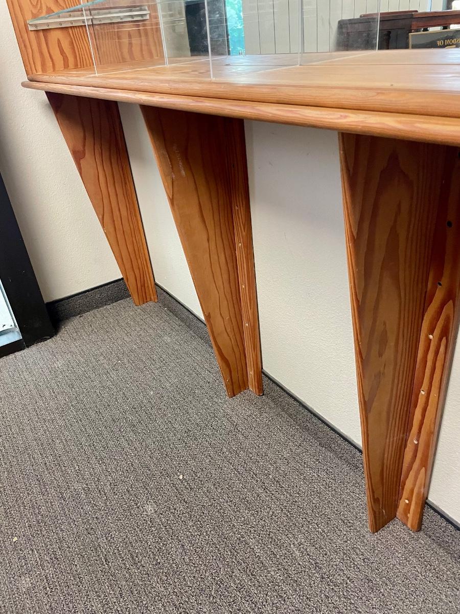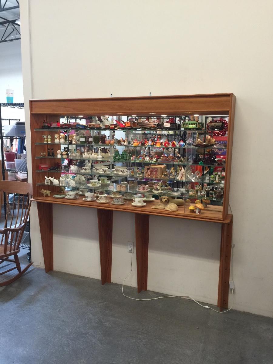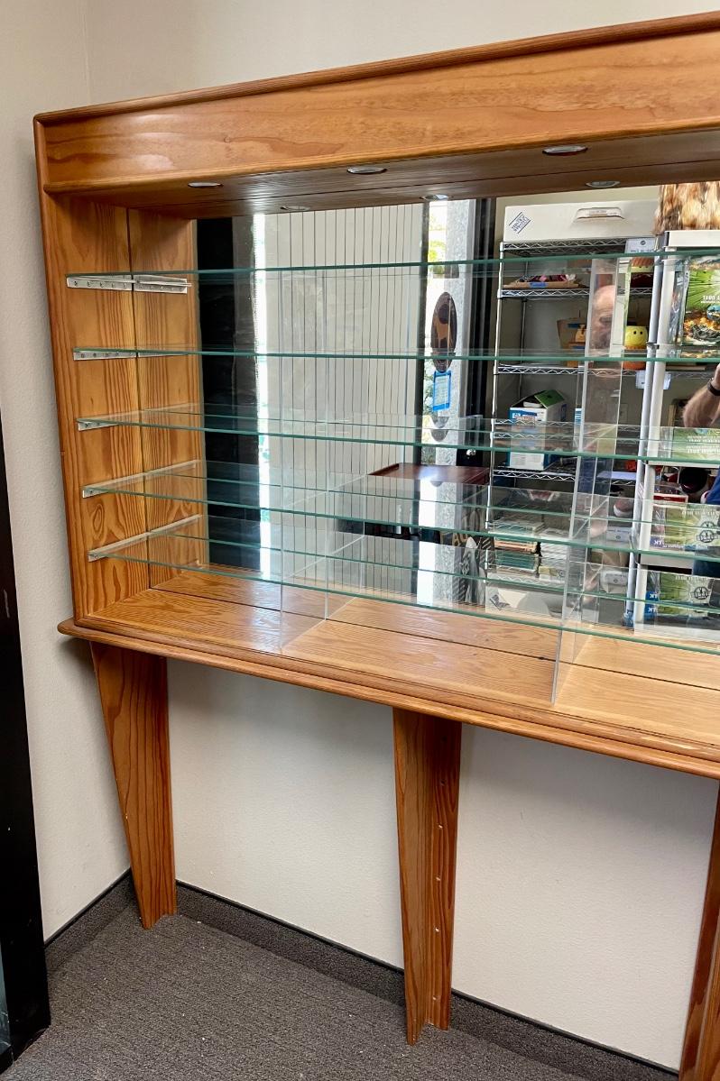 Custom built 2-piece display shelf, has 5 tempered glass shelves with 3 clear plexiglass dividers per shelf. Dividers also act as supports to keep the glass shelves from bowing. Has 5 halogen lights, all controlled by a switch in the cord. Overall height is approx. 77” ( display portion is 41”, support base is 36”); 82” wide and 8” deep. Has a mirror on the back. Also includes 2 tempered and edge-polished sliding glass doors. There is some marks on mirror from shelves and use. Not noticeable unless you remove shelves.