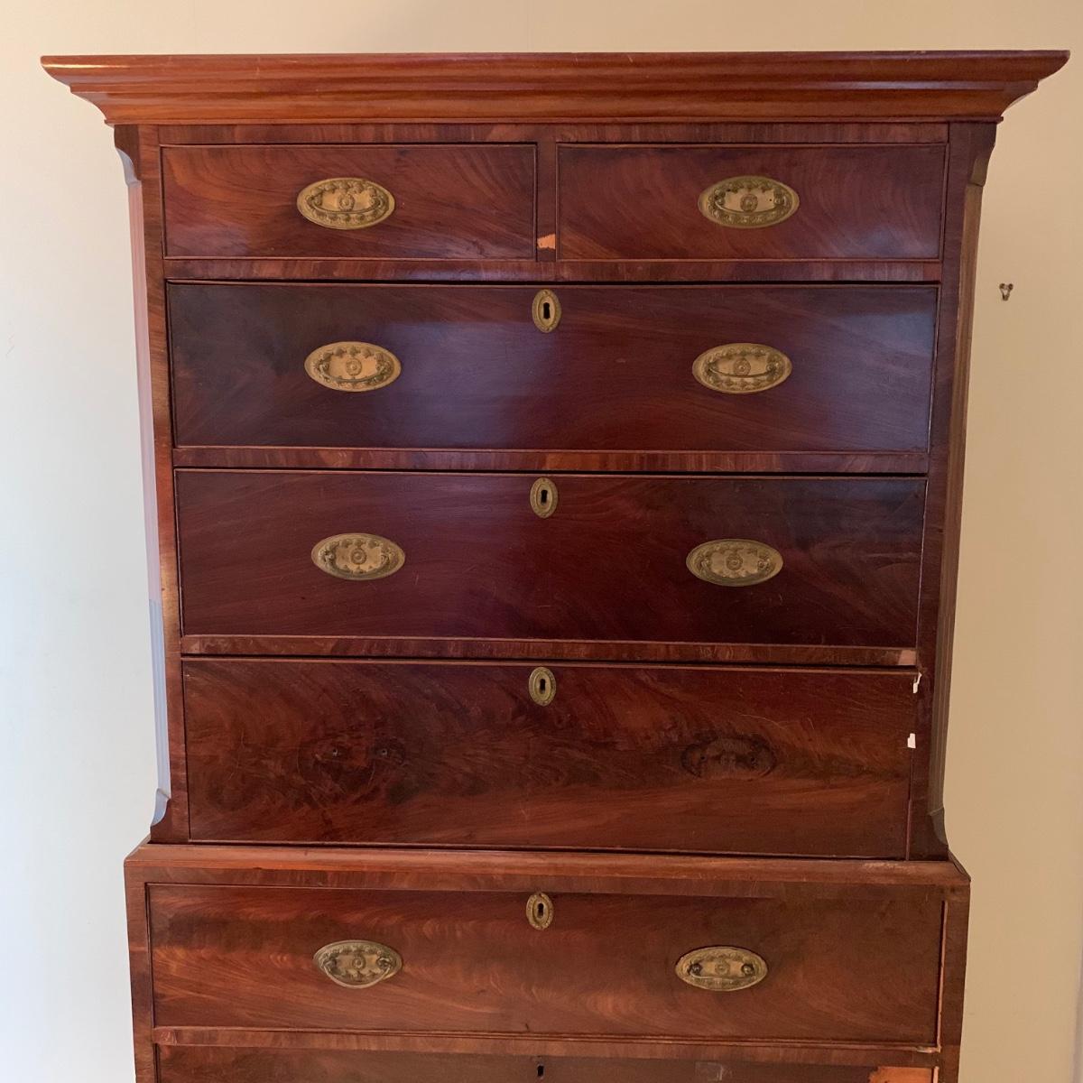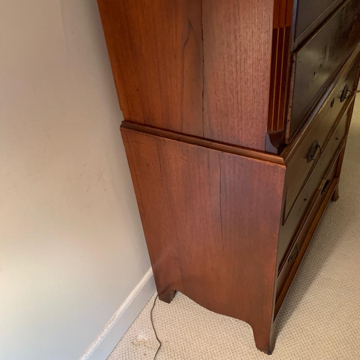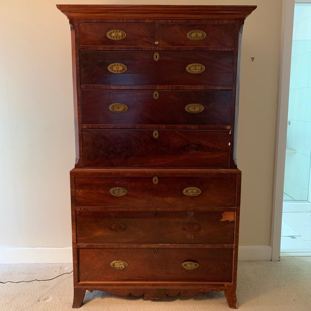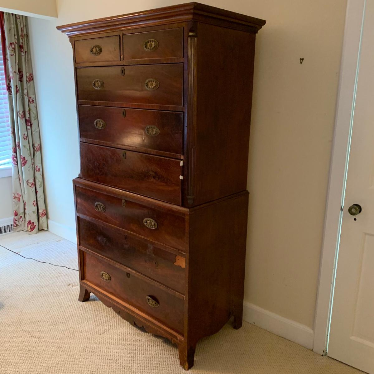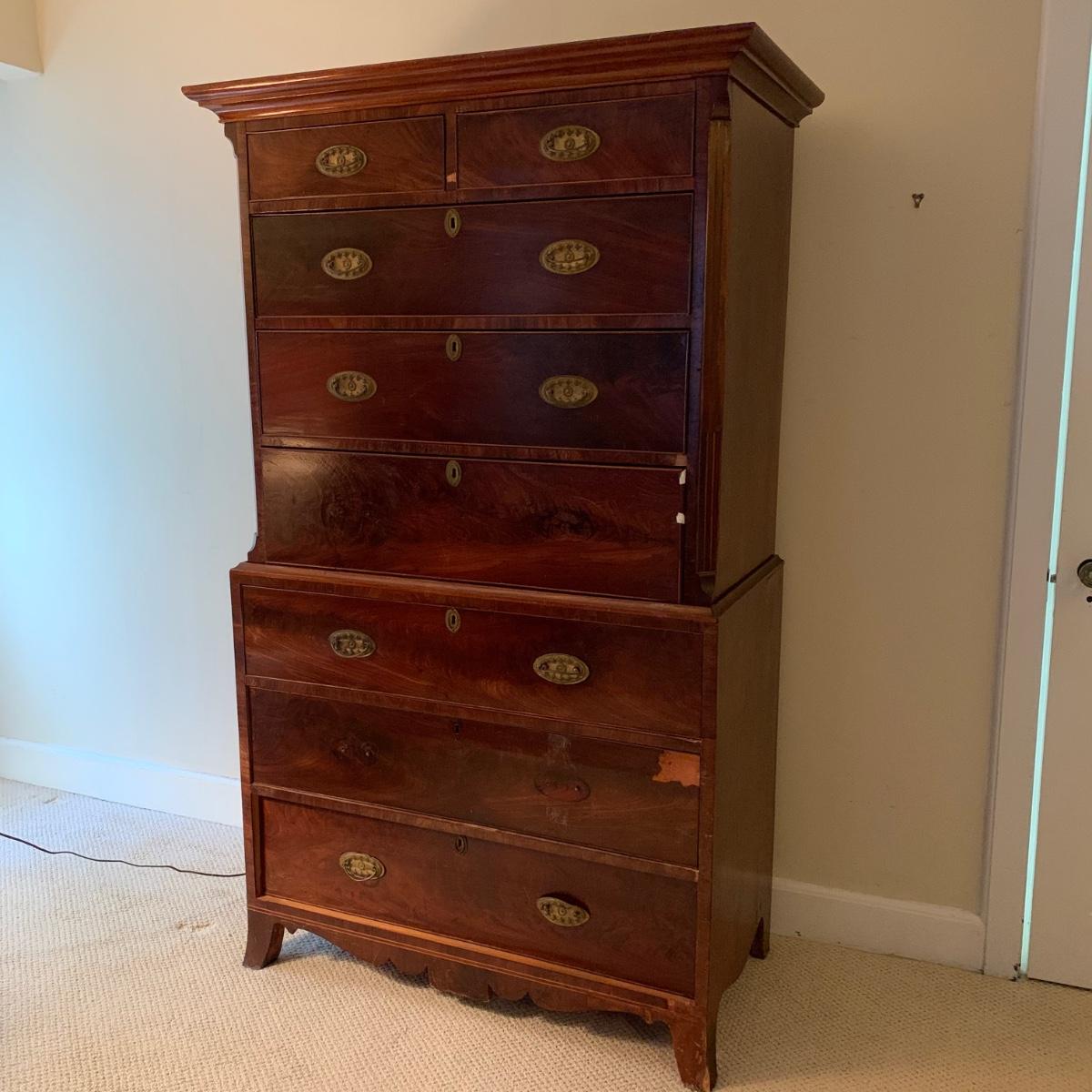 Timeless solid wood chest on chest that appears to be walnut. Piece is crafted with dovetail joinery and features wood inlay. Handles and locks are brass. Please note, piece does not come with keys. Chest measures approximately, 40.5” x 21” x 72”H and is two pieces that just sit on top of each other. Local pickup only. Winning bidder must bring assistance to help move and load this item due to its weight and/or size. Item will need to be moved down flight of stairs and throughout home to exit.