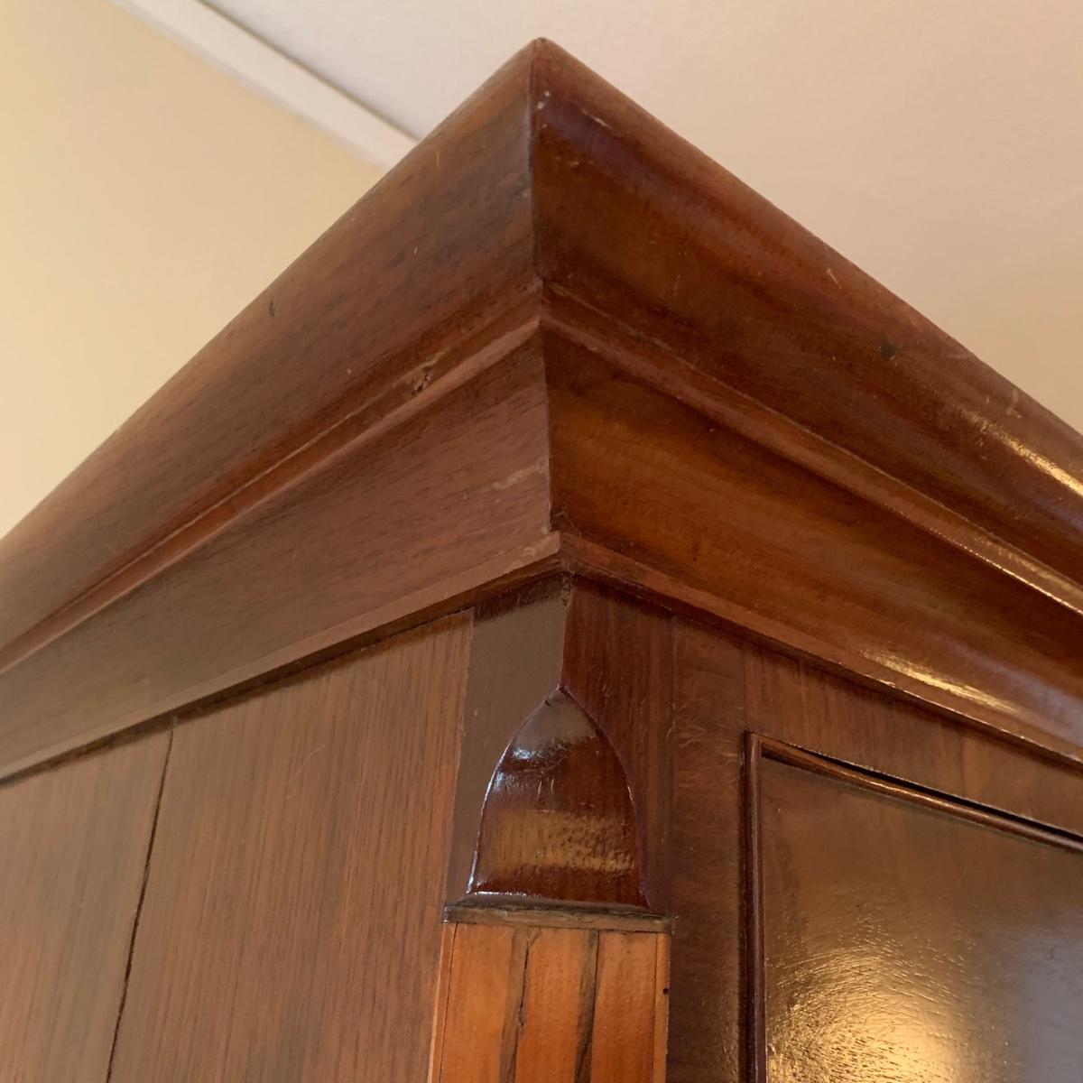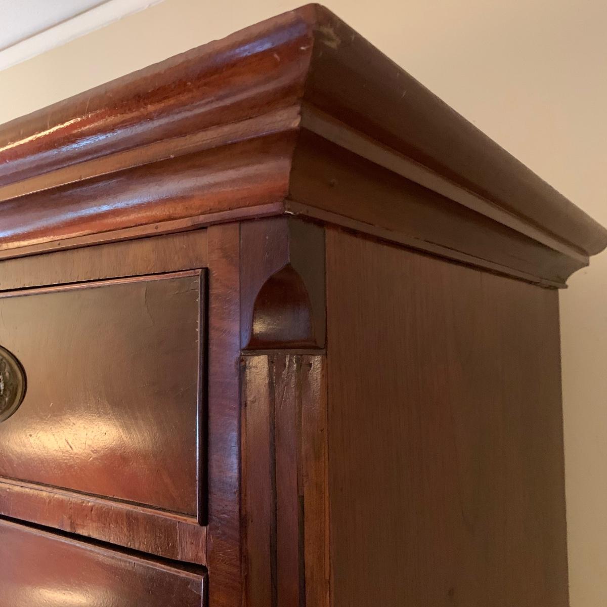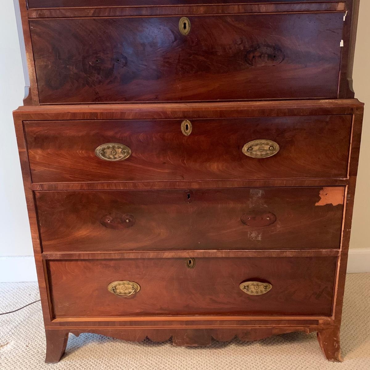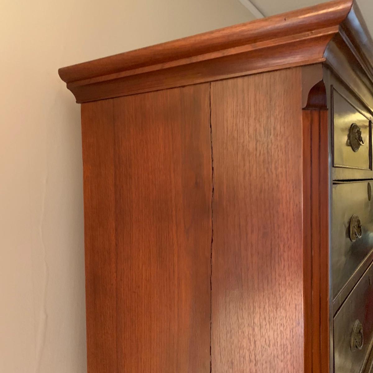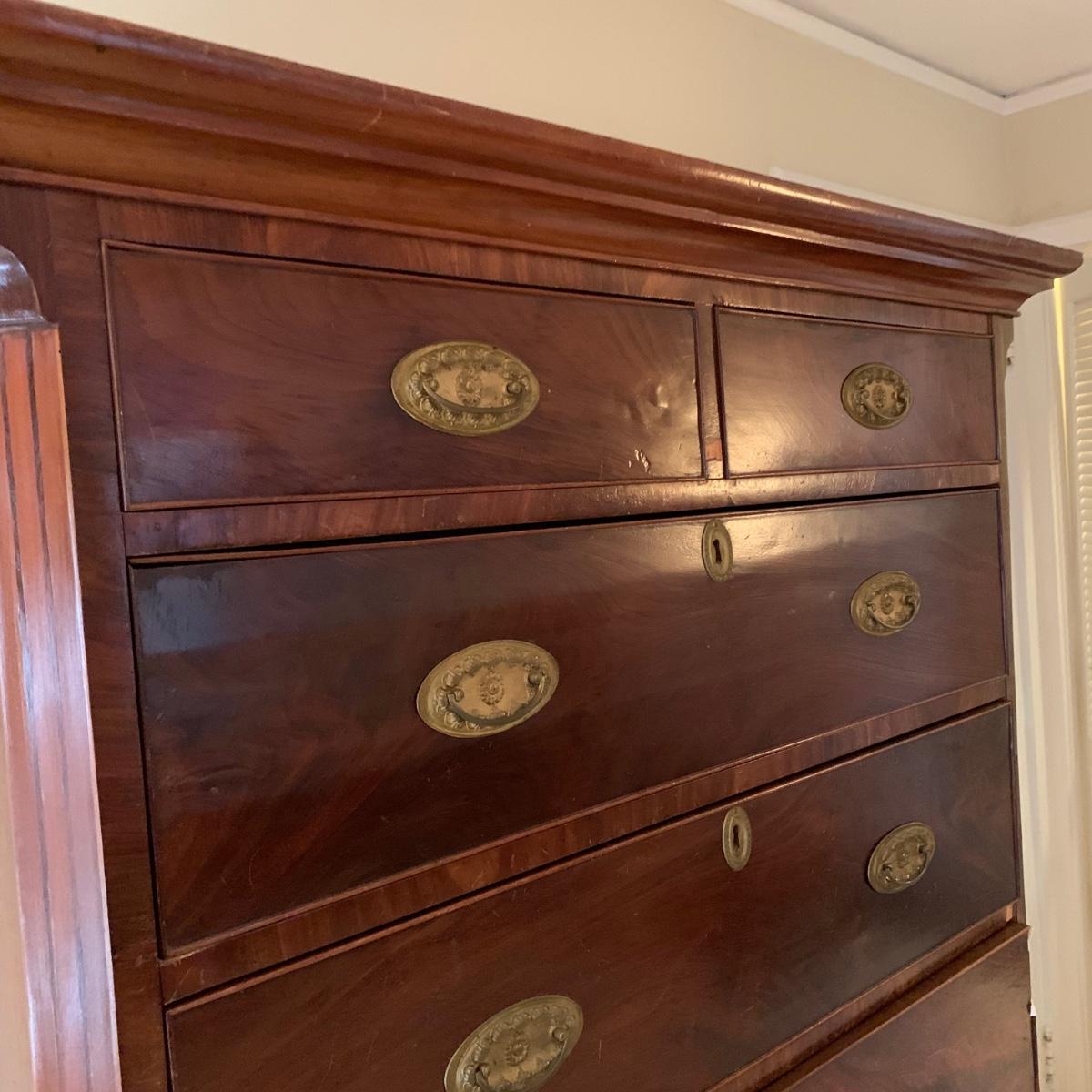 Timeless solid wood chest on chest that appears to be walnut. Piece is crafted with dovetail joinery and features wood inlay. Handles and locks are brass. Please note, piece does not come with keys. Chest measures approximately, 40.5” x 21” x 72”H and is two pieces that just sit on top of each other. Local pickup only. Winning bidder must bring assistance to help move and load this item due to its weight and/or size. Item will need to be moved down flight of stairs and throughout home to exit.