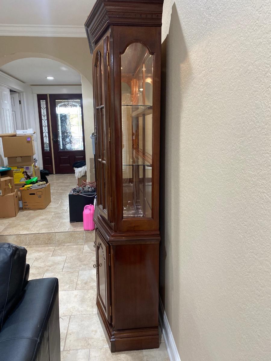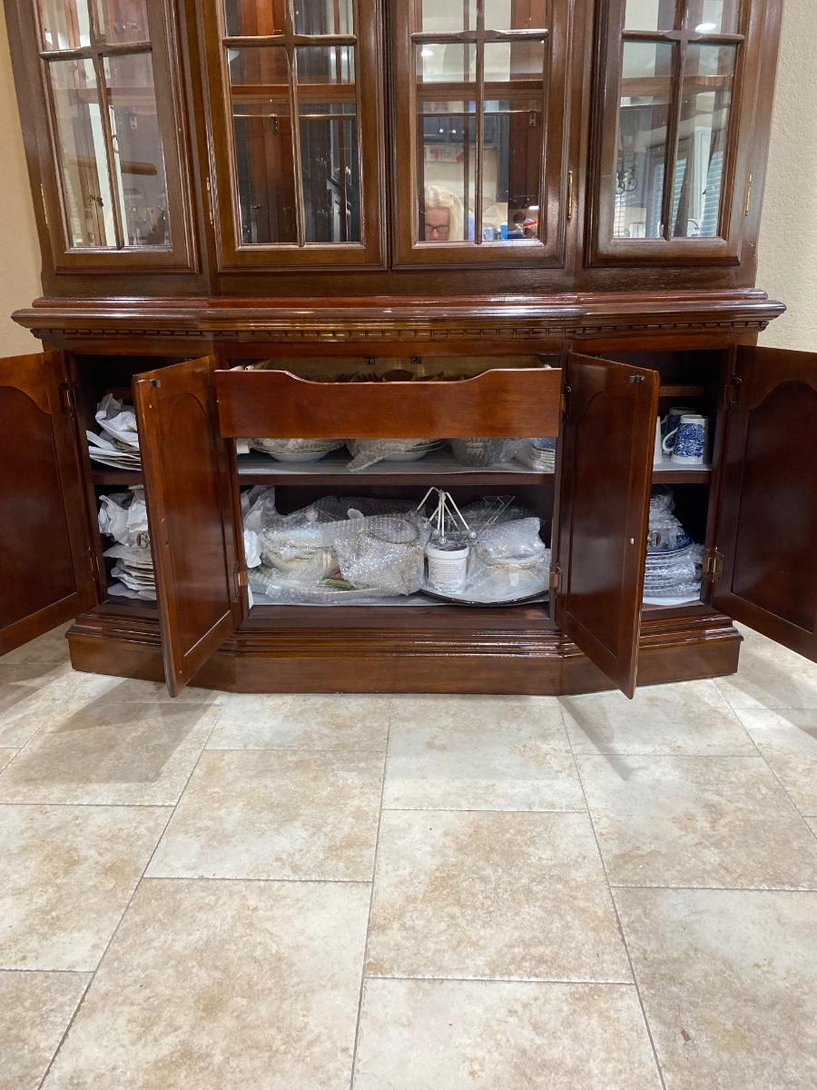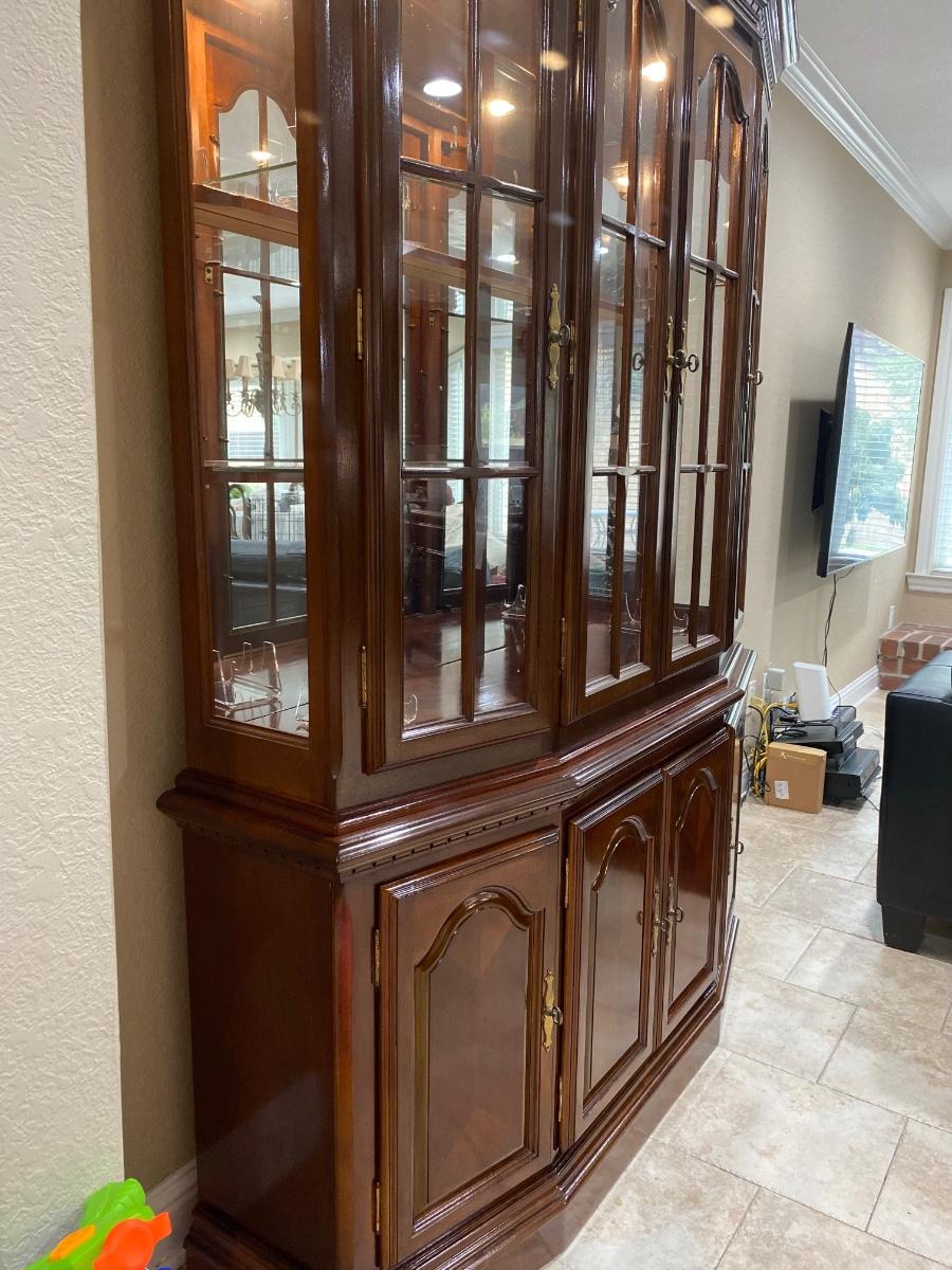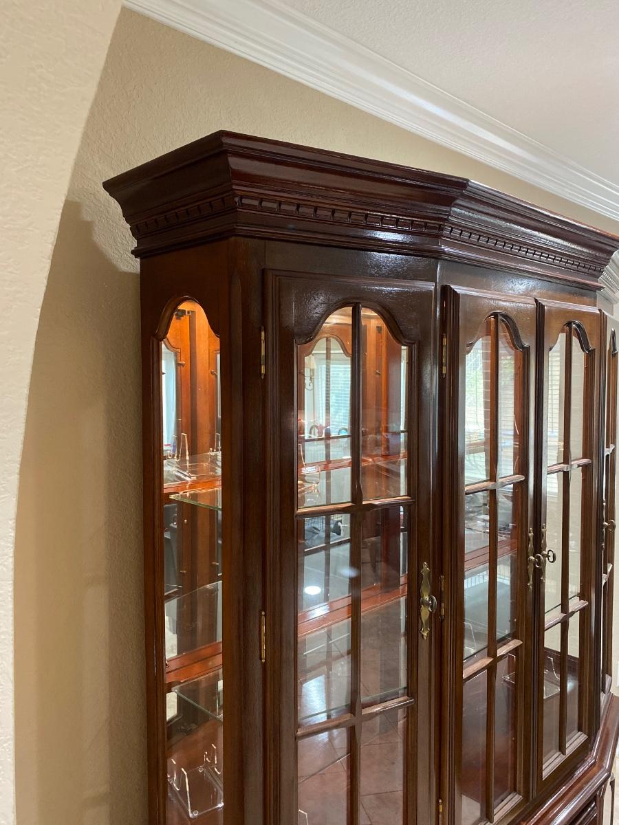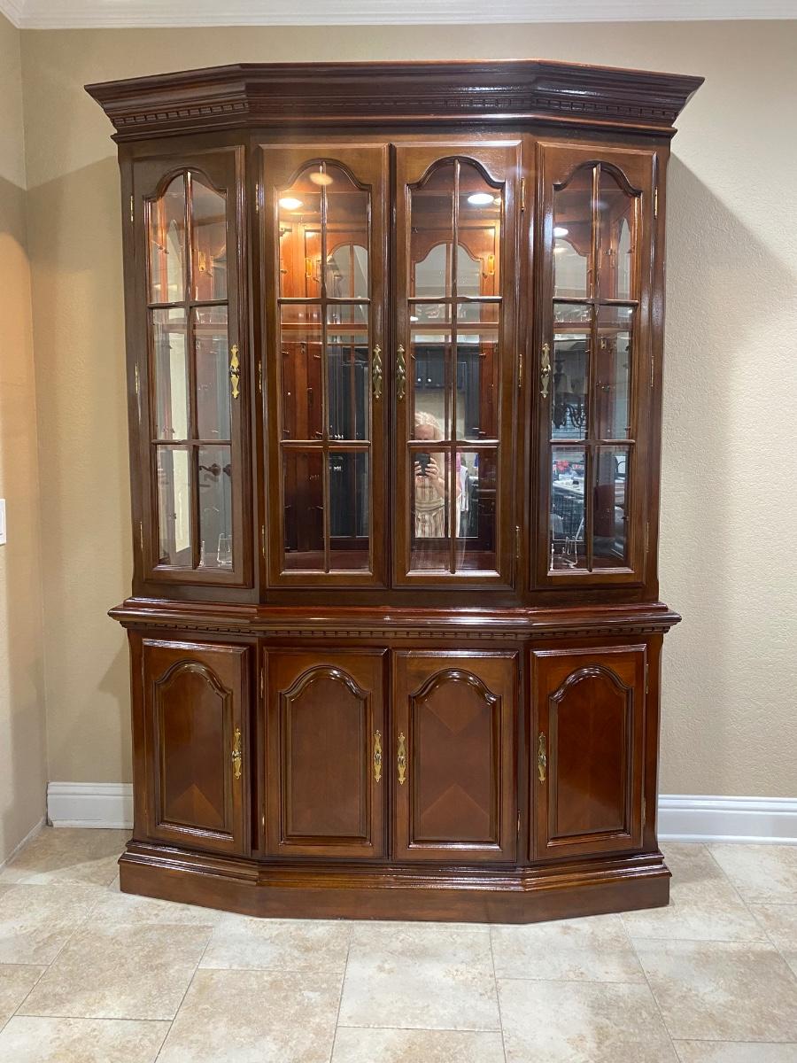 Fine China cabinet. Contents not included   58” wide, 80” tall, 15” deep.  Mirror back, 2 lights, 1 drawer and 1 shelf behind lower cabinet doors.  Breaks into 2 pieces for easier moving.  Very good condition. You will be able to pick up the cabinet, or send Lugg.com after the auction ends, at a location in San Jose