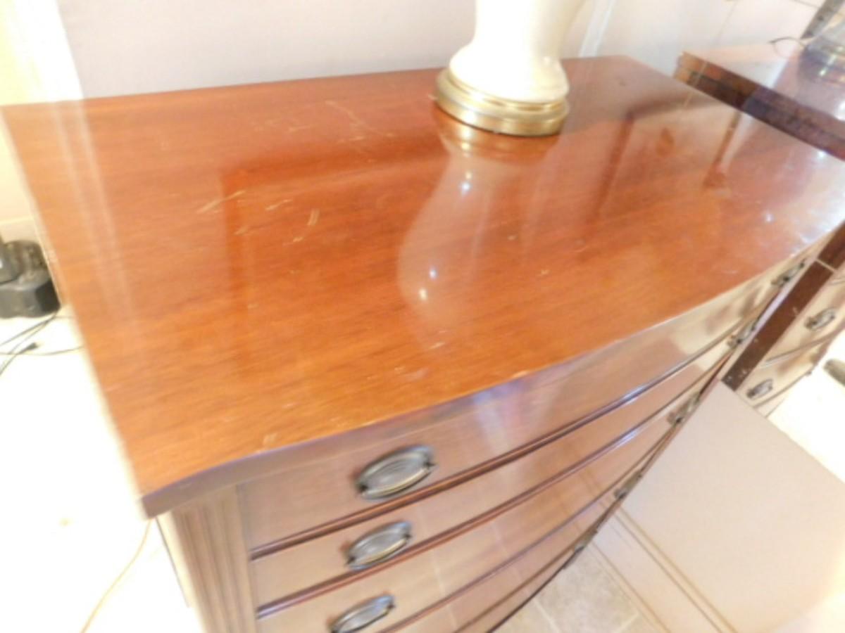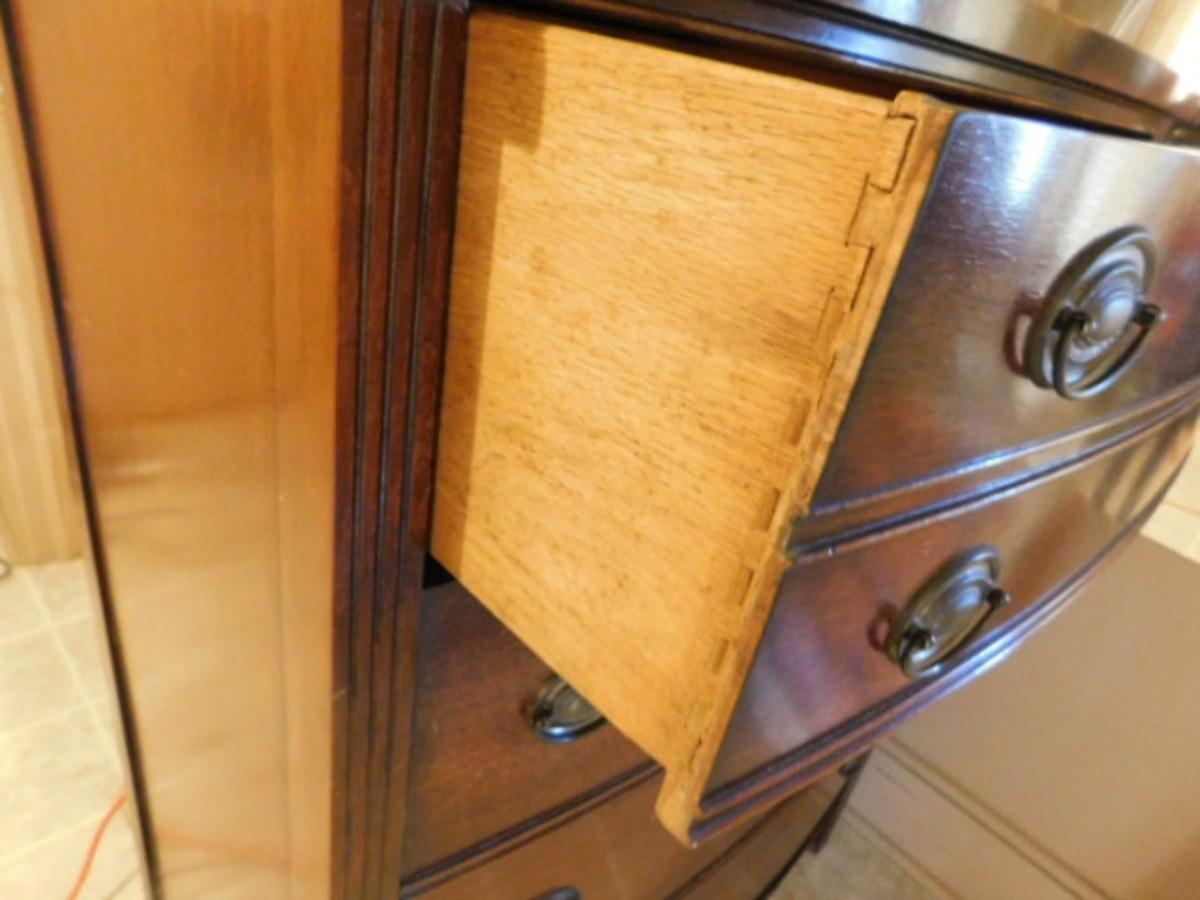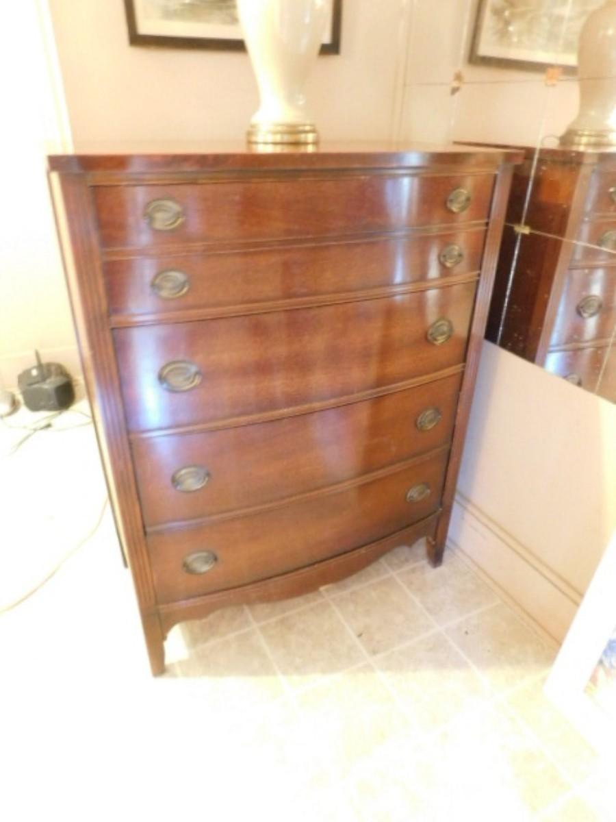 Walnut Finish Bowfront Dresser by Dixie. Has a place of delamination as shown.