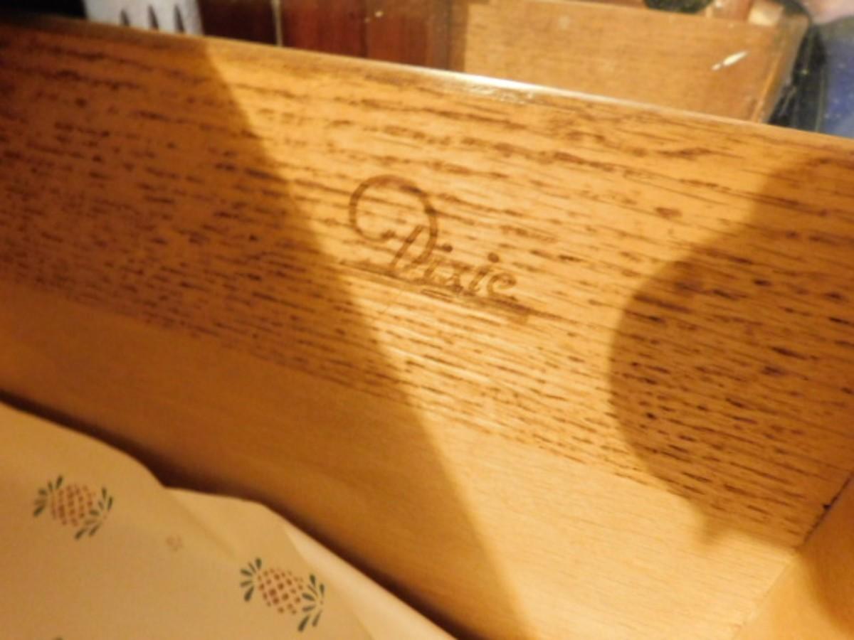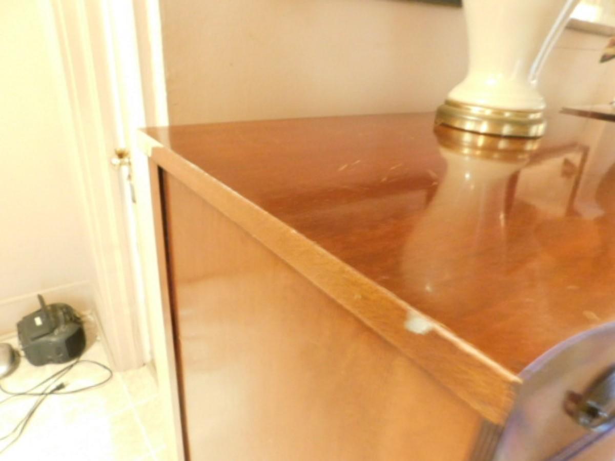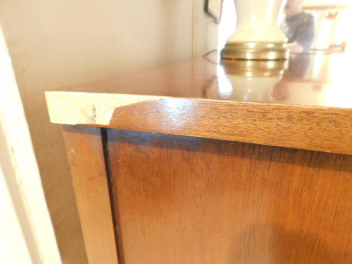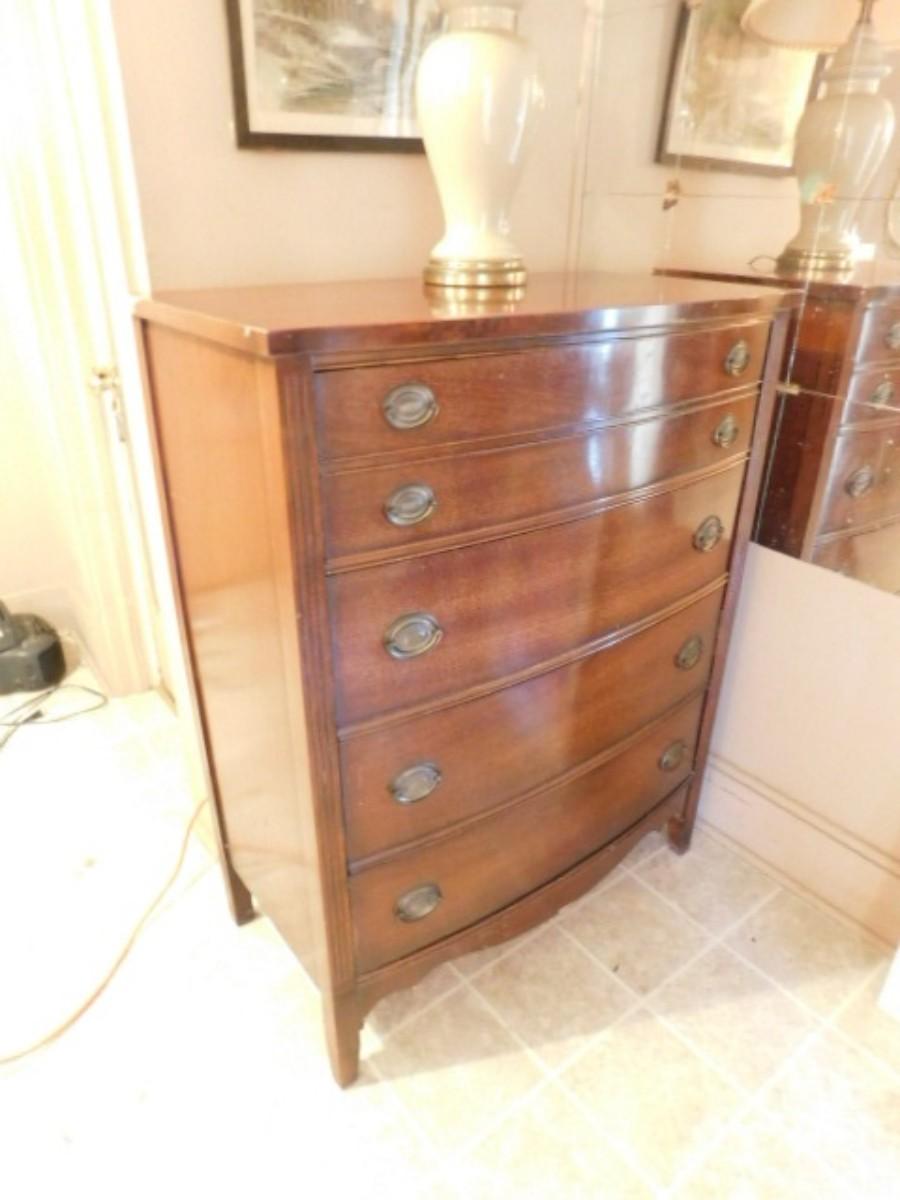 Walnut Finish Bowfront Dresser by Dixie. Has a place of delamination as shown.