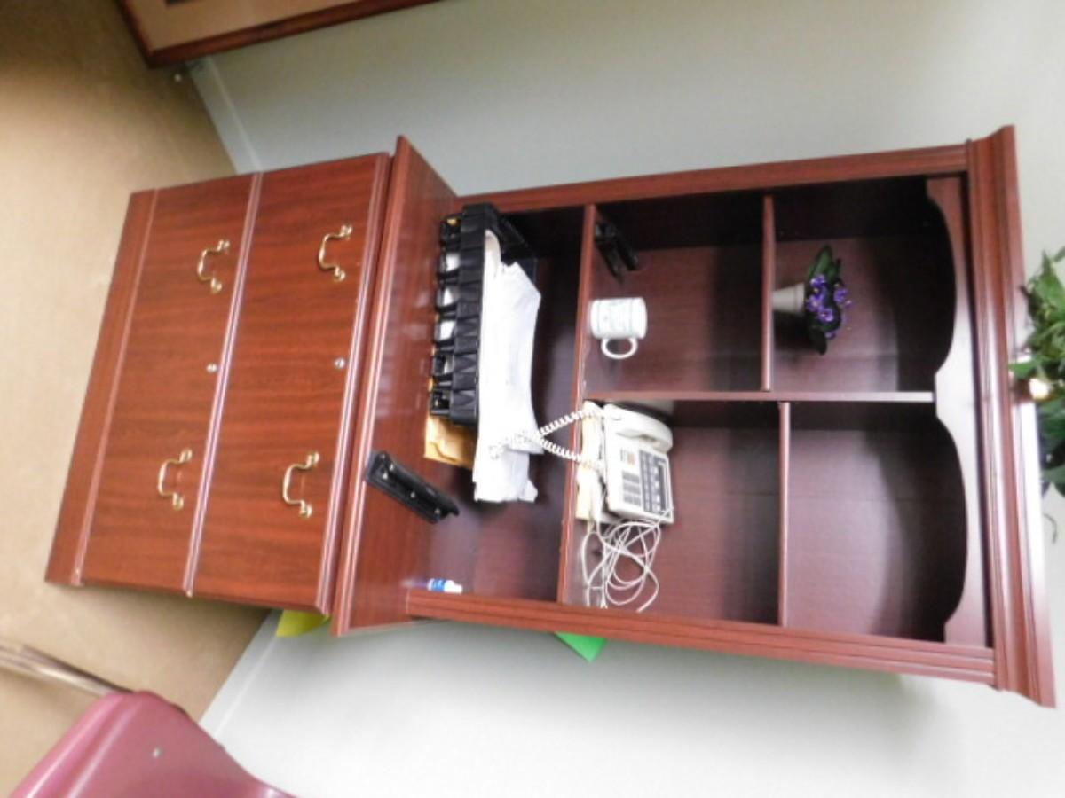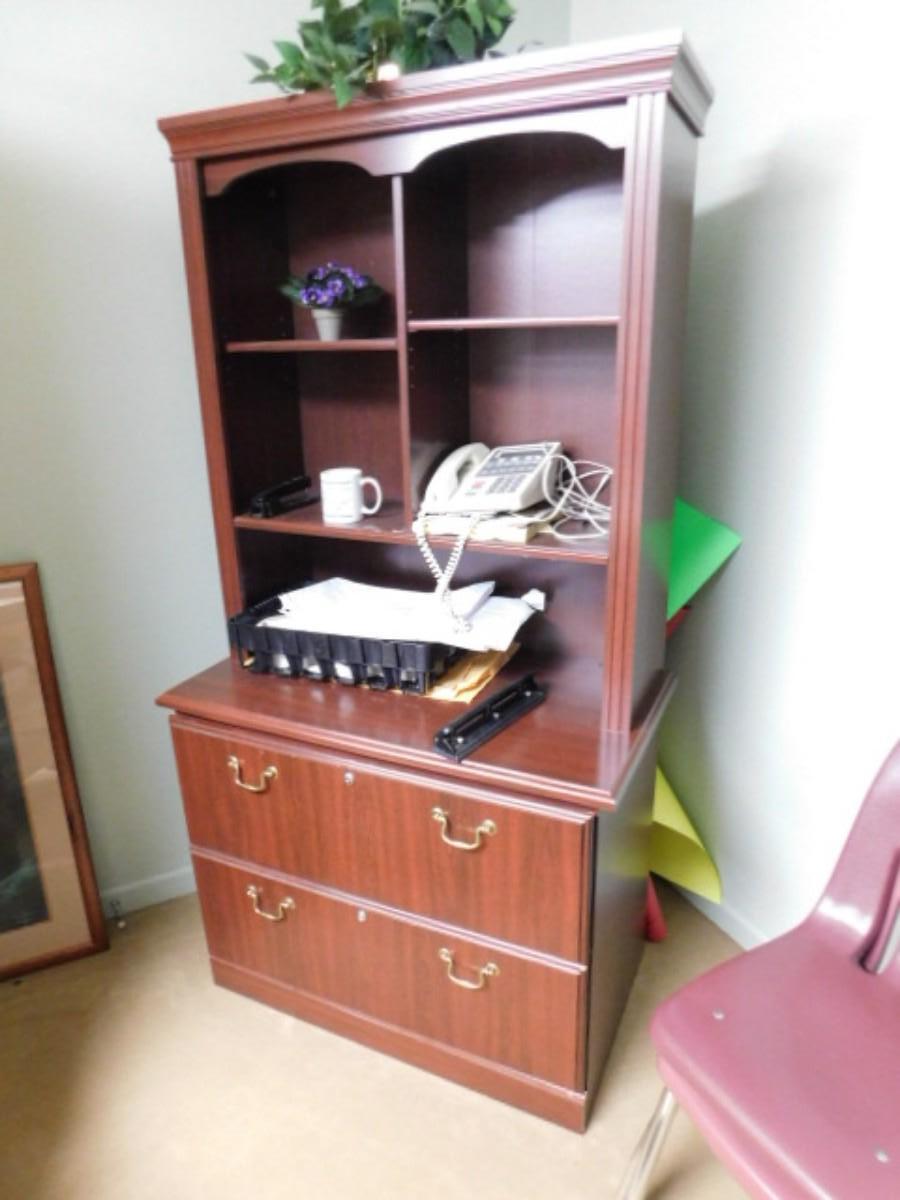 Walnut Finish Office Storage Cabinet with Book Hutch (No Contents) Expect some wear or scratches to finish. Shipping option available via freight or local mover at Buyer's expense. Buyer must have all shipping scheduled within the stated dates and times of pickup. Recommended local mover is Beaty Bros. Moving 828-201-2982