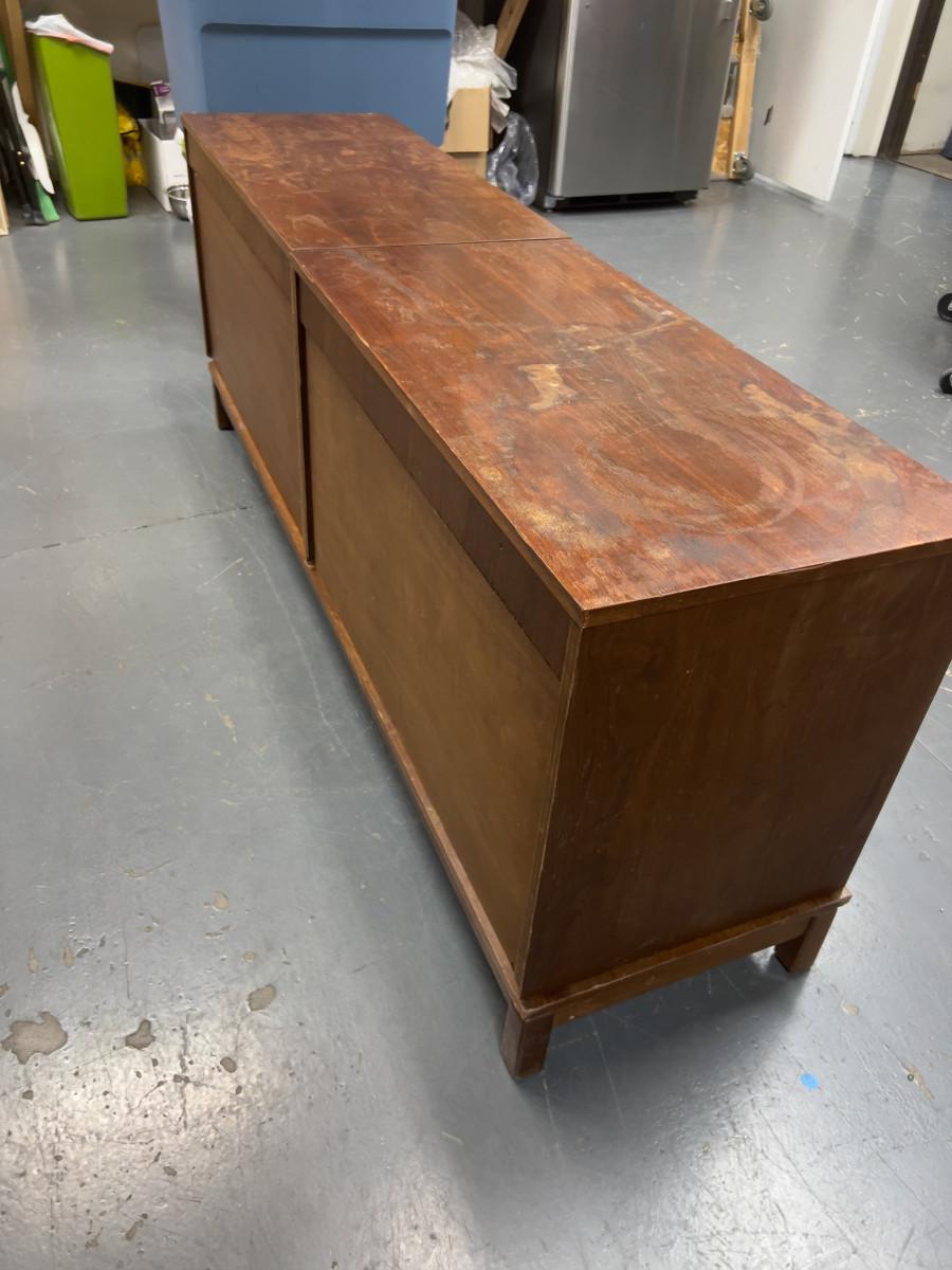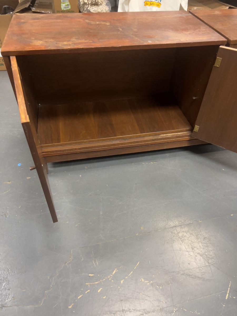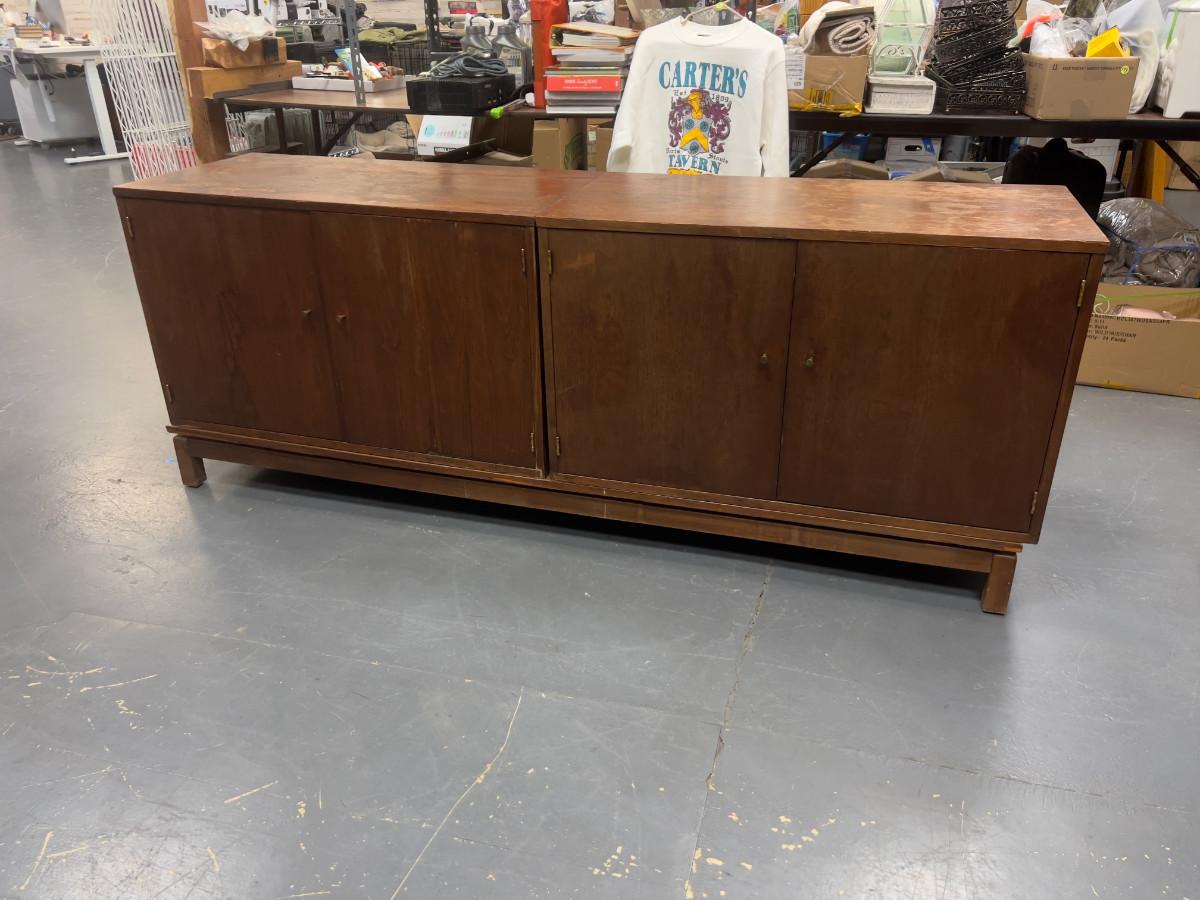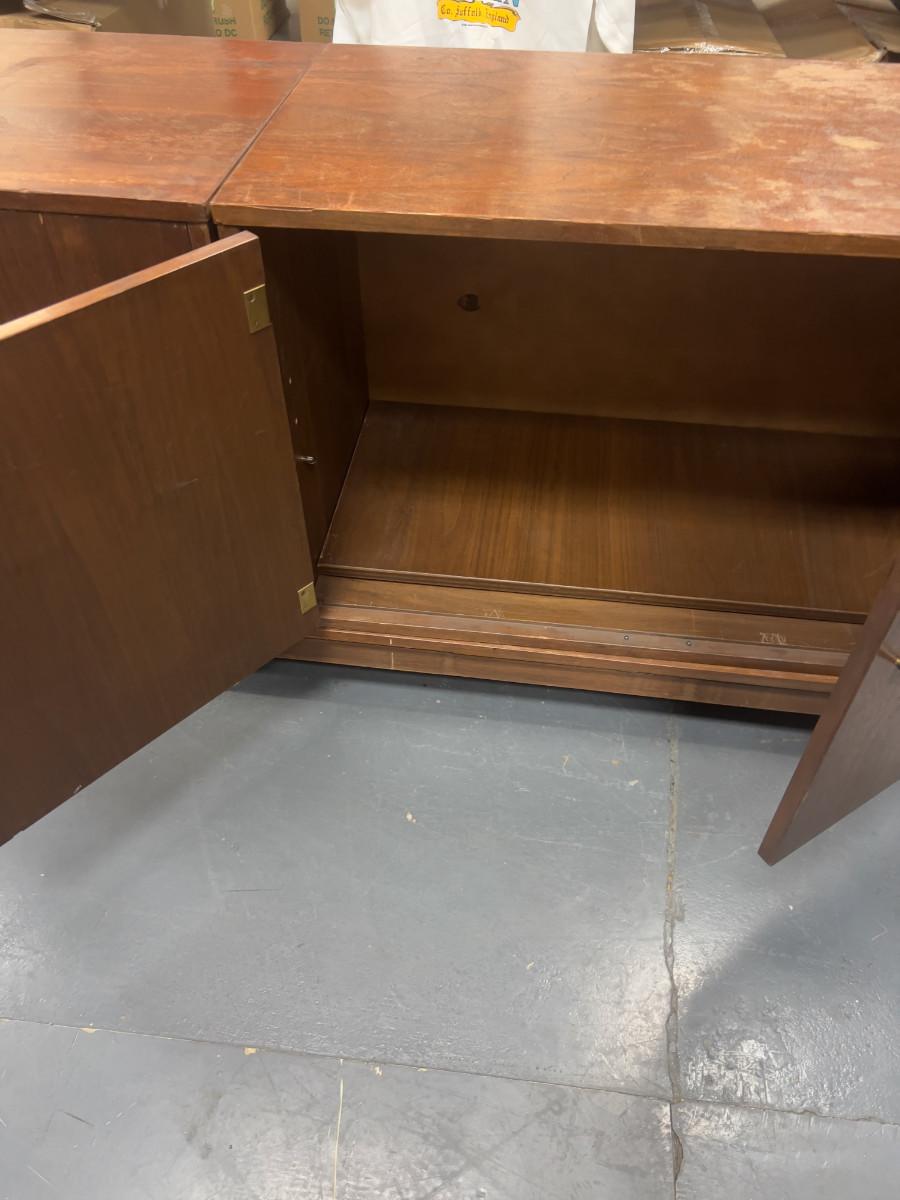 Great Storage. Has a Platform and 2 cabinet sections with a shelf inside. NO MAKERS MARK. Needs to be re-stored with the Stains, Waxes and oil. Could Paint and totally give it a new look.