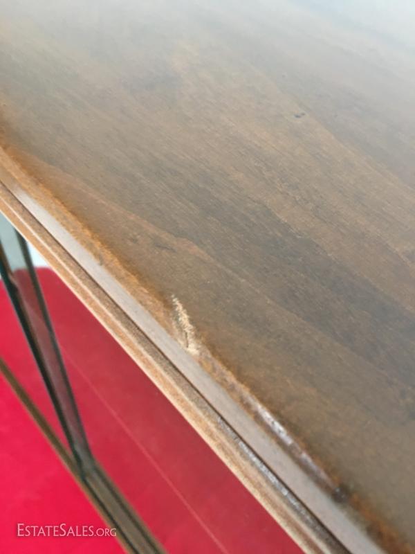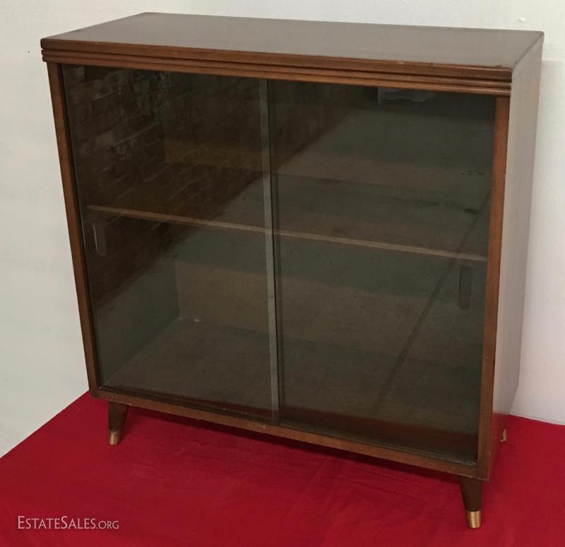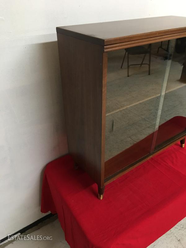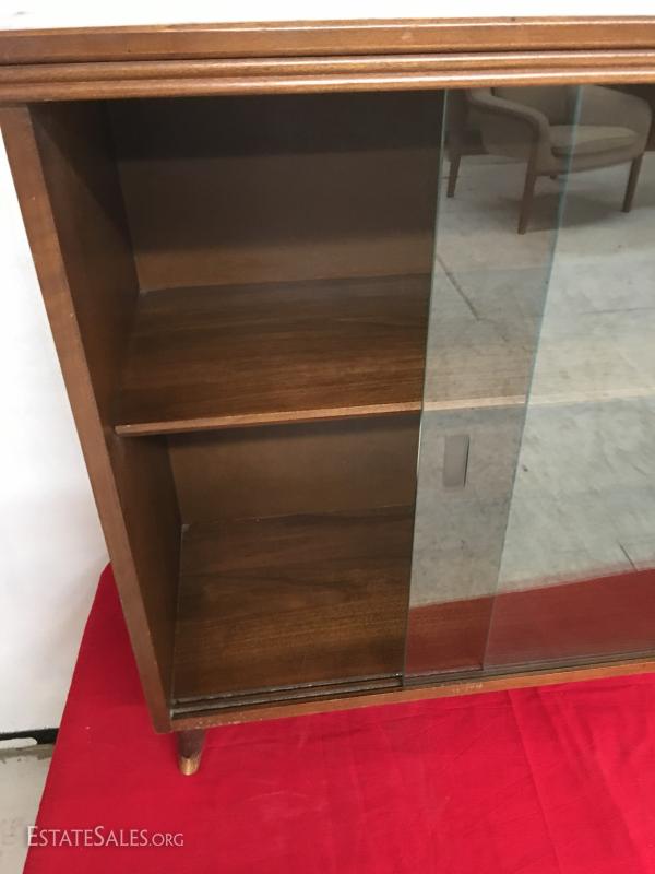 Shelf is in good condition, one small ding on top edge. Measures 29" wide, 12" deep and 30" tall, round tapered leg, solid walnut construction. 2 sliding glass doors.