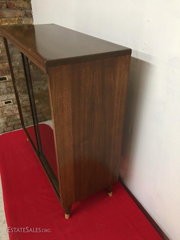 Walnut shelf, glass doors MCM tapered legs.