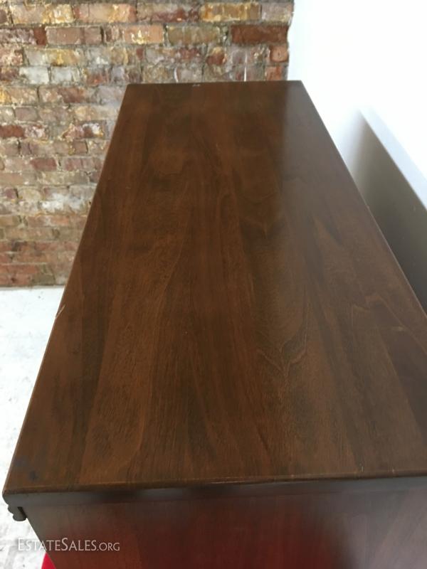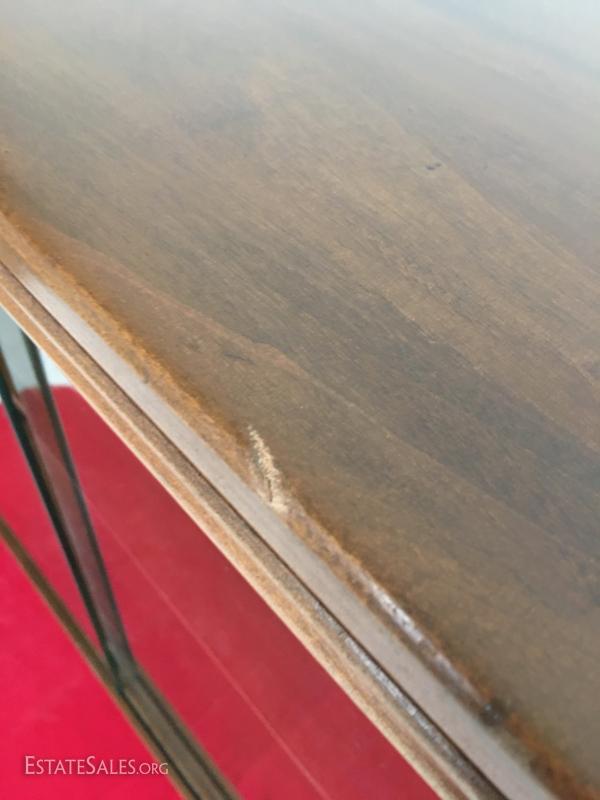 Shelf is in good condition, one small ding on top edge. Measures 29" wide, 12" deep and 30" tall, round tapered leg, solid walnut construction. 2 sliding glass doors. This table was in last months auction but the high bidder failed to pick up and pay for it.