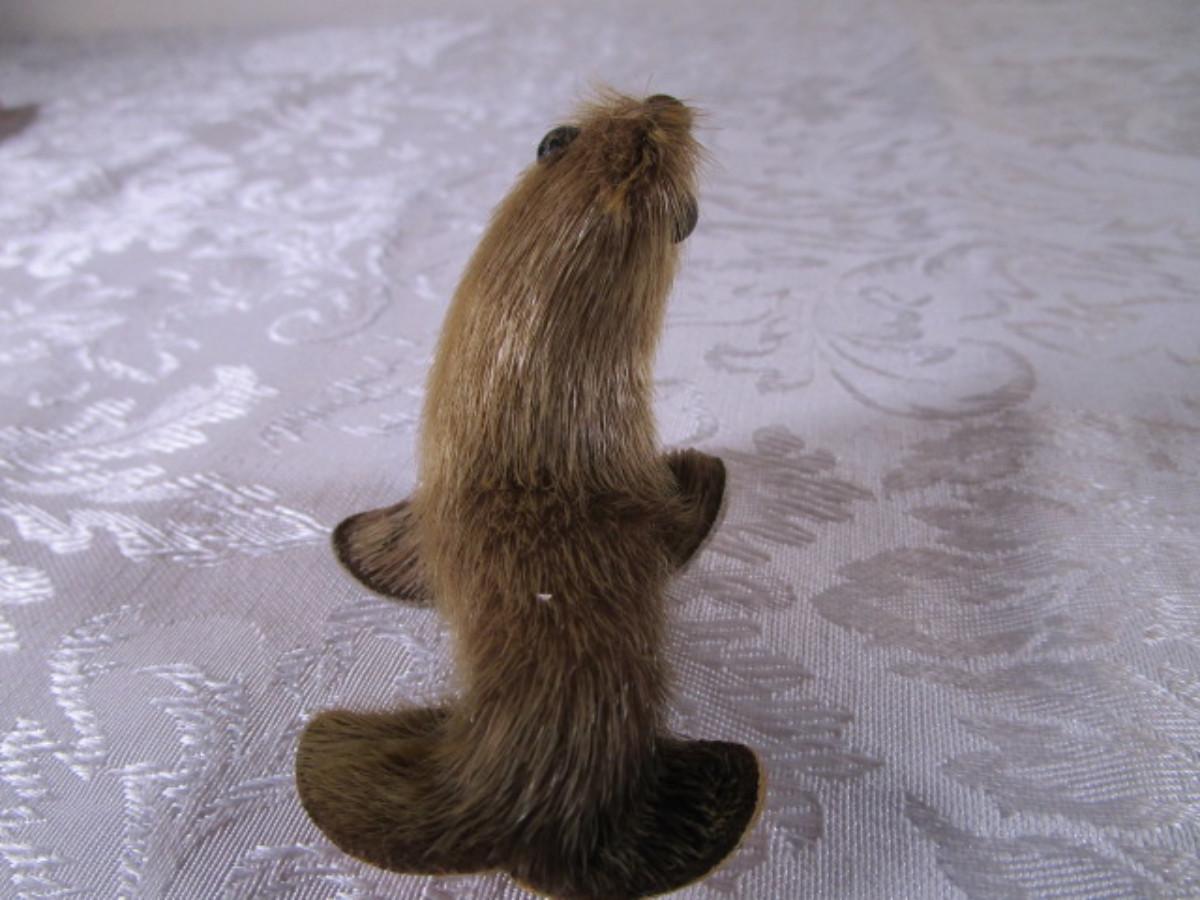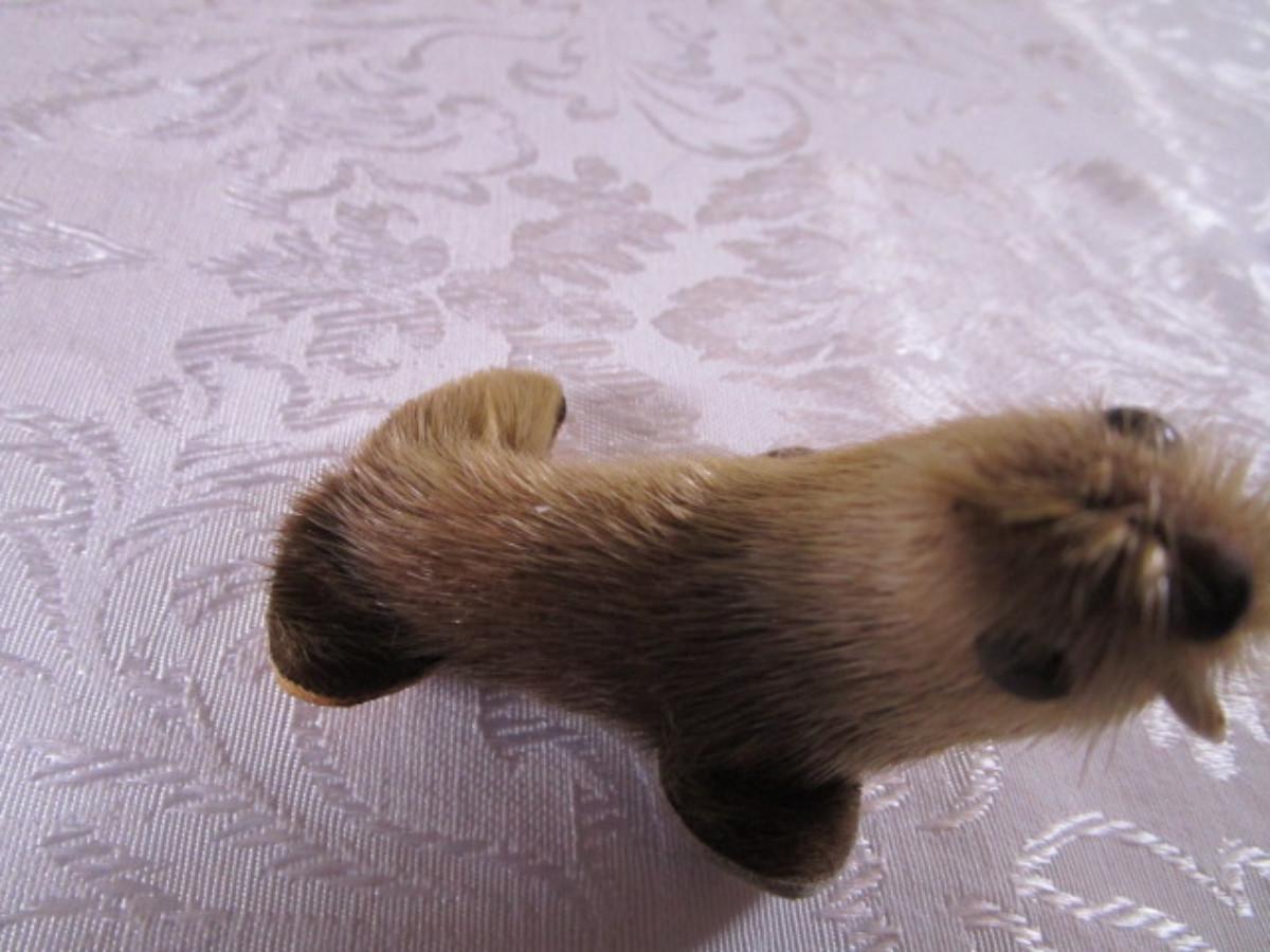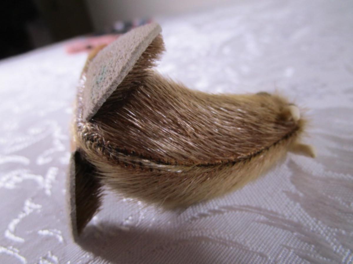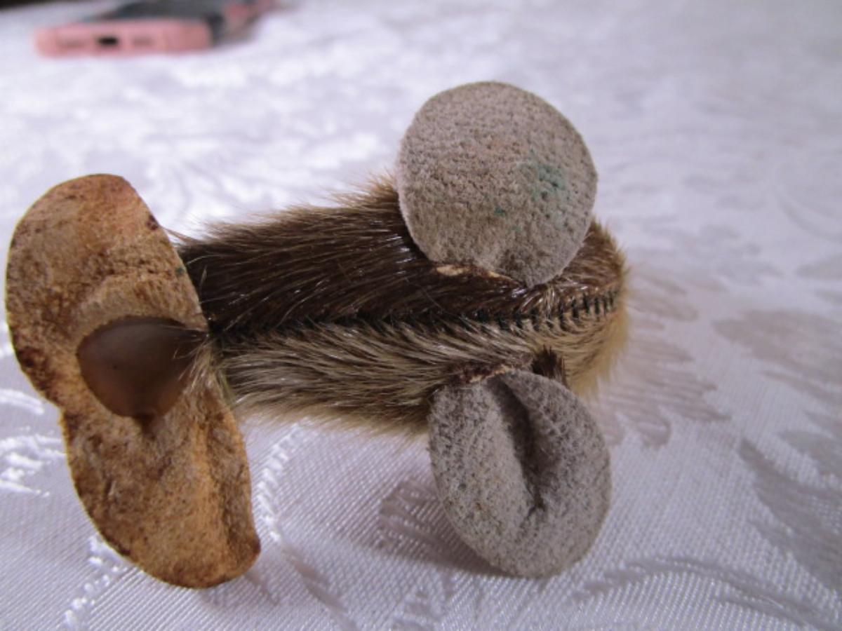 Has leather & fur feet & excellent stitching, 2-1/2" wide x 2" tall
