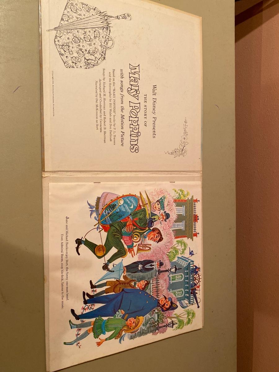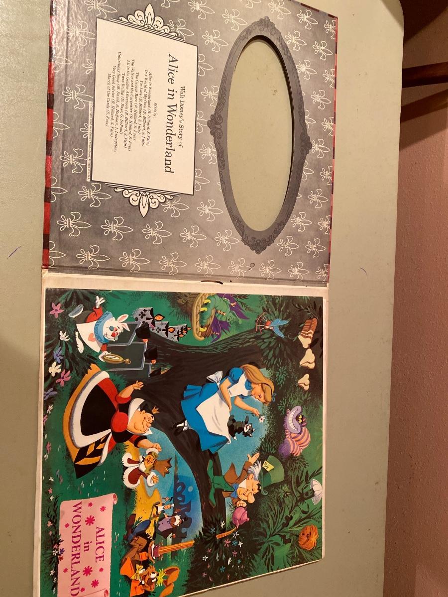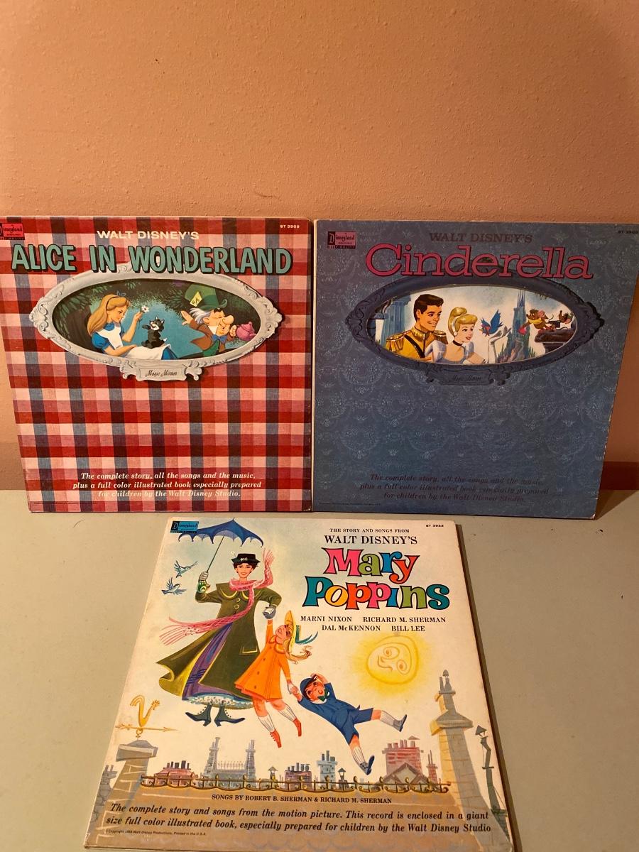 Walt Disney vintage album lot B, 1962. Alice in Wonderland, Cinderella, and Mary Poppins. They all have books inside the album covers. In fair condition. Alice in Wonderland has a few loose book pages. Albums in fair condition. Amazing graphics