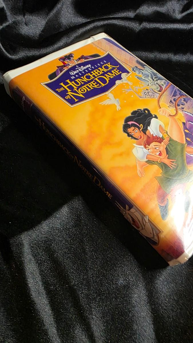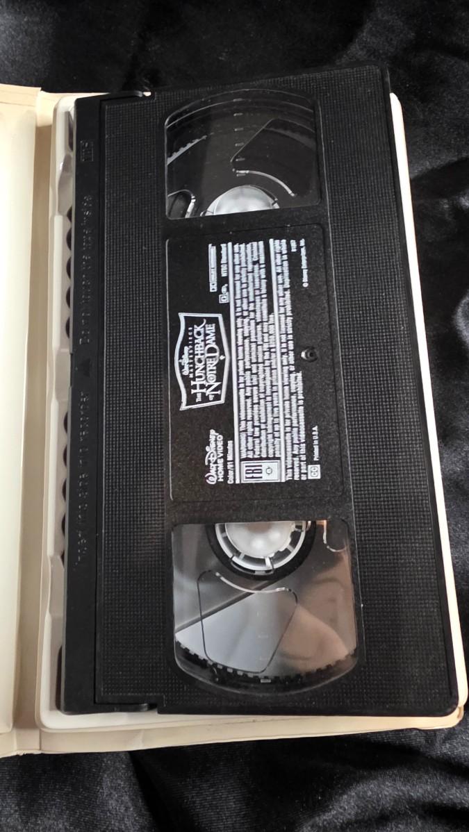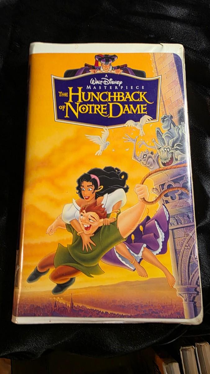 In the shadow of Notre Dame’s towering spires, where bells toll like the heartbeat of Paris and stained glass spills jeweled light across cobblestones, The Hunchback of Notre Dame VHS stands as a bold testament to Disney’s darkest fairy tale—Quasimodo swinging from the bell ropes, Esmeralda dancing in fiery defiance, Phoebus and Frollo locked in moral combat, the cover alive with the film’s dramatic palette of deep purples, golds, and gothic grandeur that dared to bring Victor Hugo’s tragedy to life. The iconic Masterpiece Collection banner gleams across the spine, the clamshell opening to reveal the original tape still nestled inside, ready to unleash “Out There,” “Hellfire,” and the soaring “God Help the Outcasts” that gave the 90s one of its most powerful soundtracks.