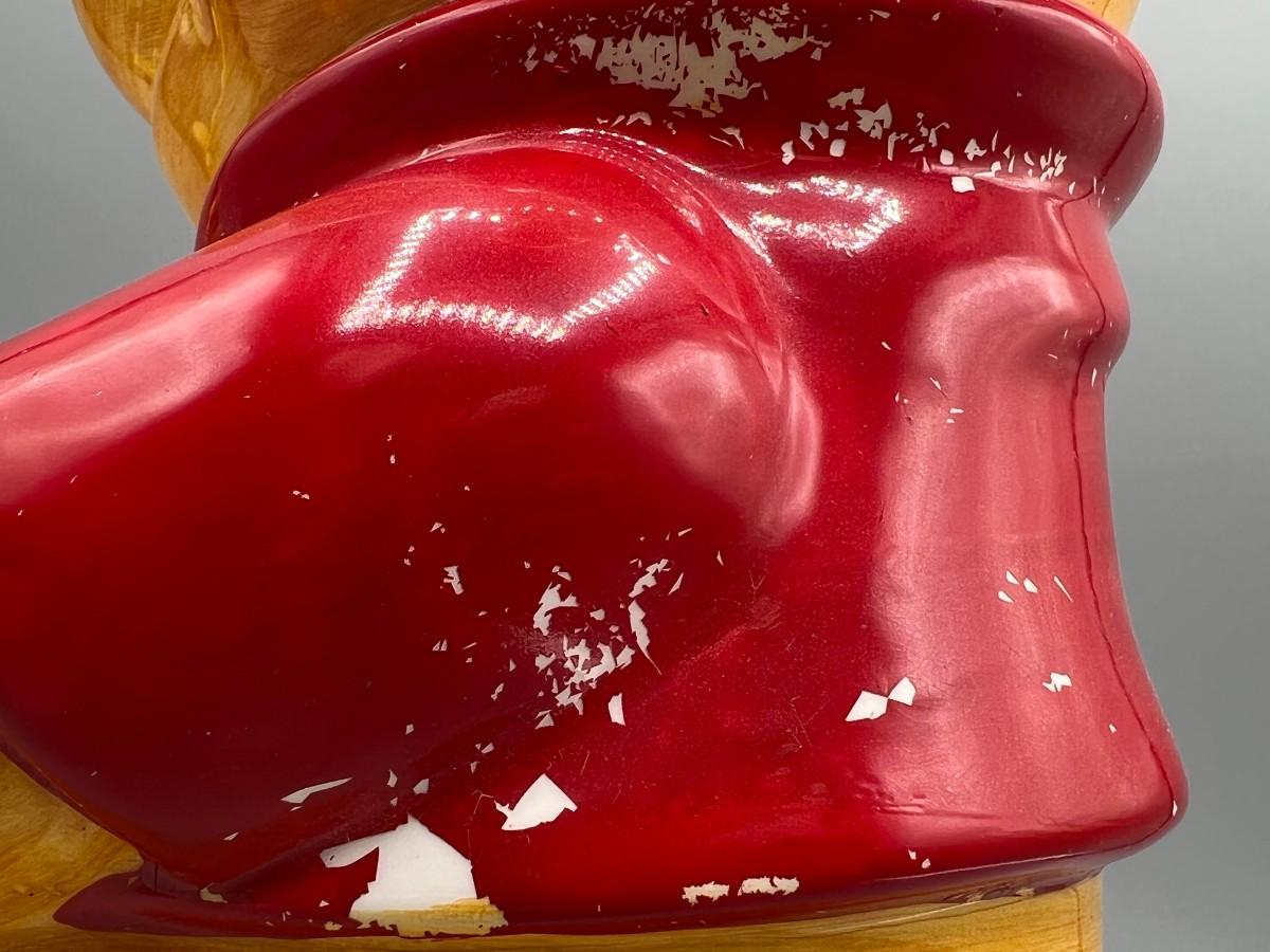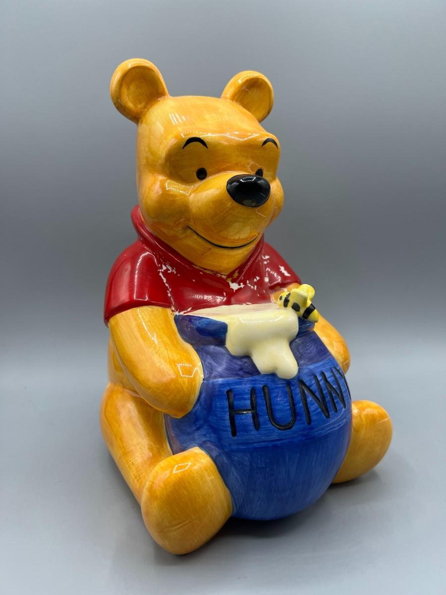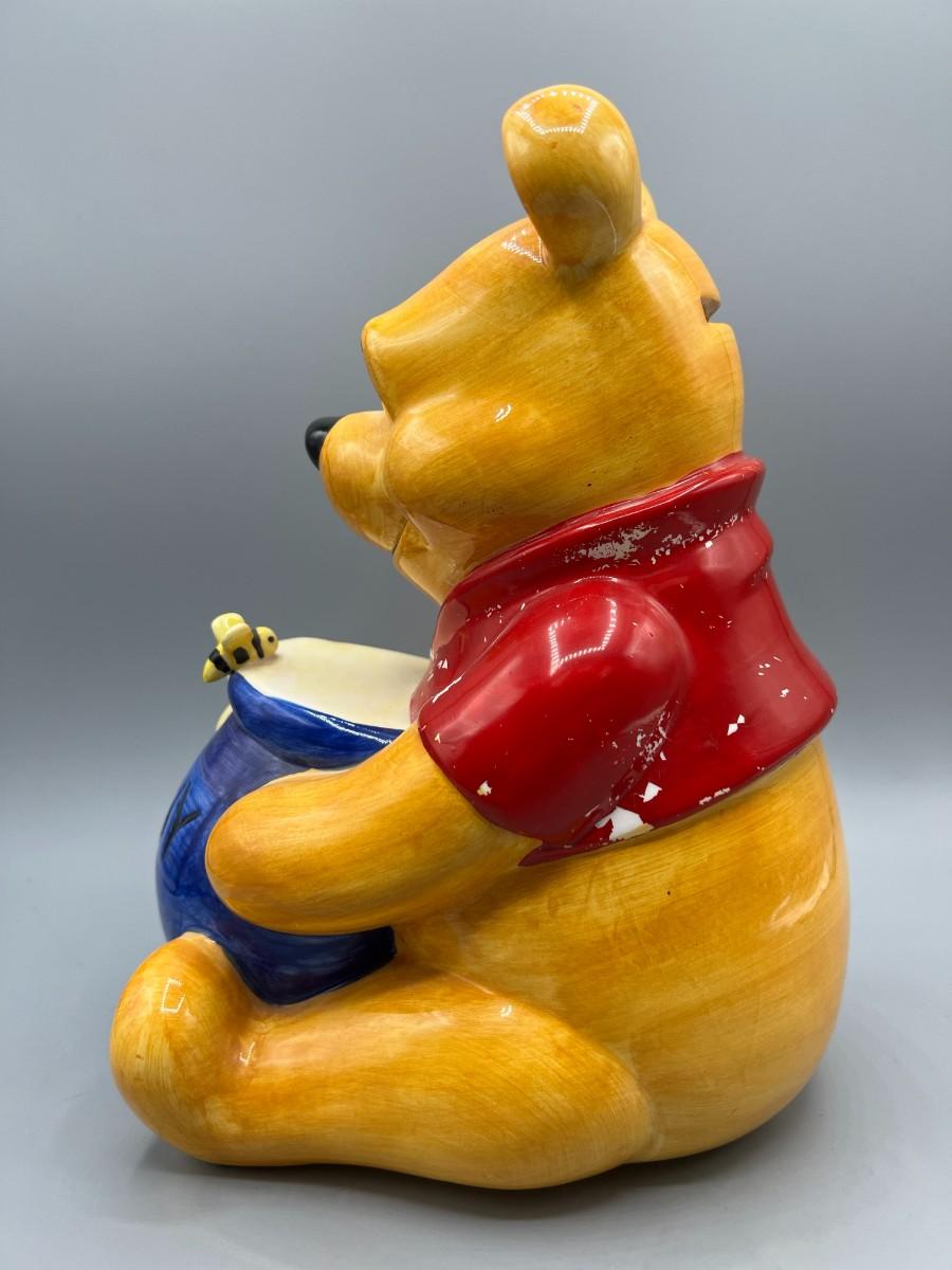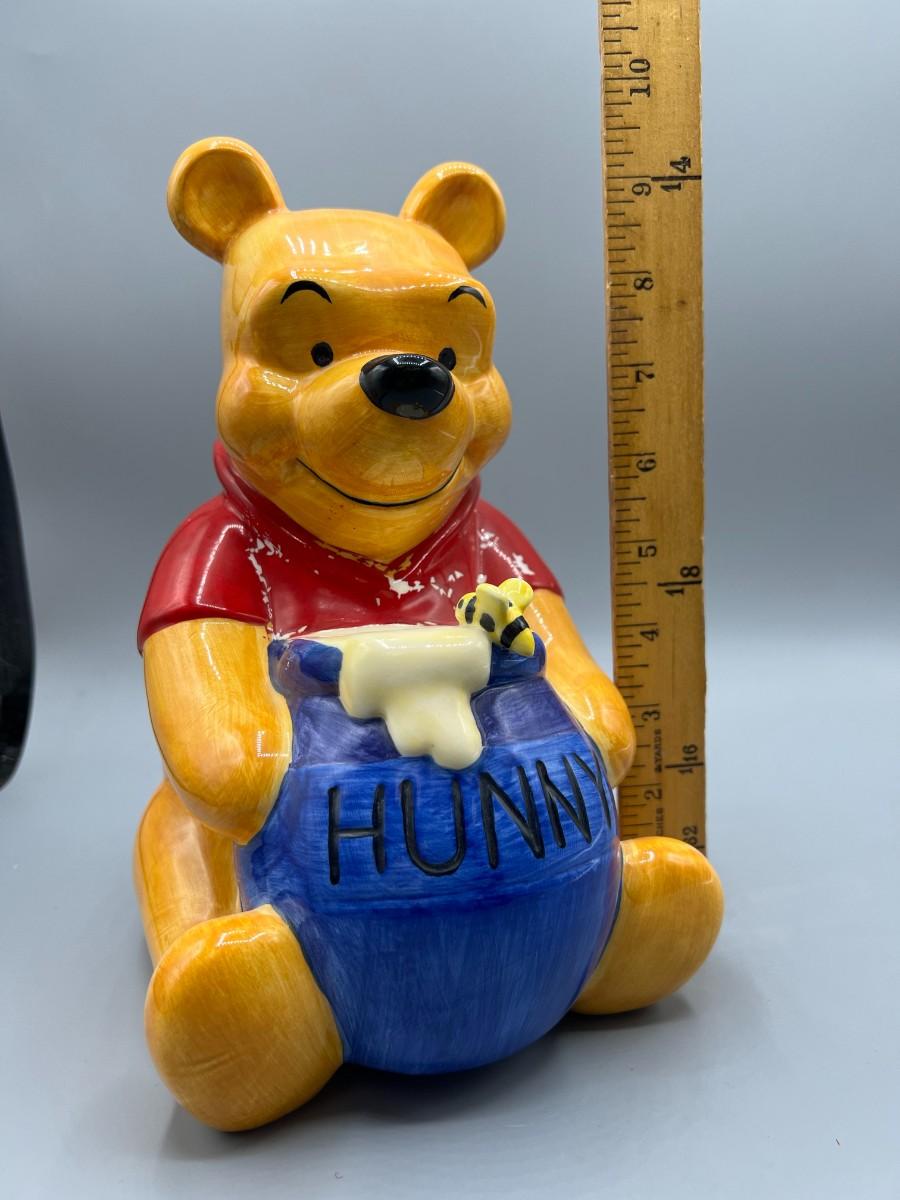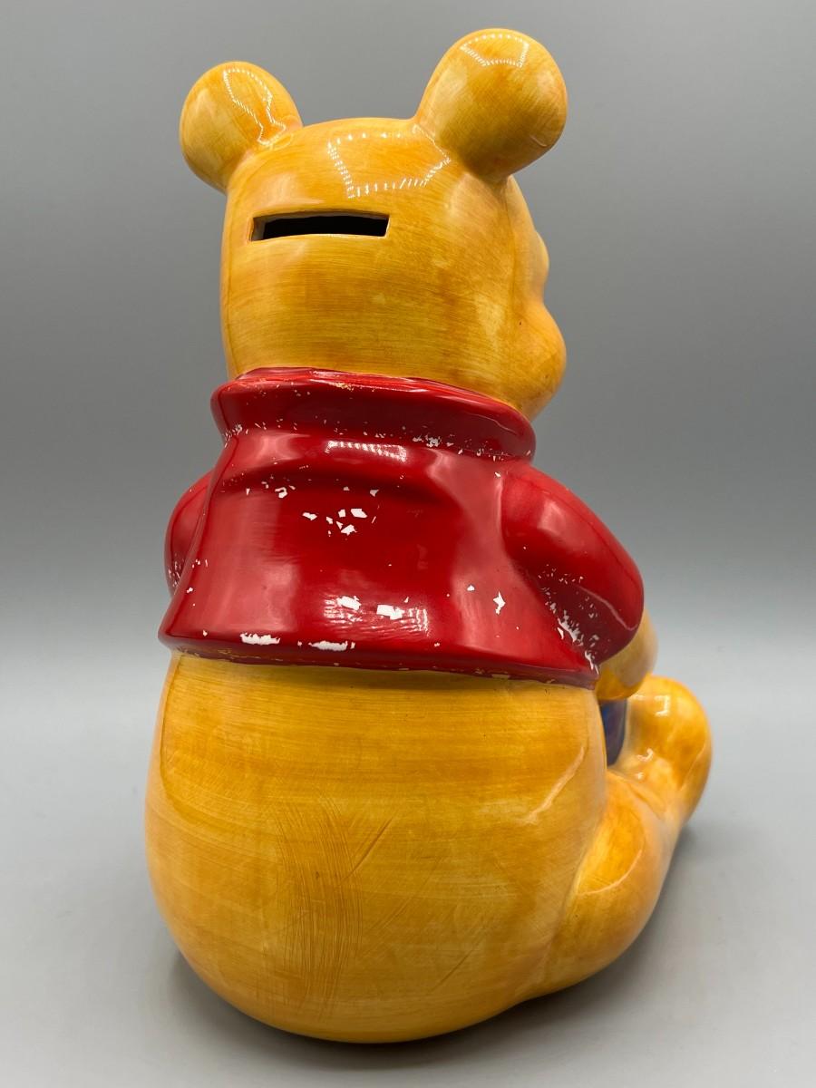 Walt Disney Winnie the Pooh coin bank. About 9" tall. Has rubber stopper but some chipping/flaking to paint.