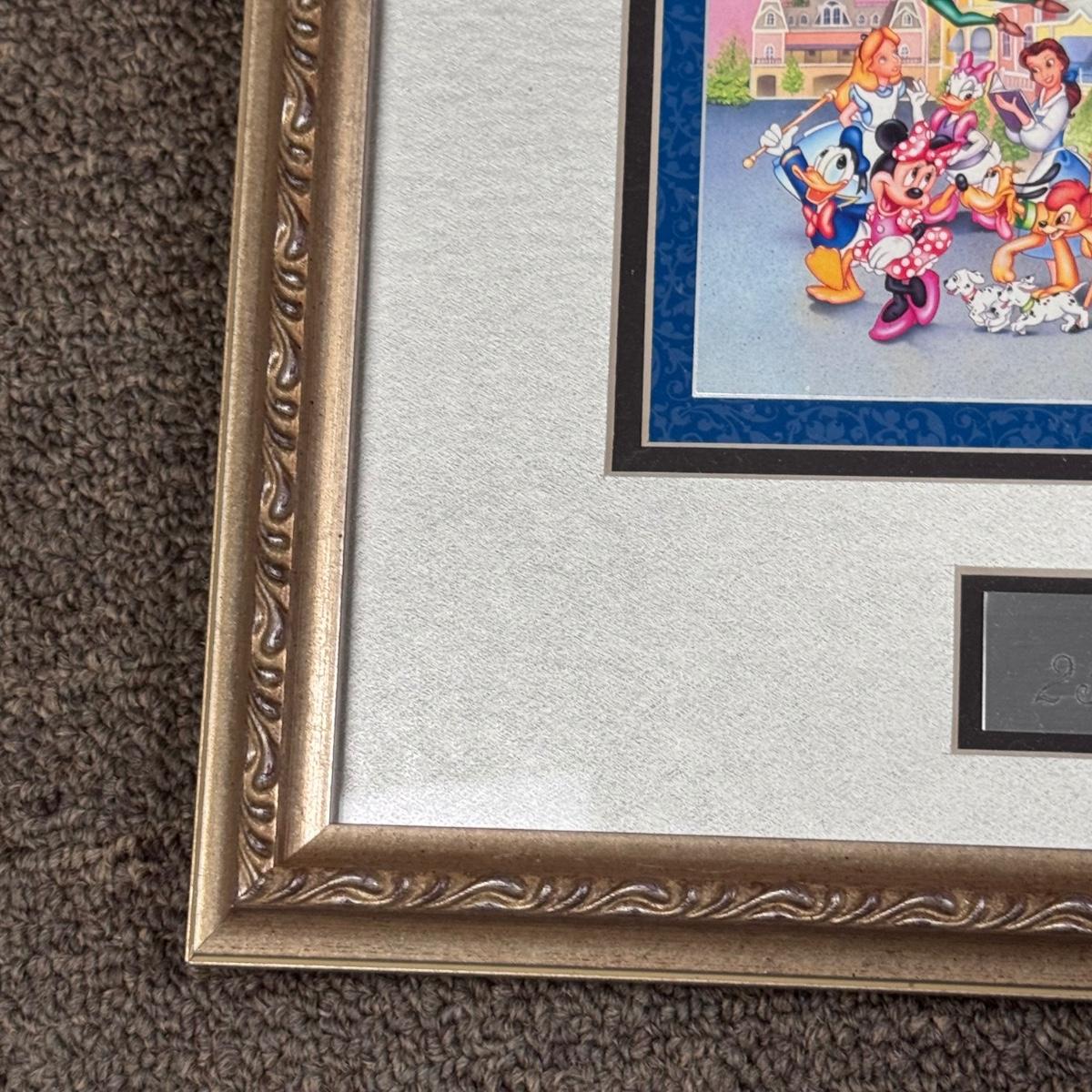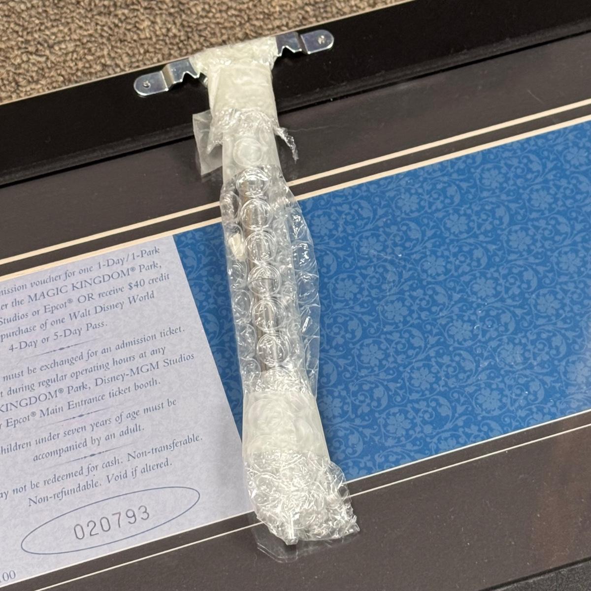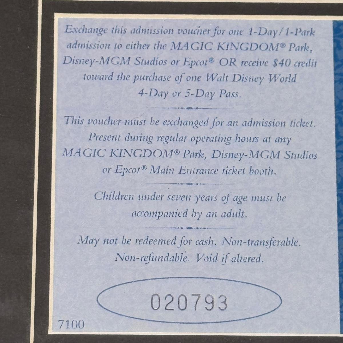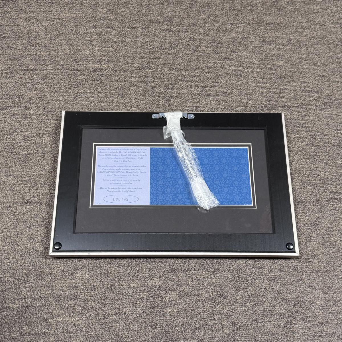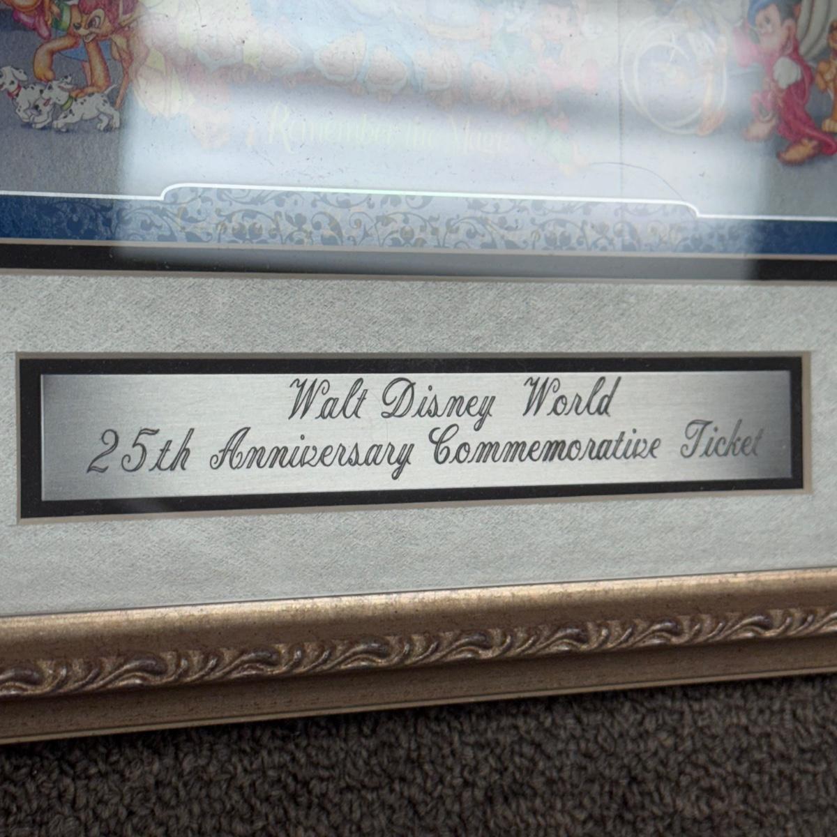Lot includes one framed Walt Disney World 25th anniversary commemorative ticket. The ticket is framed in a beautiful ornate frame made of wood with metallic paint. The frame measures 14” x 9”H. The ticket is protected with a layer of glass and double matting. There appears to be a pen sealed with tape and bubble wrap attached to the back of the frame - see picture included.