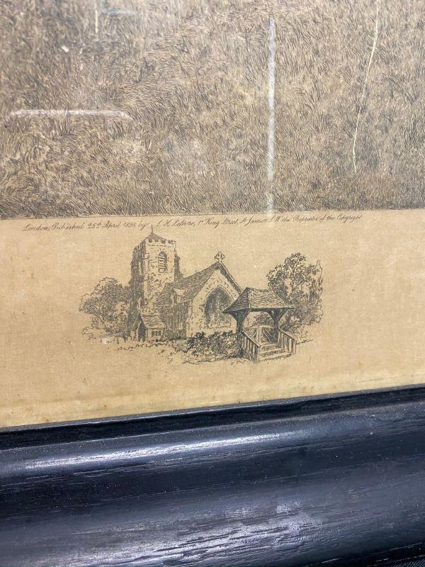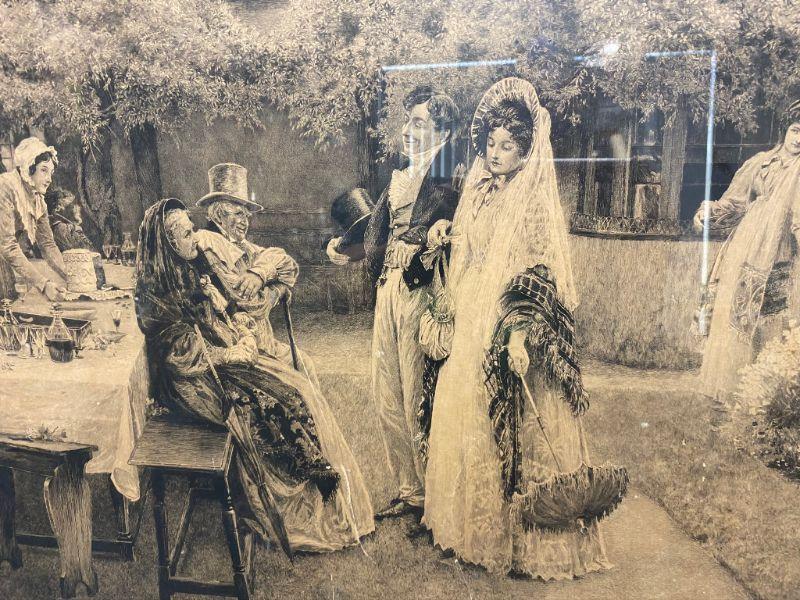W.H. Bouchar etching after the English genre painter Walter Dendy Sadler's painting entitled "Wedding Brunch" depicting a mid wedding ceremony of a young beautiful couple. Etching was printed in April of 1898 published by L.H. Leferve, King Street, Copyright Registered by the British Art Publishers Union Limited New York Printed in London by T Brooker & Co. This