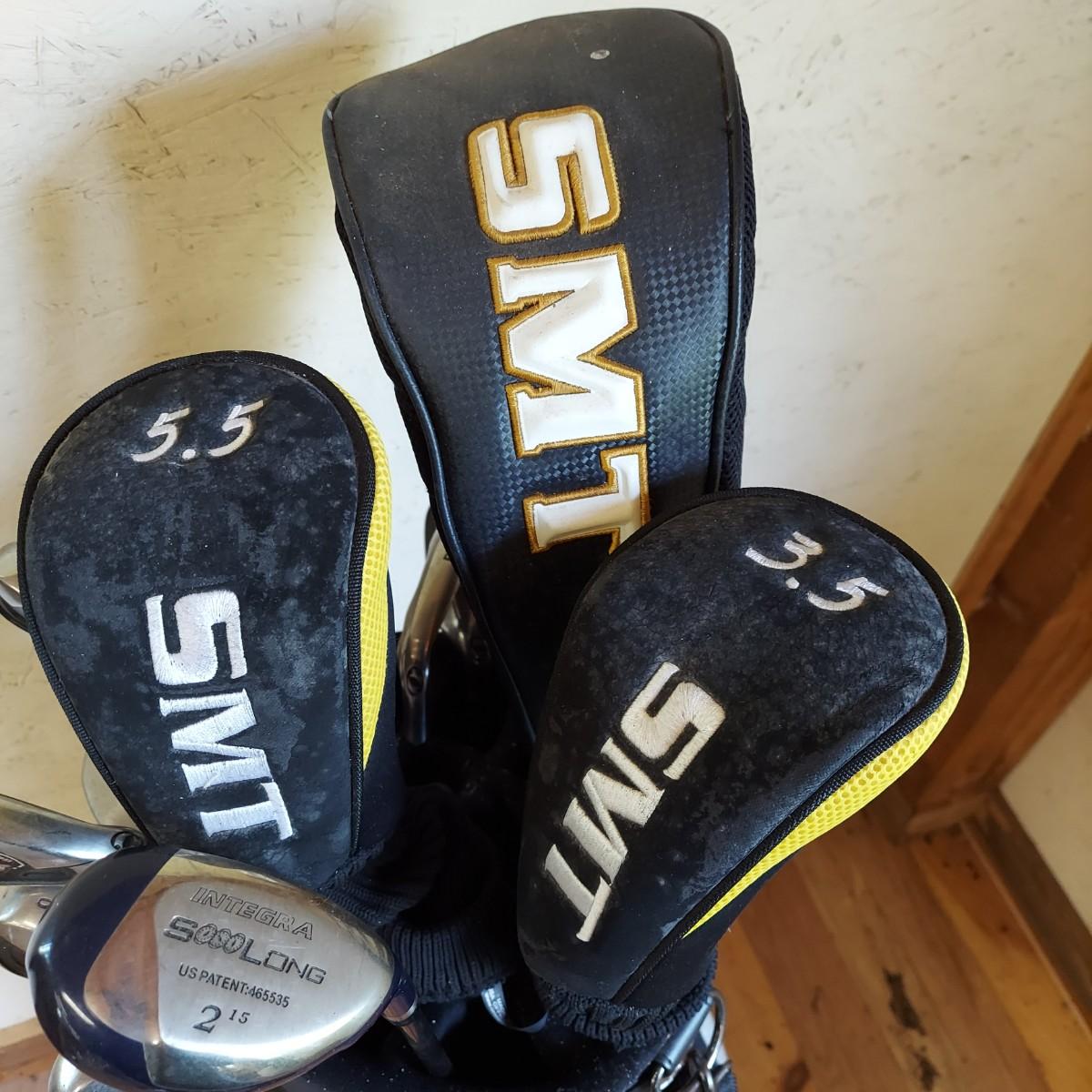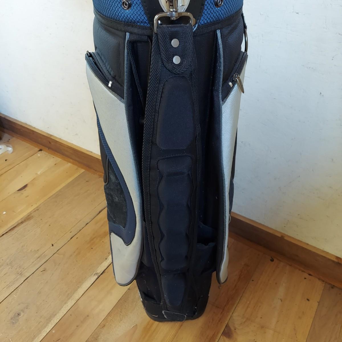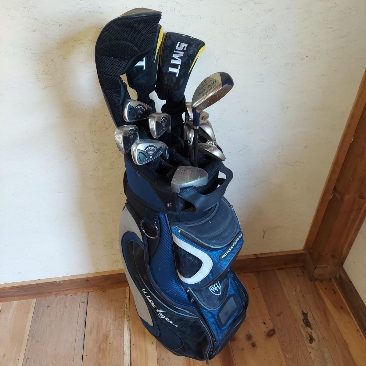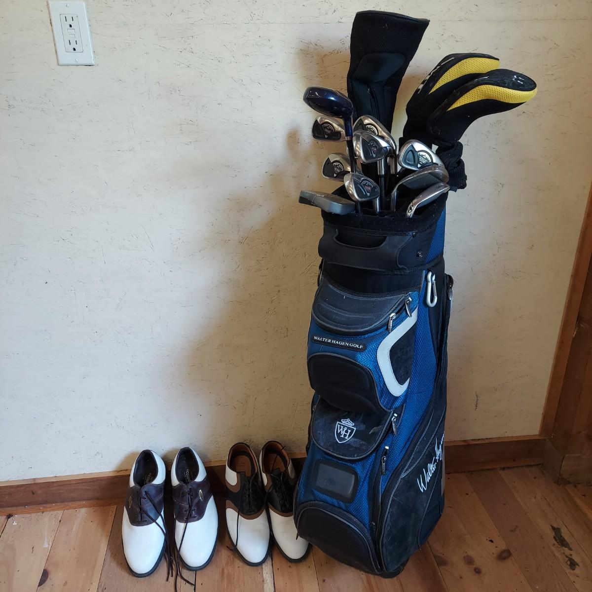 Walter Hagen golf bag with many Balistik clubs. There are four woods and nine iron. The sand wedge is shortest with a shaft length of 33" long. The eight wood is the longest with a shaft length of 41". There are also two pair of gold shoes included. A pair of Nike Golf shoes size nine. And a pair of Foot Joys in size 9w. Local Pickup Only.