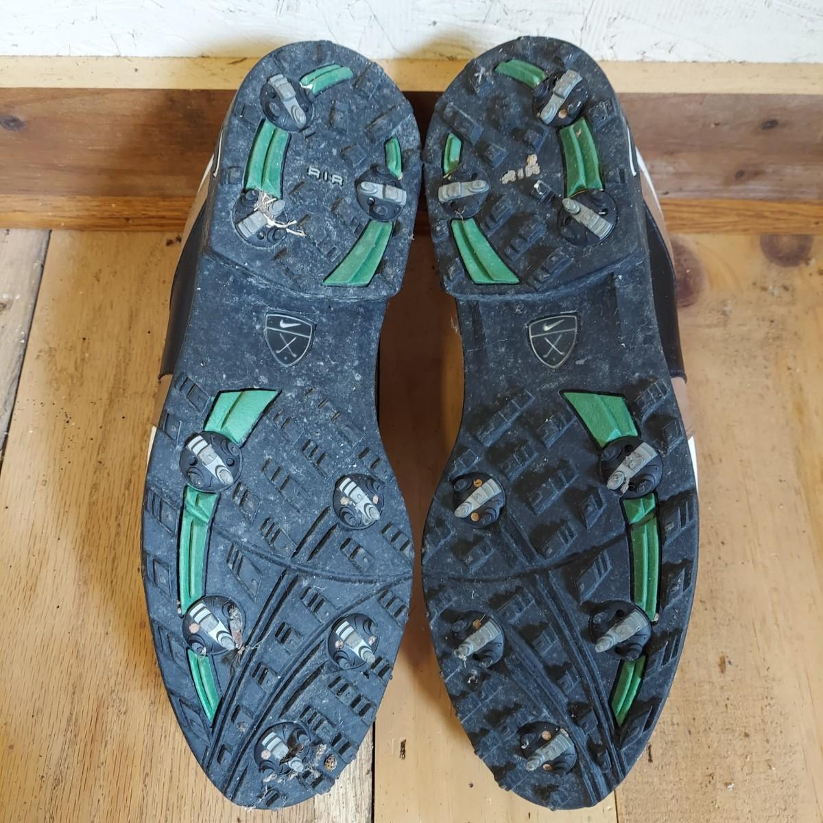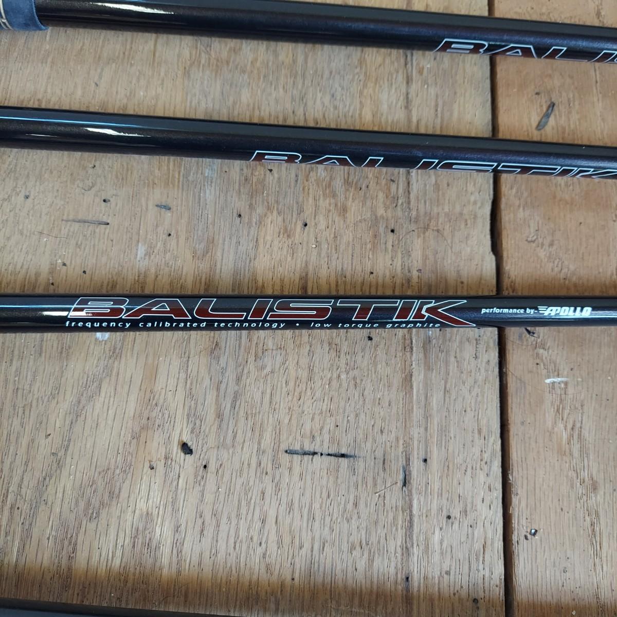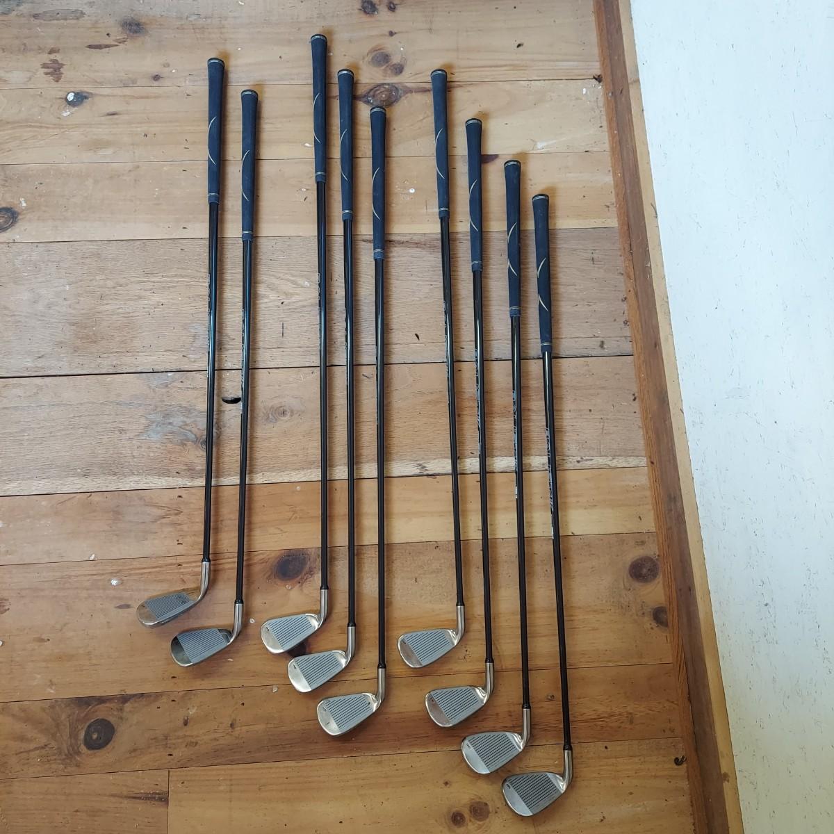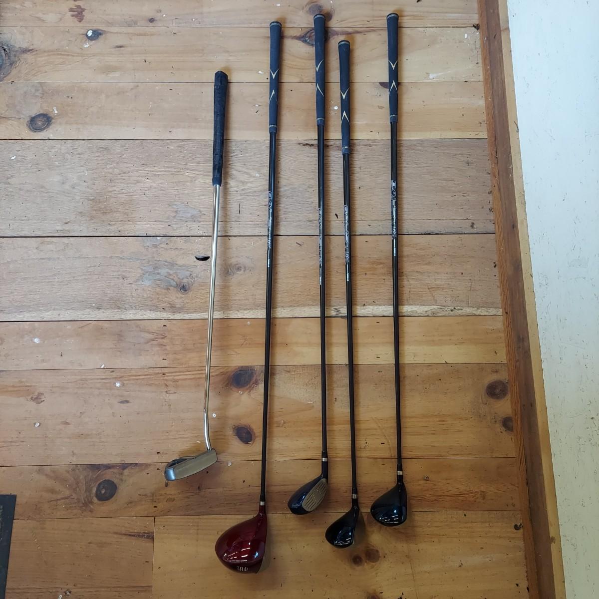 Walter Hagen golf bag with many Balistik clubs. There are four woods and nine iron. The sand wedge is shortest with a shaft length of 33" long. The eight wood is the longest with a shaft length of 41". There are also two pair of gold shoes included. A pair of Nike Golf shoes size nine. And a pair of Foot Joys in size 9w. Local Pickup Only.