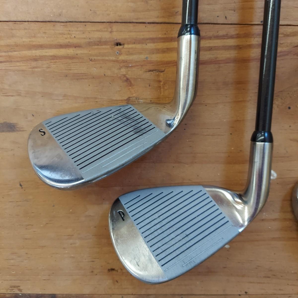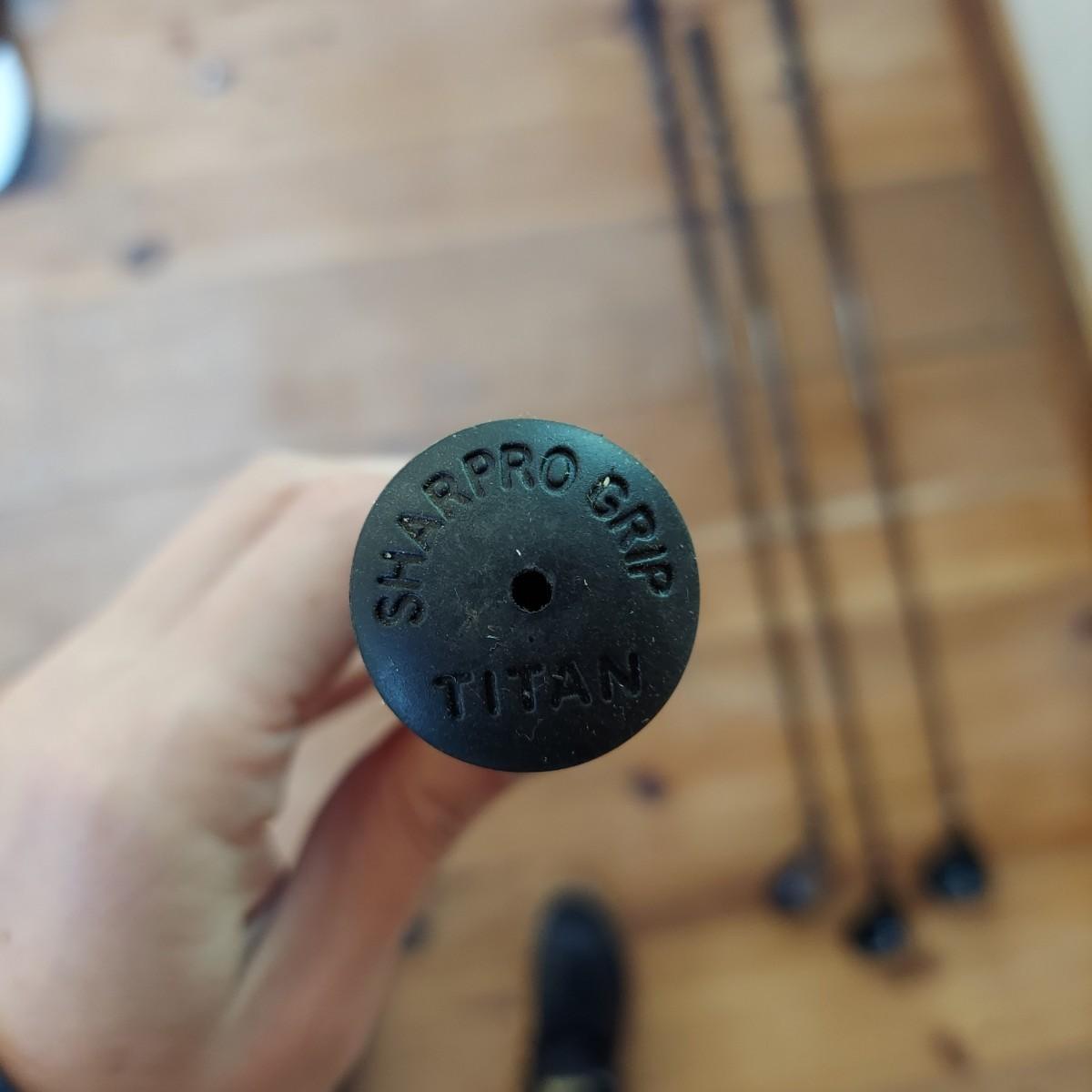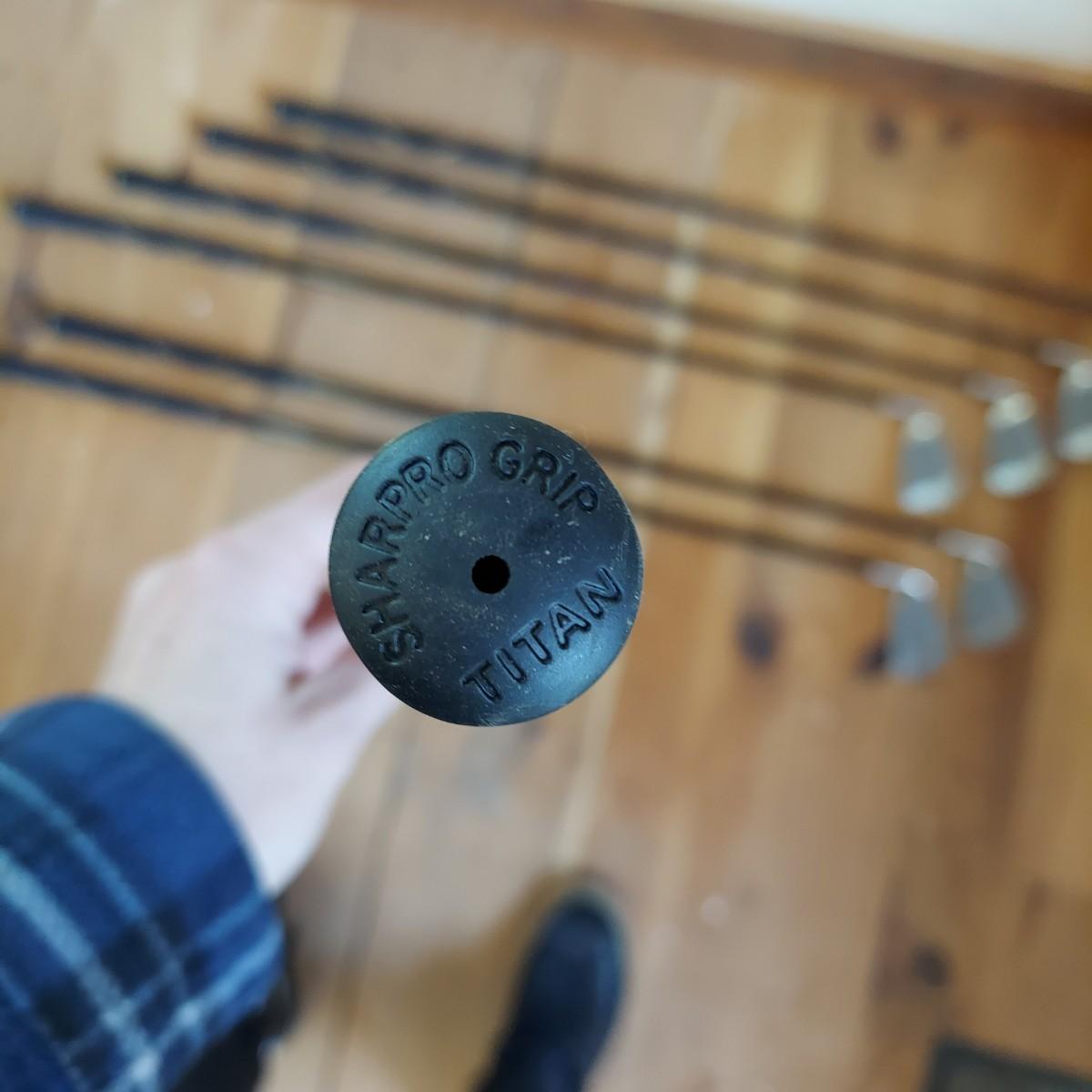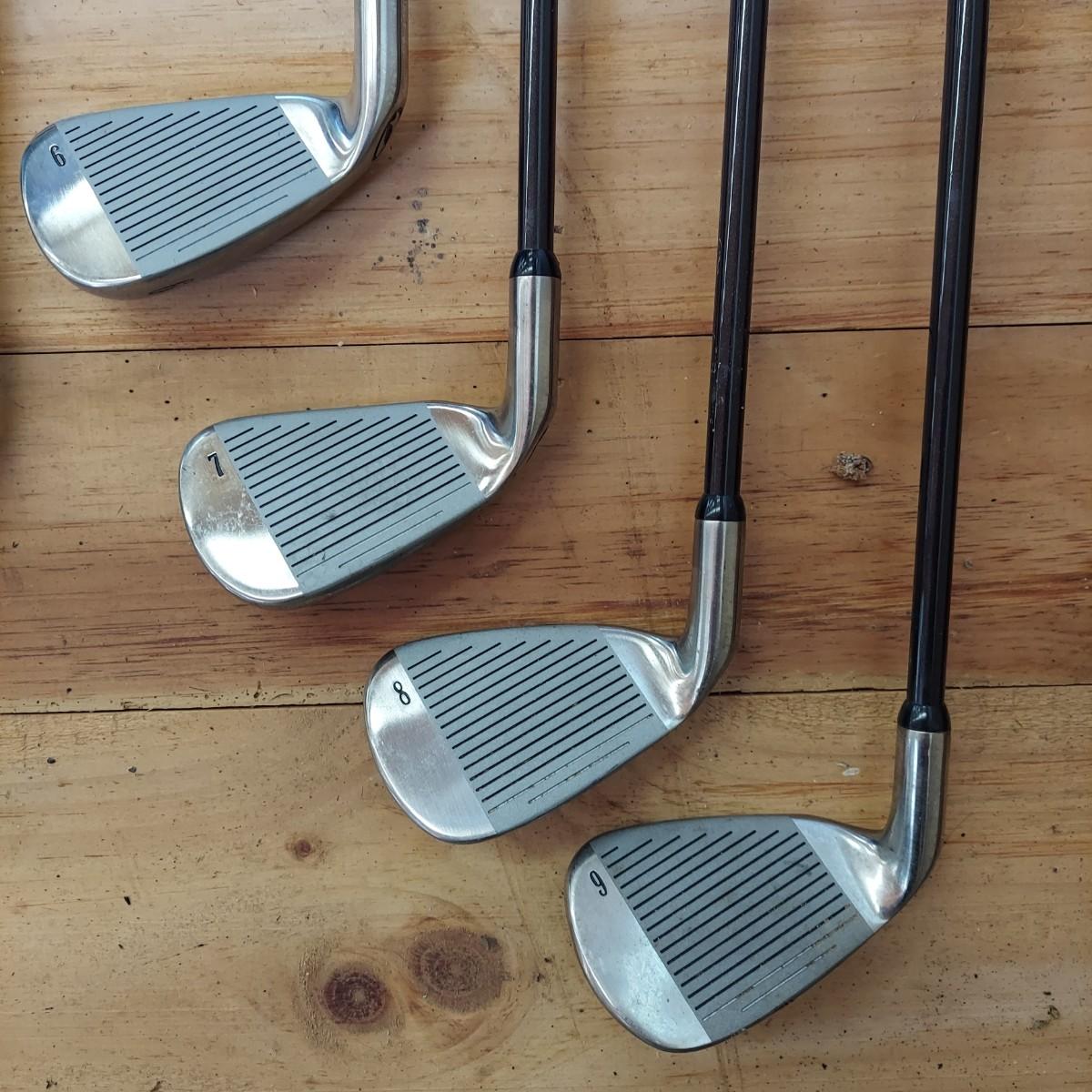Walter Hagen golf bag with many Balistik clubs. There are four woods and nine iron. The sand wedge is shortest with a shaft length of 33" long. The eight wood is the longest with a shaft length of 41". There are also two pair of gold shoes included. A pair of Nike Golf shoes size nine. And a pair of Foot Joys in size 9w. Local Pickup Only.
