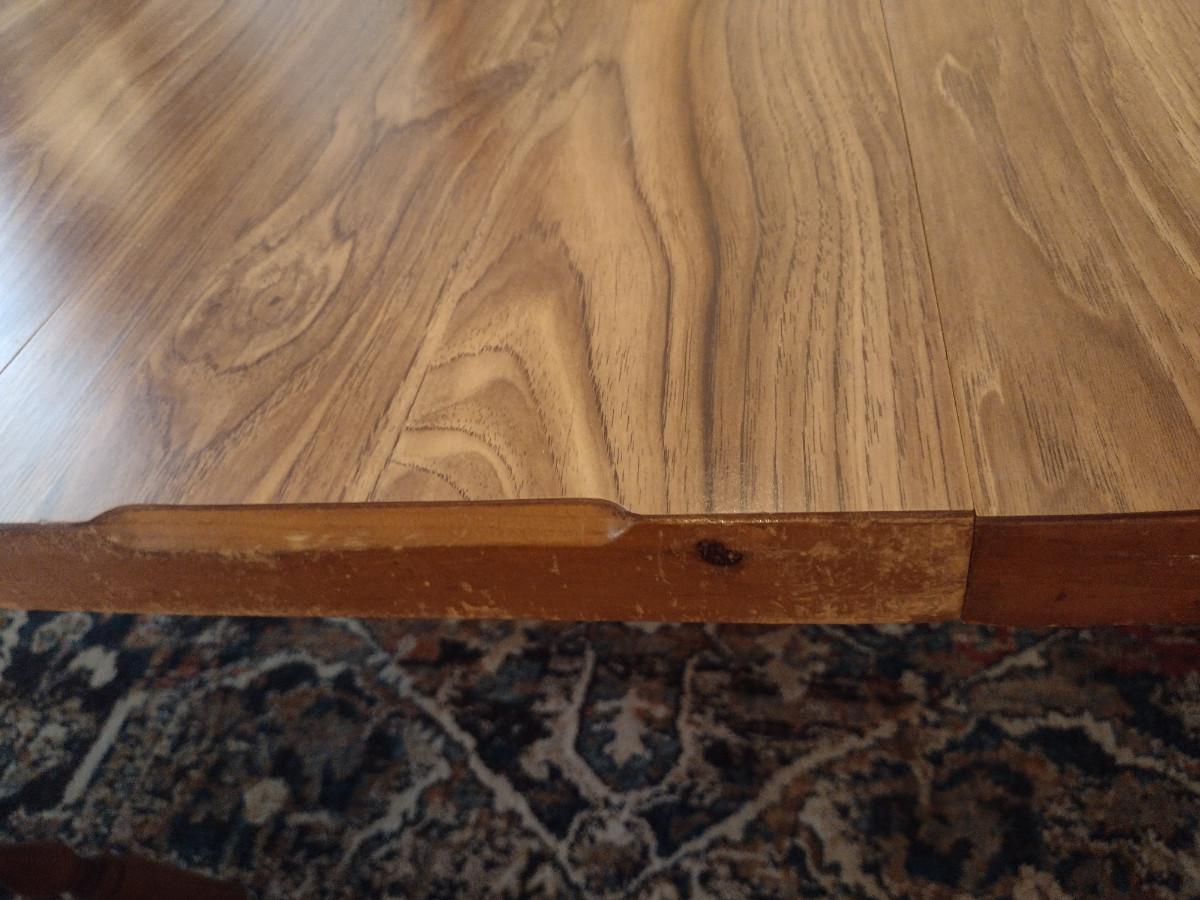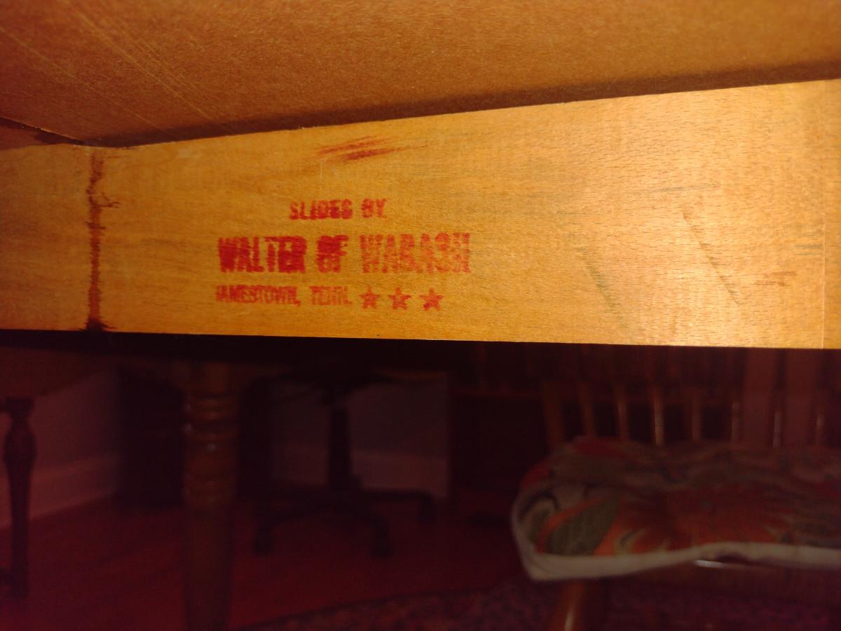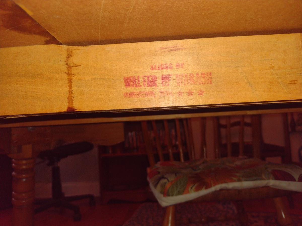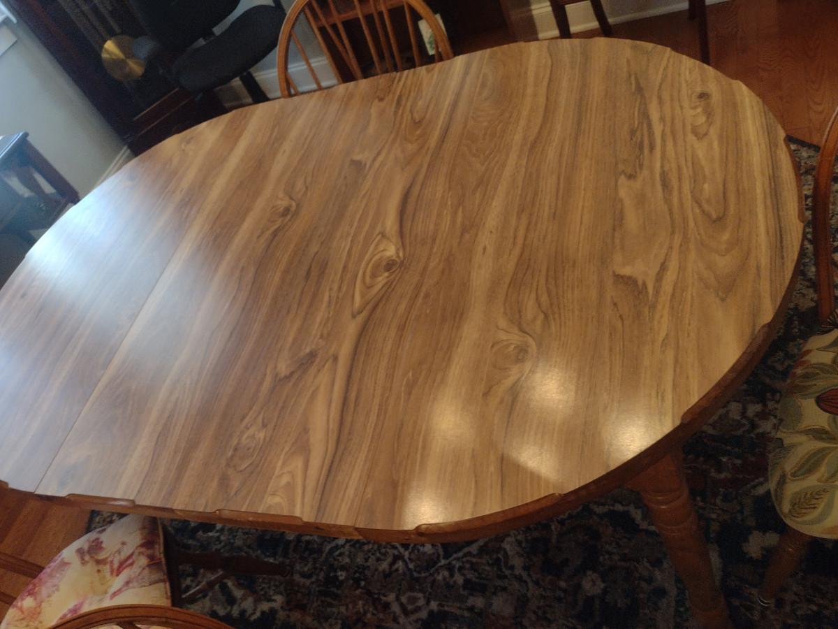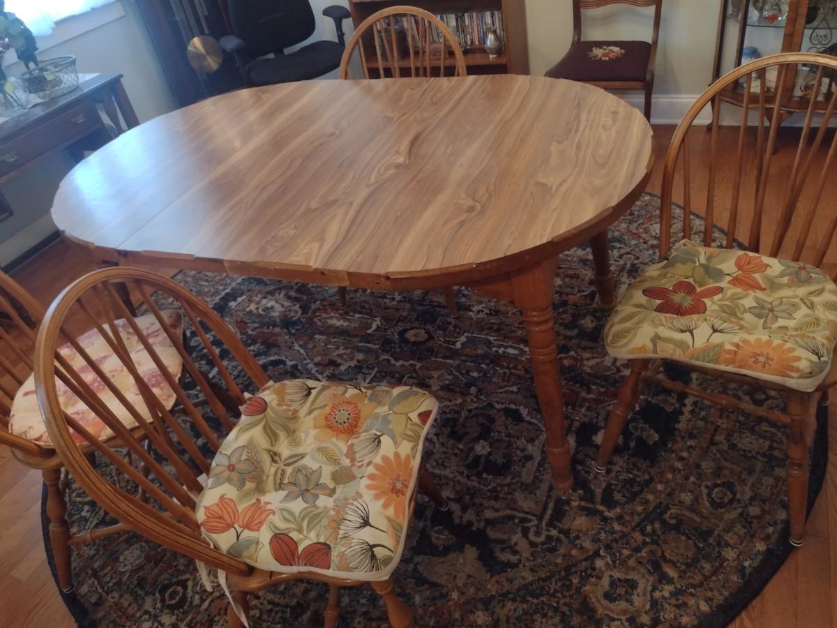 Walter of Wabash Laminate Topped Wooden Dining Table with Four Chairs. Item measures approx 64" long x 41" wide x 29" tall when fully extended with both 11 3/4" leaves. Chairs have damage to bottom stretchers.