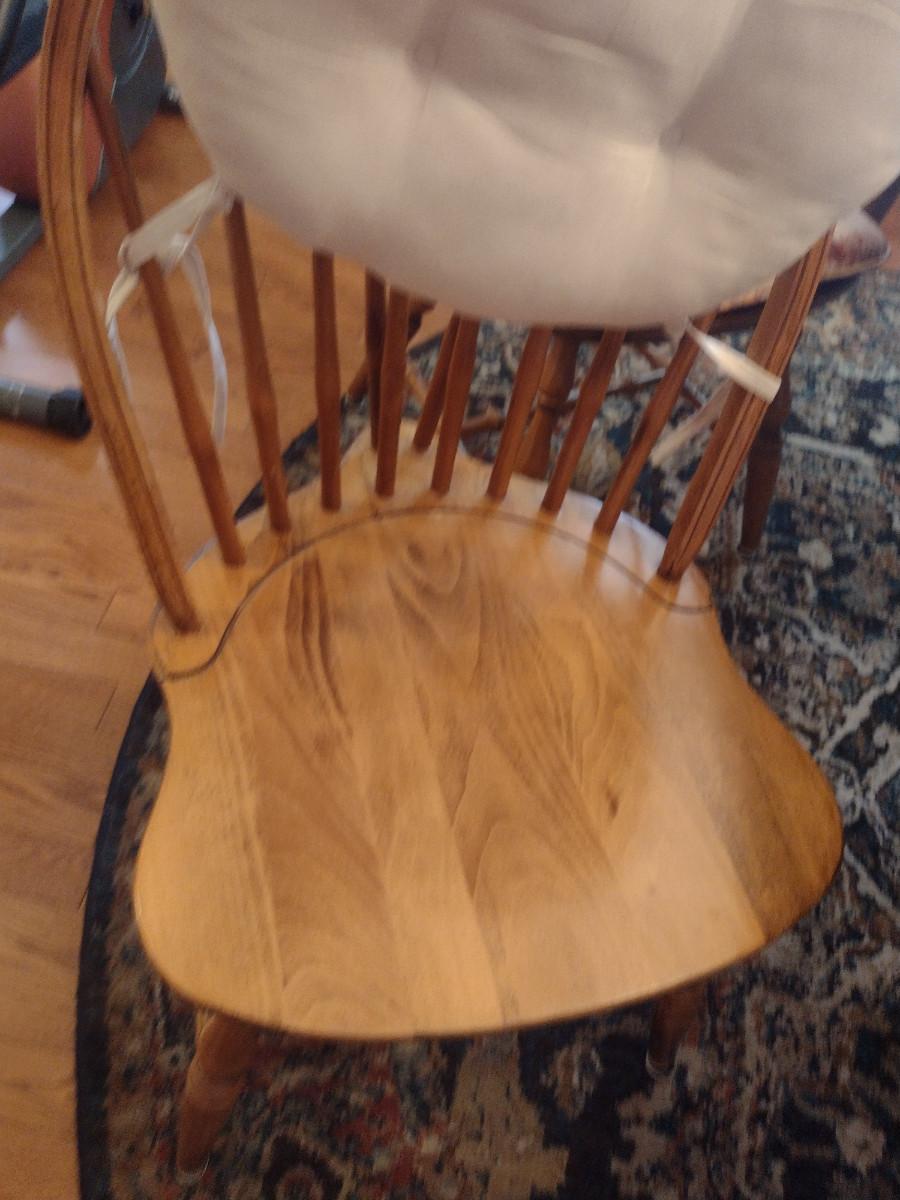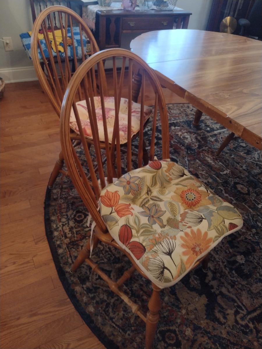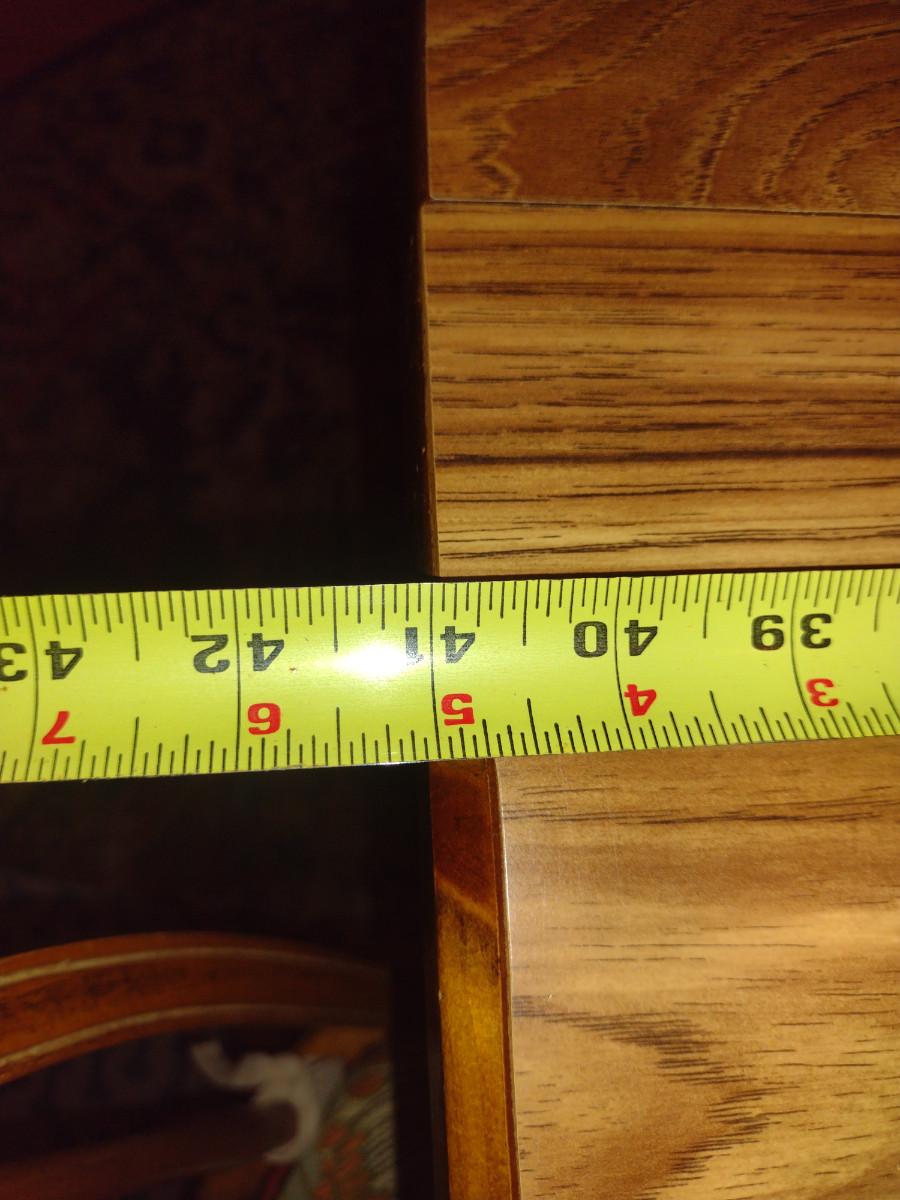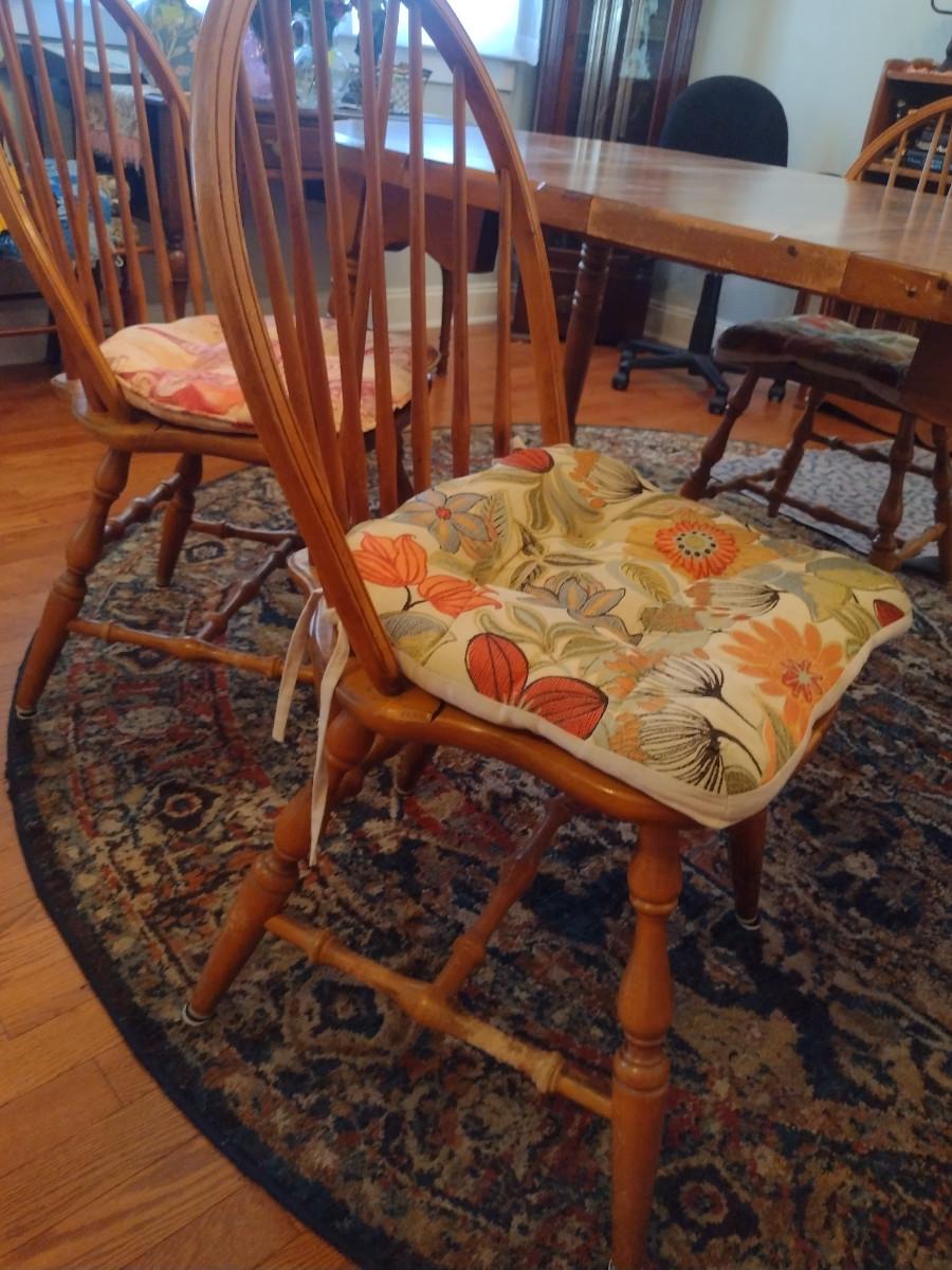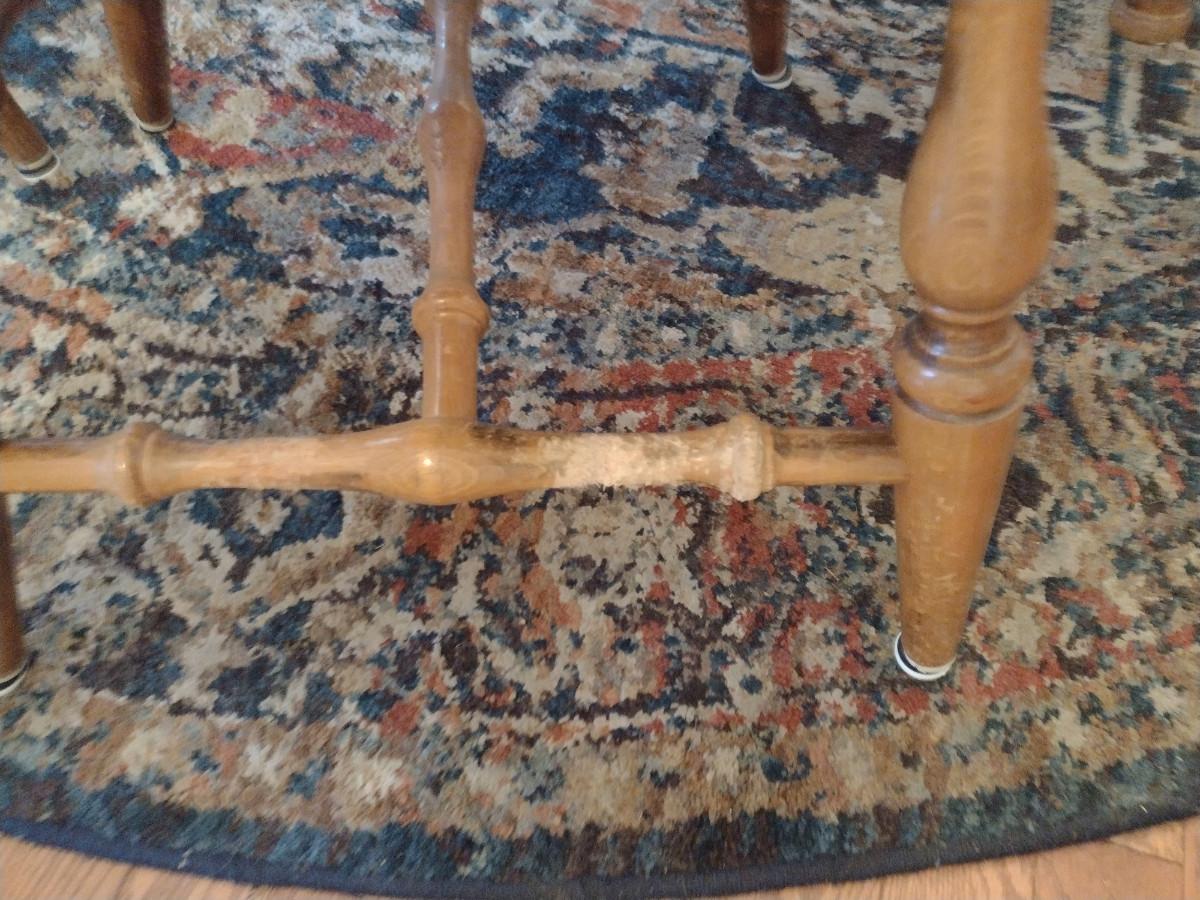 Walter of Wabash Laminate Topped Wooden Dining Table with Four Chairs. Item measures approx 64" long x 41" wide x 29" tall when fully extended with both 11 3/4" leaves. Chairs have damage to bottom stretchers.