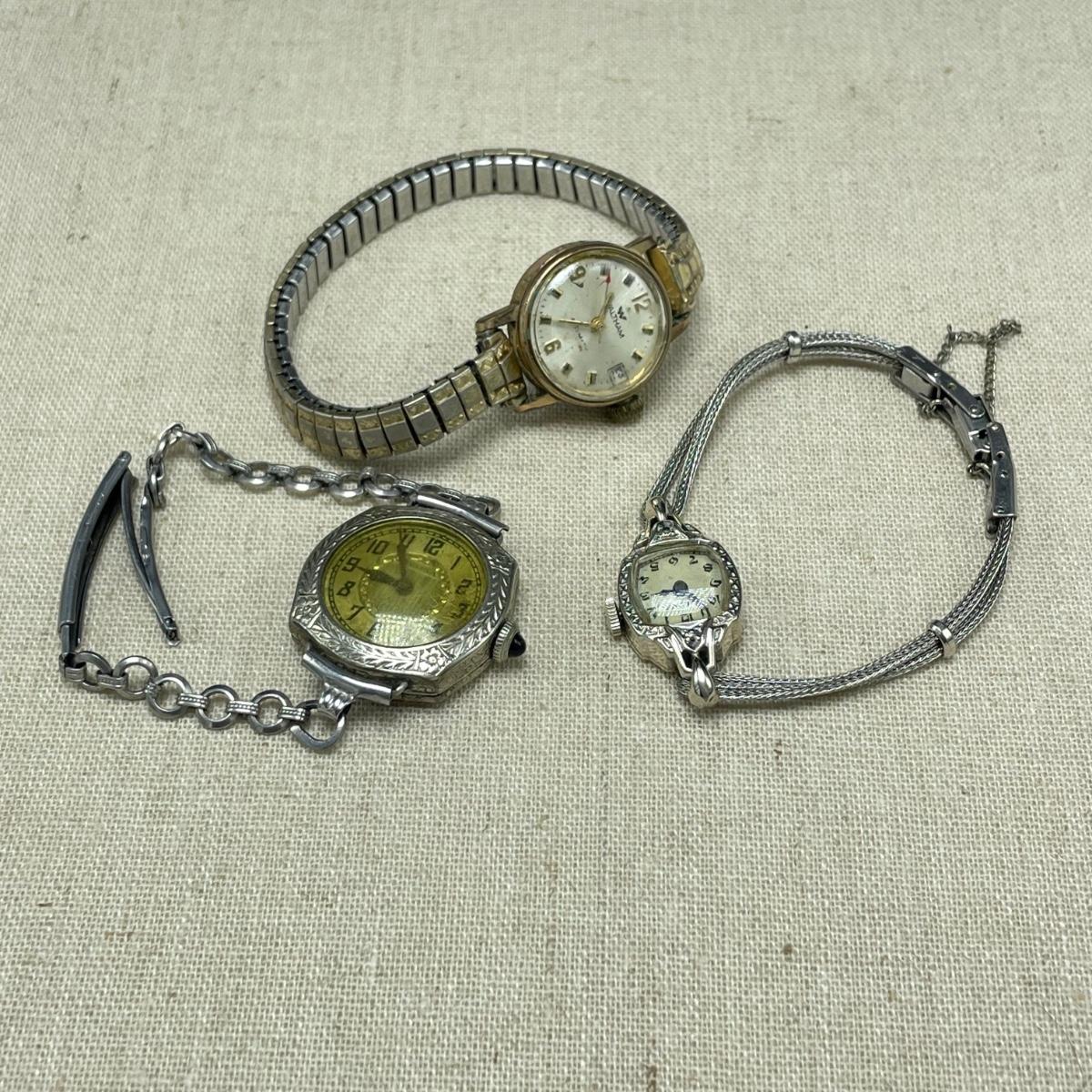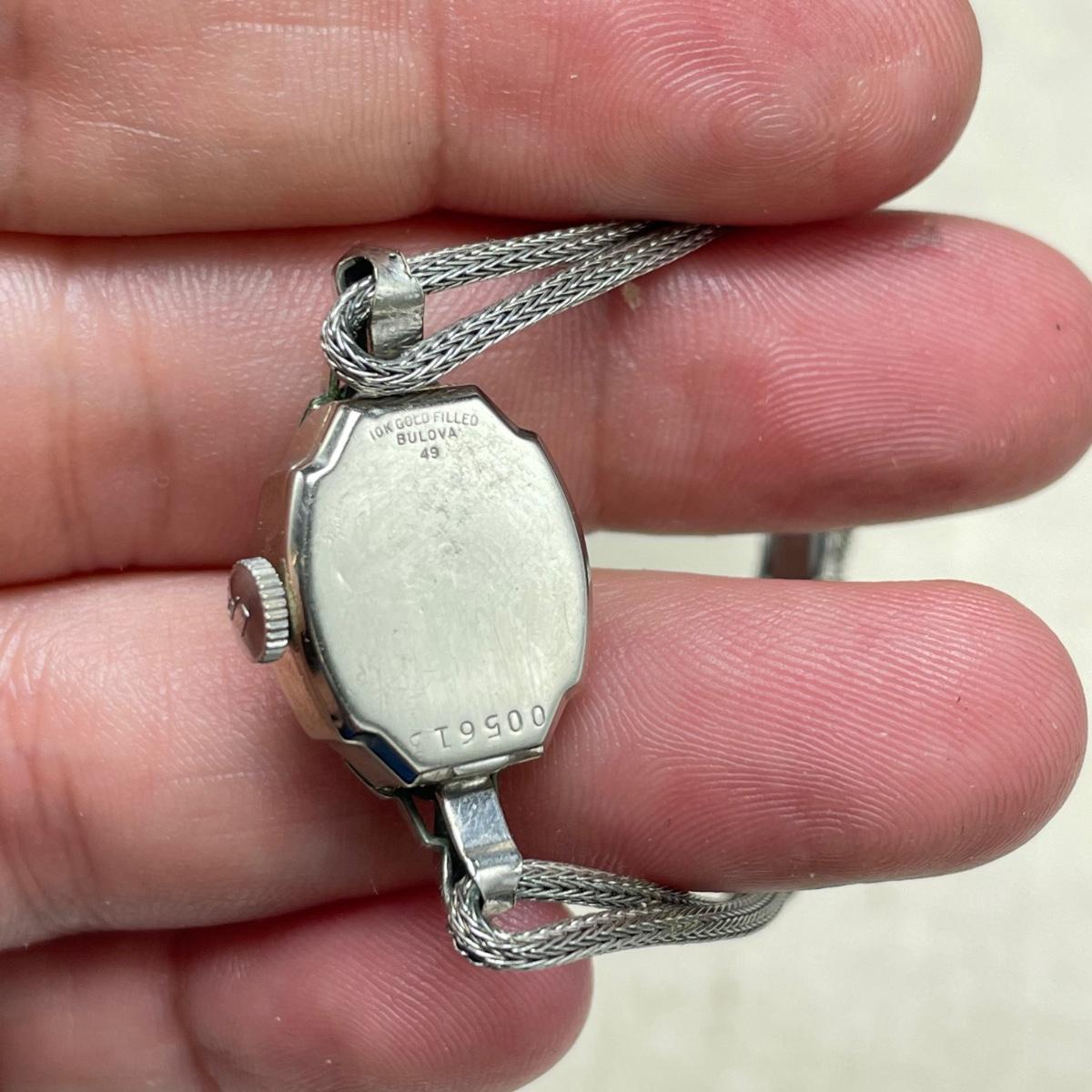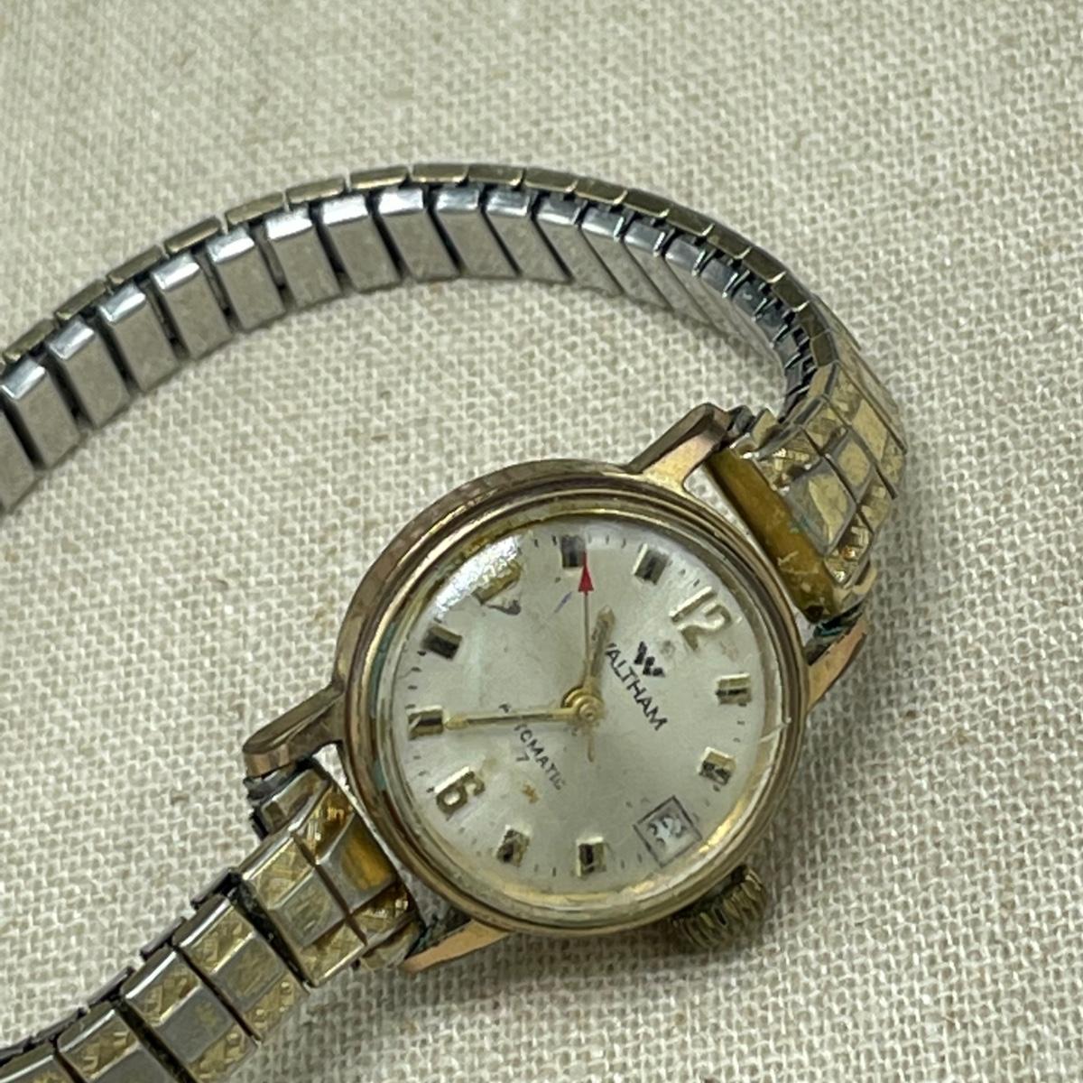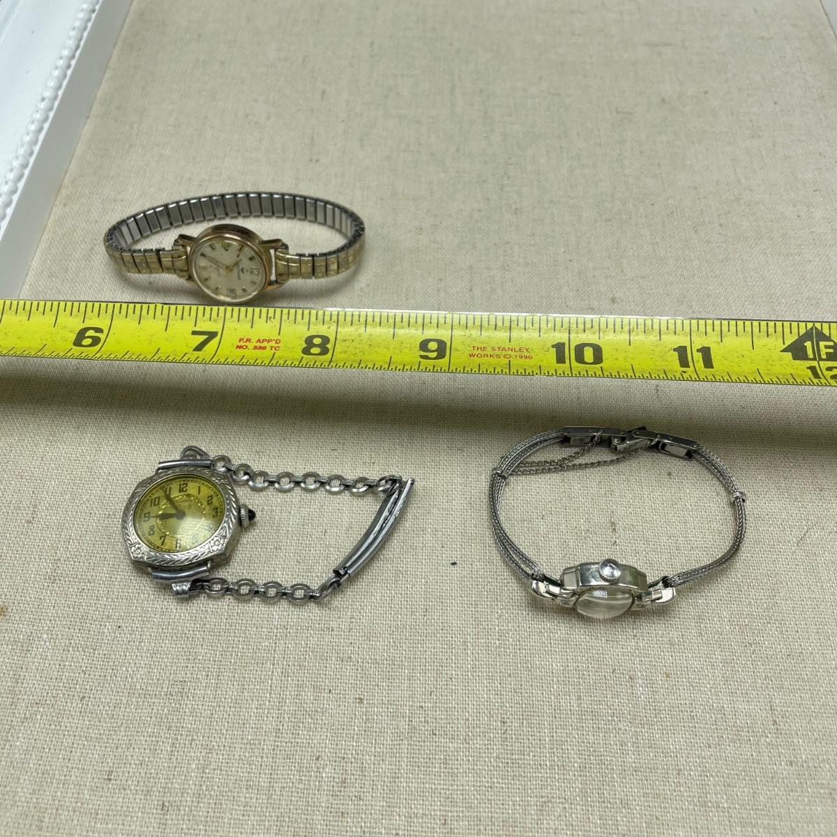 Three vintage watches. Two are Bulova and one with a metal elastic band is Waltham. All three have not been tested and probably need new batteries. The two Bulova watches are clasped and will currently fit a petite wrist. These two also need repairs to the clasps, they do not currently close completely. See images. Shipping available.