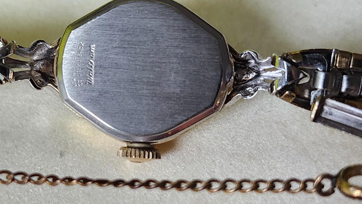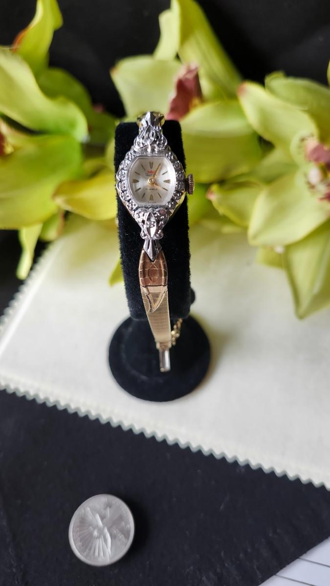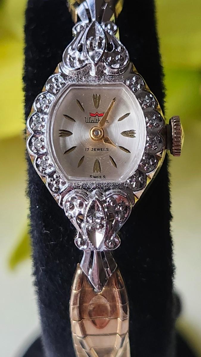 17 Jewel, Swiss made, 10KRGP, diamonds surround the gold-tone dial. Manual wind. It is working.