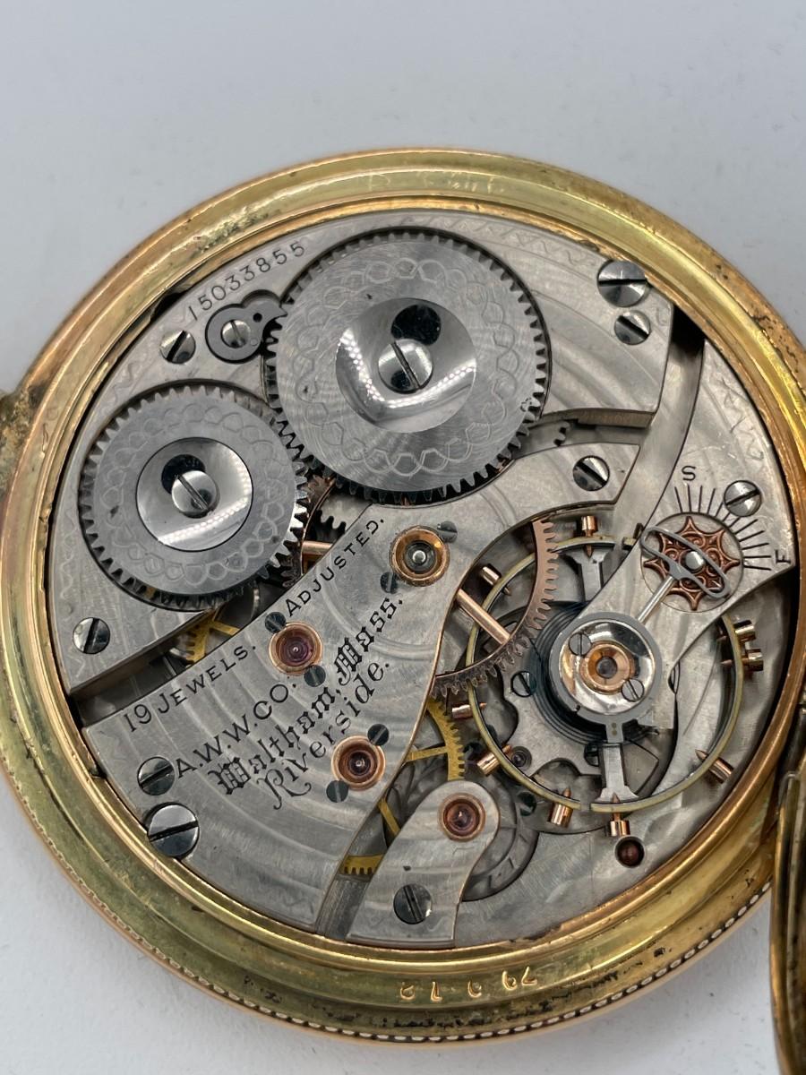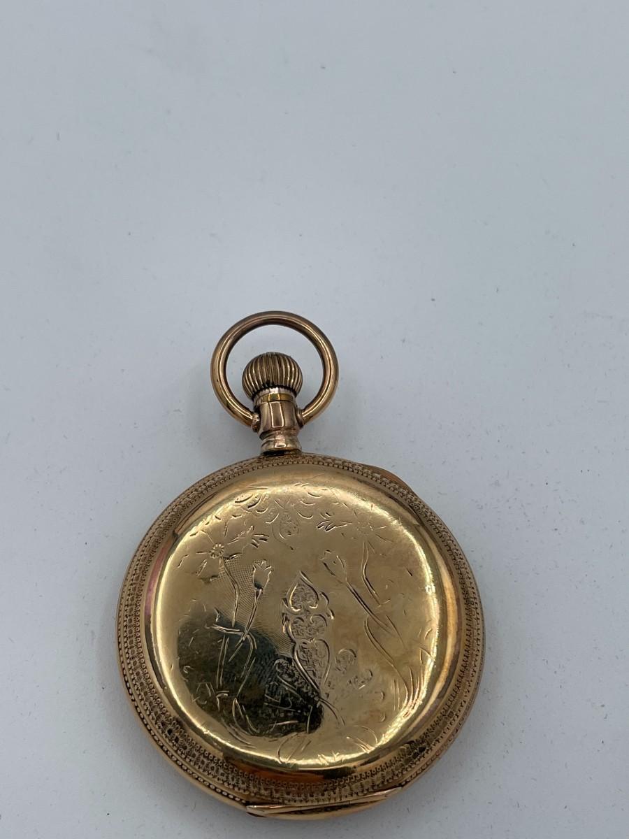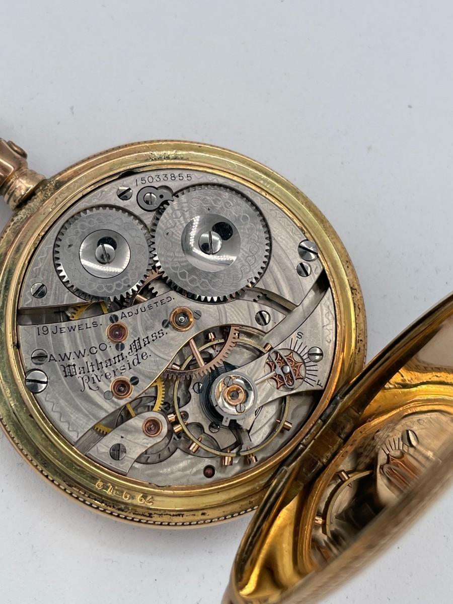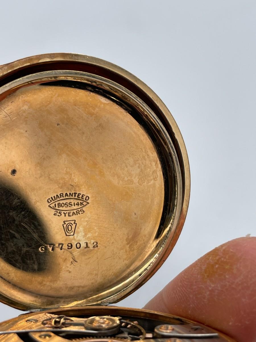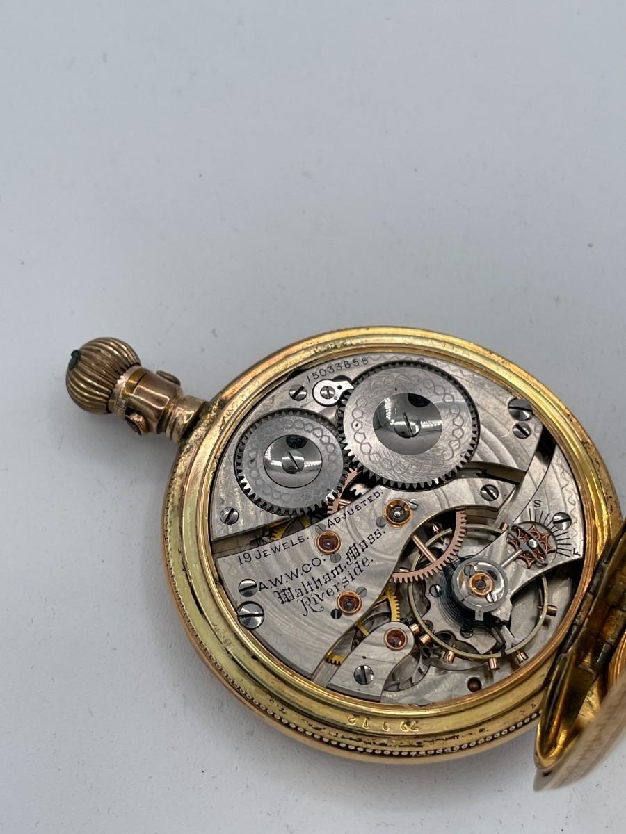 A.W.W.Co. Waltham Pocket Watch, No. (15033855), Size 16s, Prod Yr 1906, 19 Jewels. Case: Keystone No. 6779012, Jboss 14k Guar. 25 Yrs. Condition - Winder & watch are in working order. This is not a guarantee that all parts are original nor is the watch autheniticated.