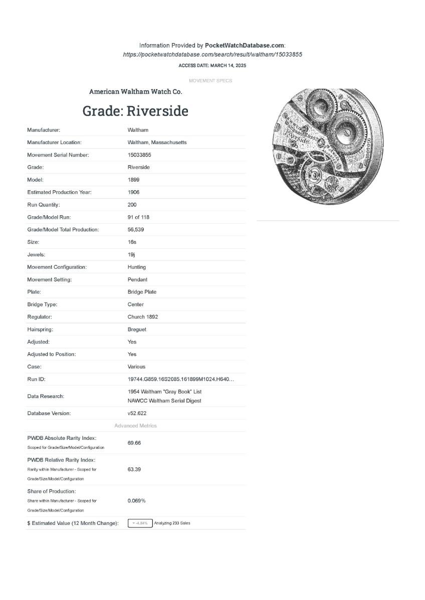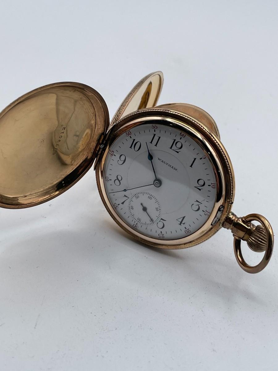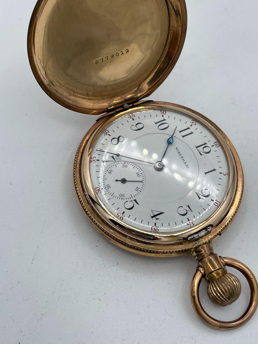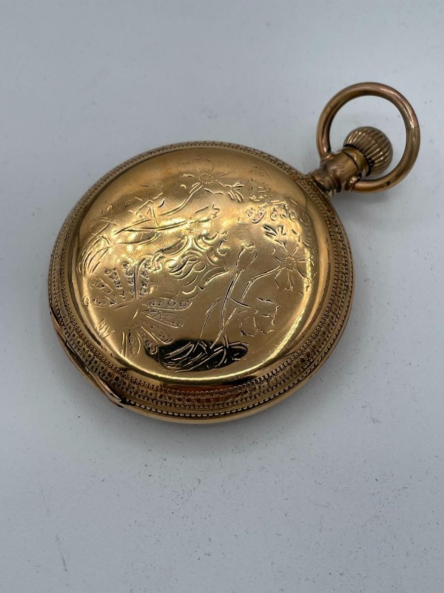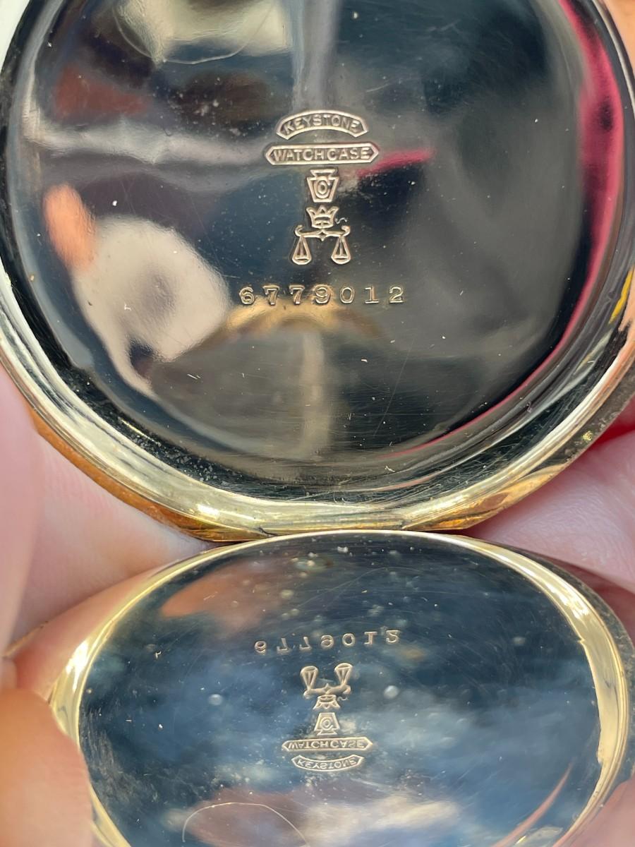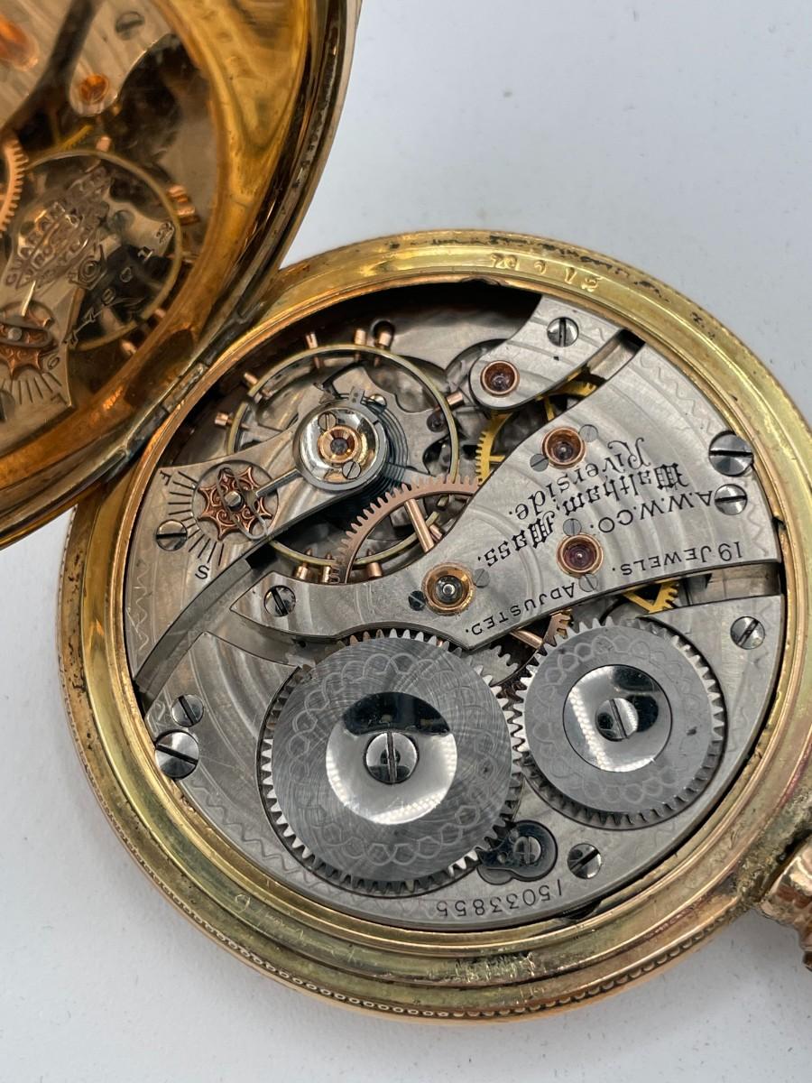 A.W.W.Co. Waltham Pocket Watch, No. (15033855), Size 16s, Prod Yr 1906, 19 Jewels. Case: Keystone No. 6779012, Jboss 14k Guar. 25 Yrs. Condition - Winder & watch are in working order. This is not a guarantee that all parts are original nor is the watch autheniticated.