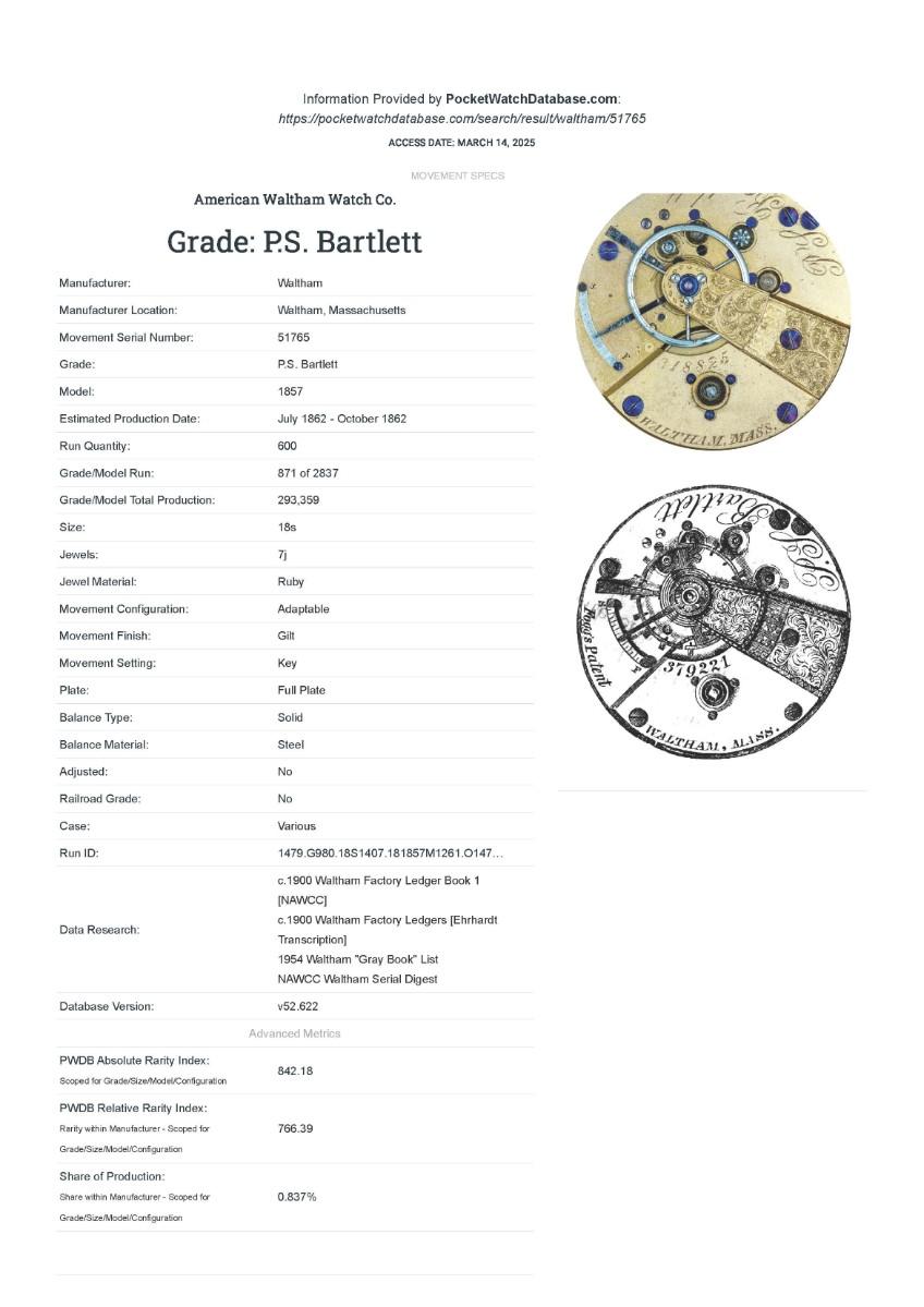 U.S. Watch Co. Waltham Pocket Watch, No. (51765), Size 18s, Prod Yr. 1862. Case: No. 1846010, GF, Engraved: Jack From Elady, Sept. 28, 91. Condition - Winder & watch are in working order. This is not a guarantee that all parts are original nor is the watch autheniticated.
