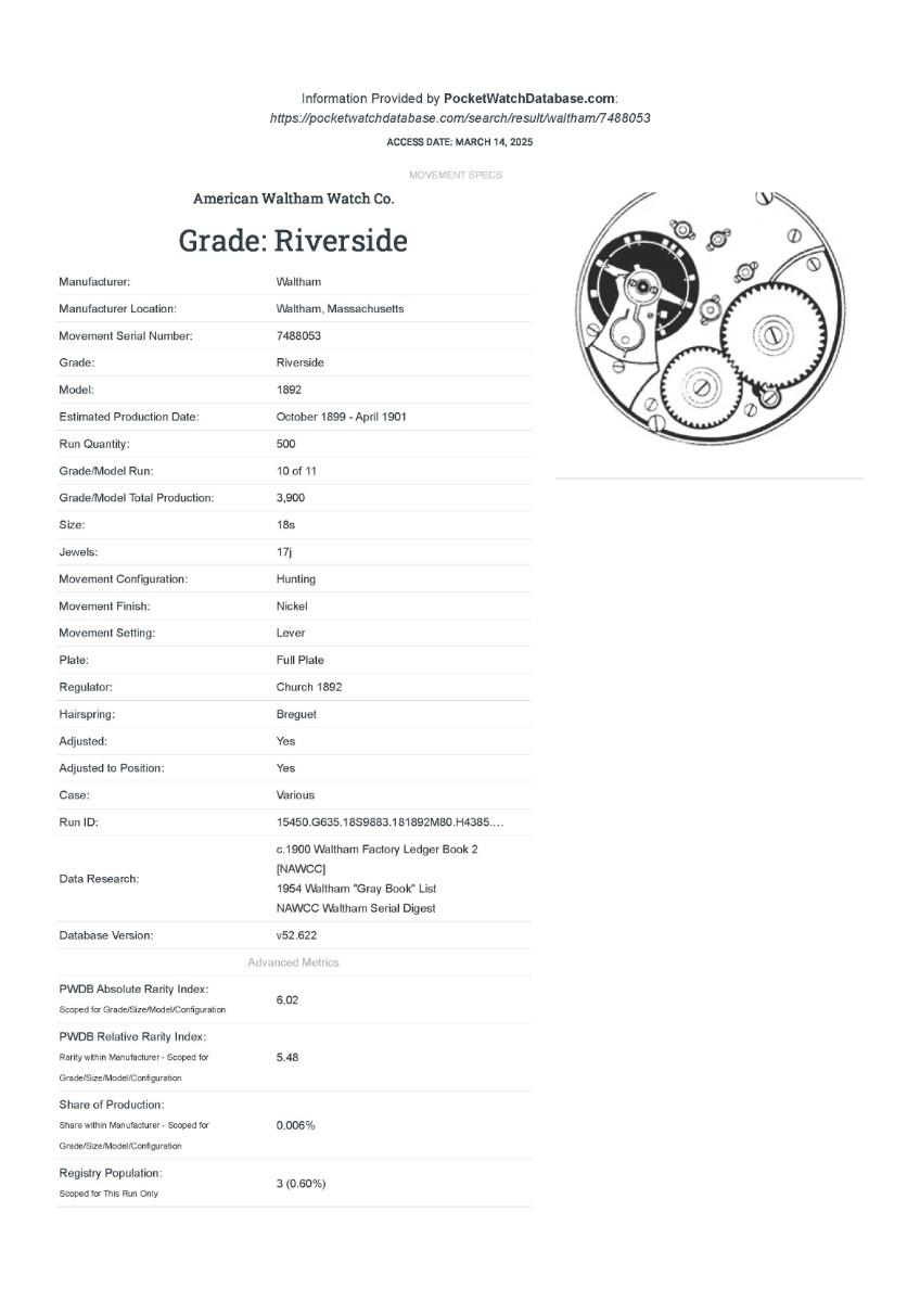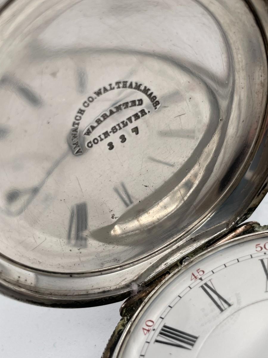 A.W.W.Co. Waltham Pocket Watch, No. (7488053), Size 18s, Prod Yr. 1901, 17 Jewels. Case: Am Watch Co. No. 337, warr. Coin Silver. Condition - Winder & watch are in working order. This is not a guarantee that all parts are original nor is the watch autheniticated.
