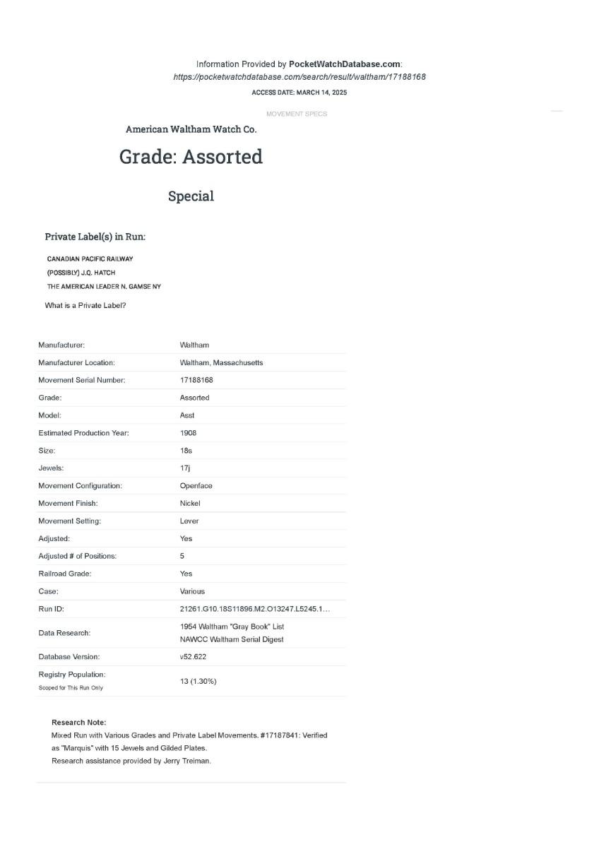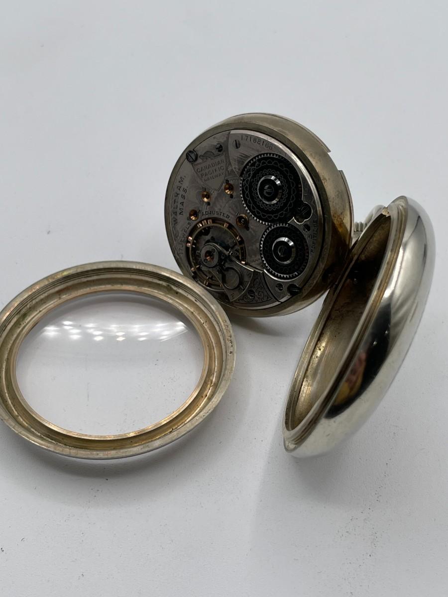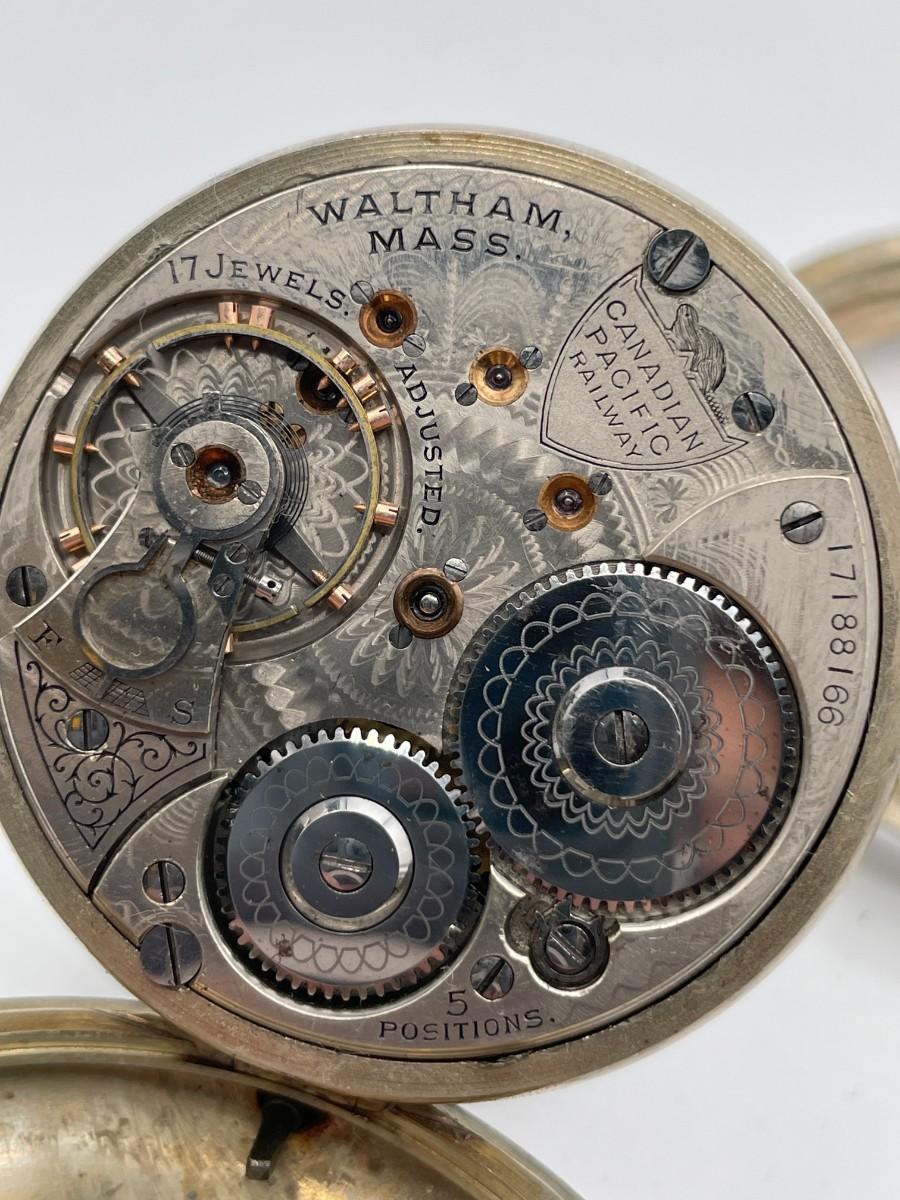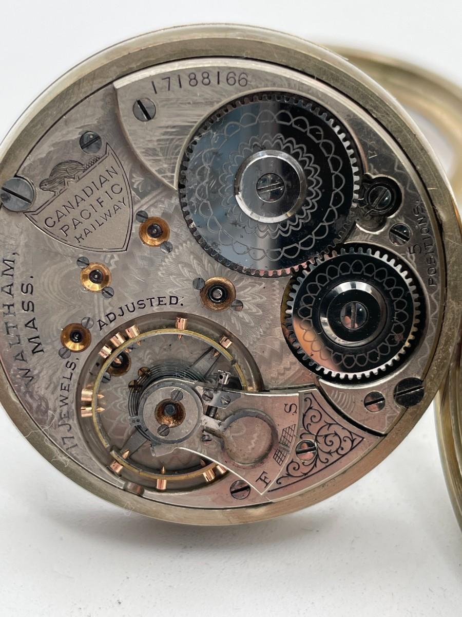 Waltham Canadian Pacific Railway Pocket Watch, No. (17188168), Size 18s, Prod Yr. 1908, 17 Jewels. Case: No. 67614, Illinois Watch Co., Nickel. Condition - Winder & watch are in working order. This is not a guarantee that all parts are original nor is the watch autheniticated.