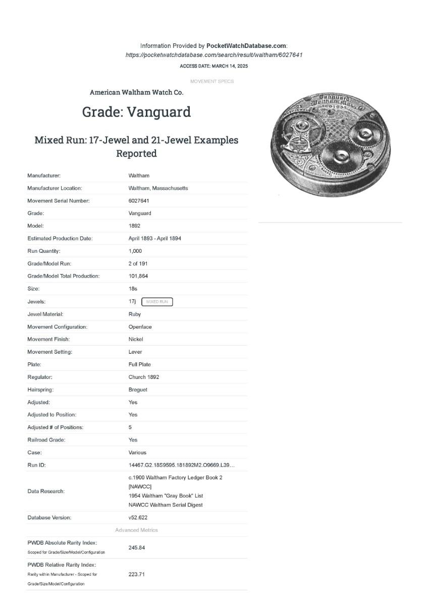 American Watch Co. Waltham, No. (6027641), Size 18s, Prod Yr. 1893. Case: AWC Co. No. 266096, Sterling. Condition - Winder & watch are in working order. This is not a guarantee that all parts are original nor is the watch autheniticated.