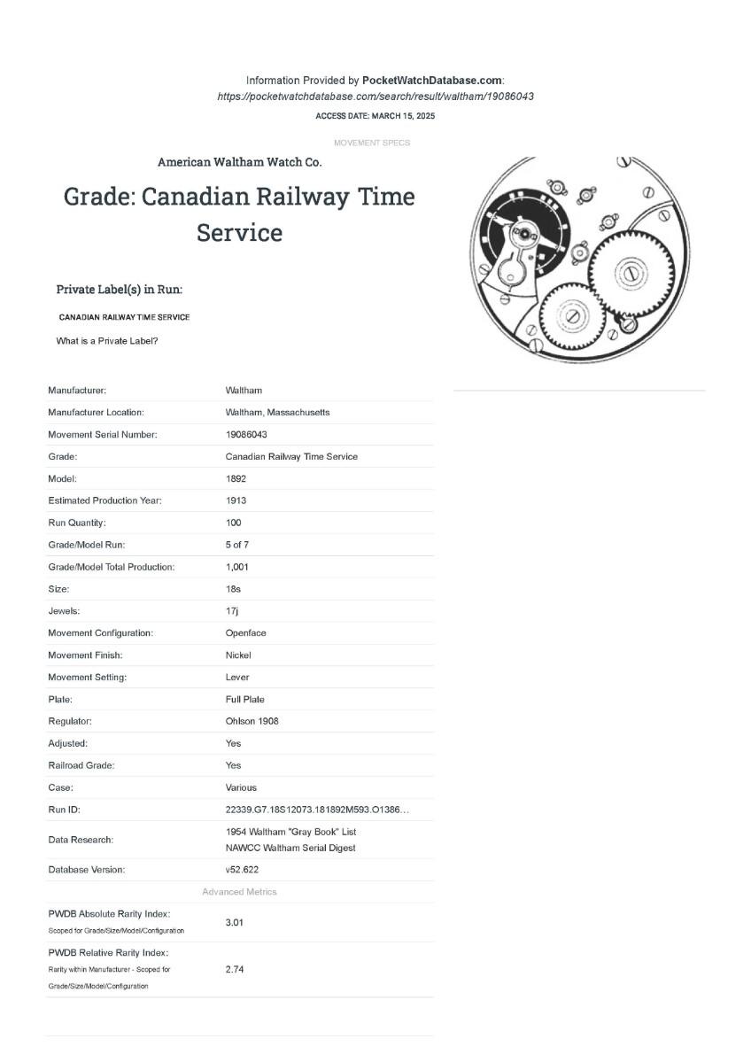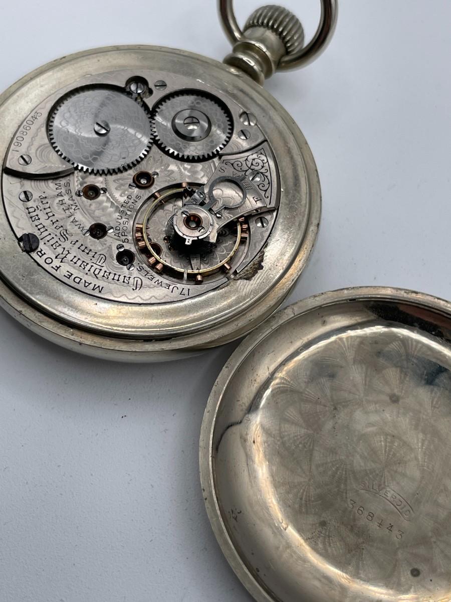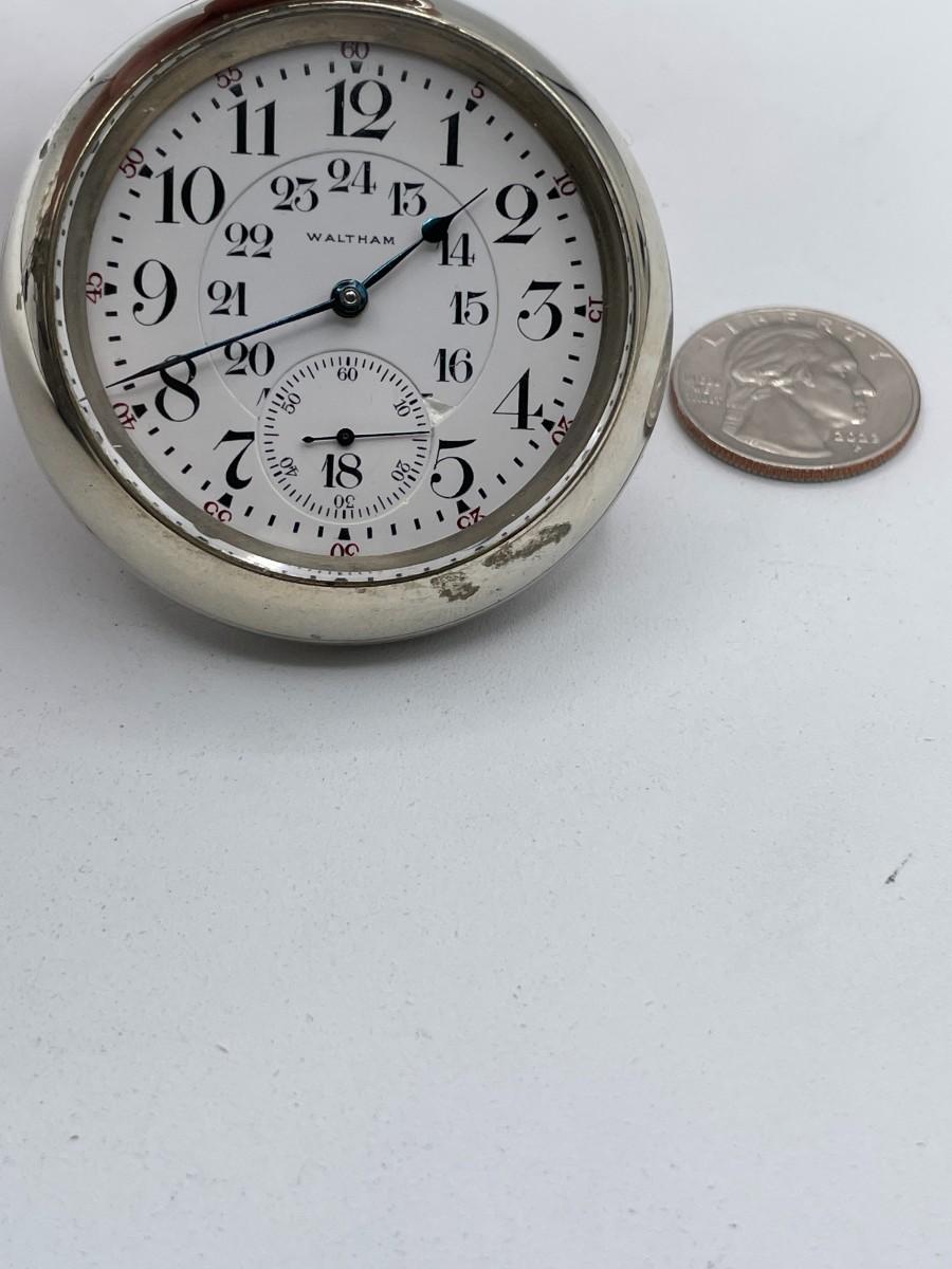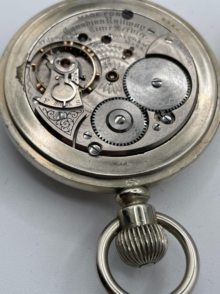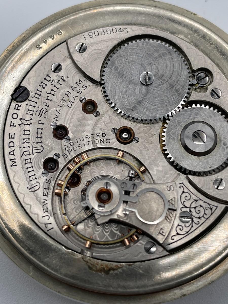 Waltham Pocket watch No. (19086043), Size 18S, Production Yr. 1913, Canadian Railroad Time Service watch. Case: Silveroid No. 368443, Couwby on the back. Condition - Winder & watch are in working order. This is not a guarantee that all parts are original nor is the watch autheniticated.