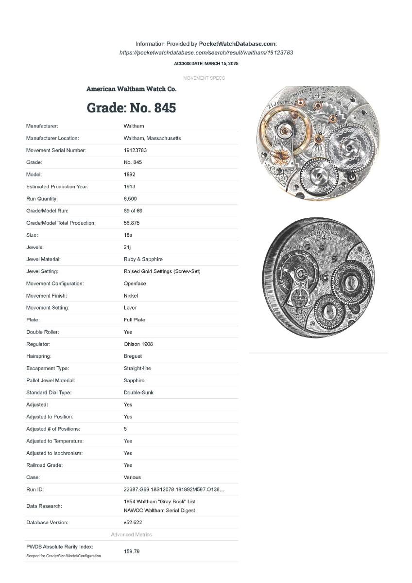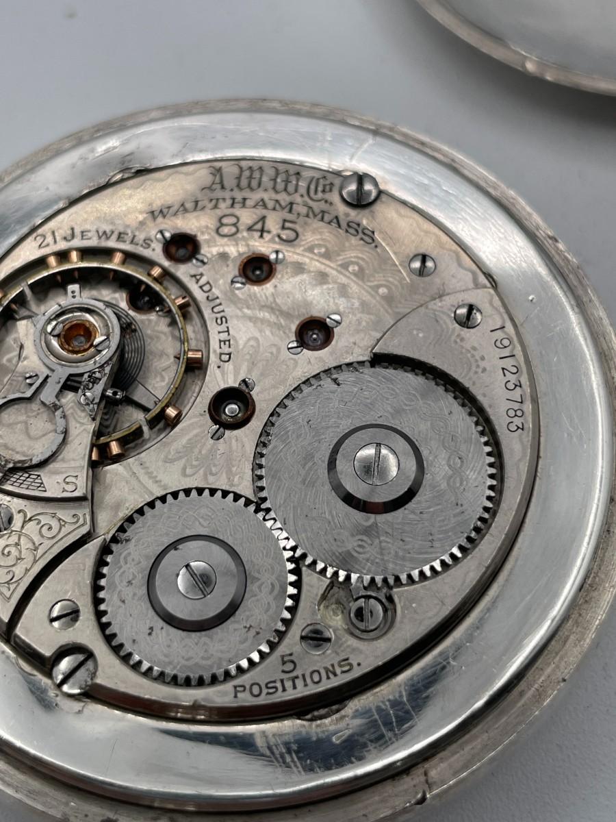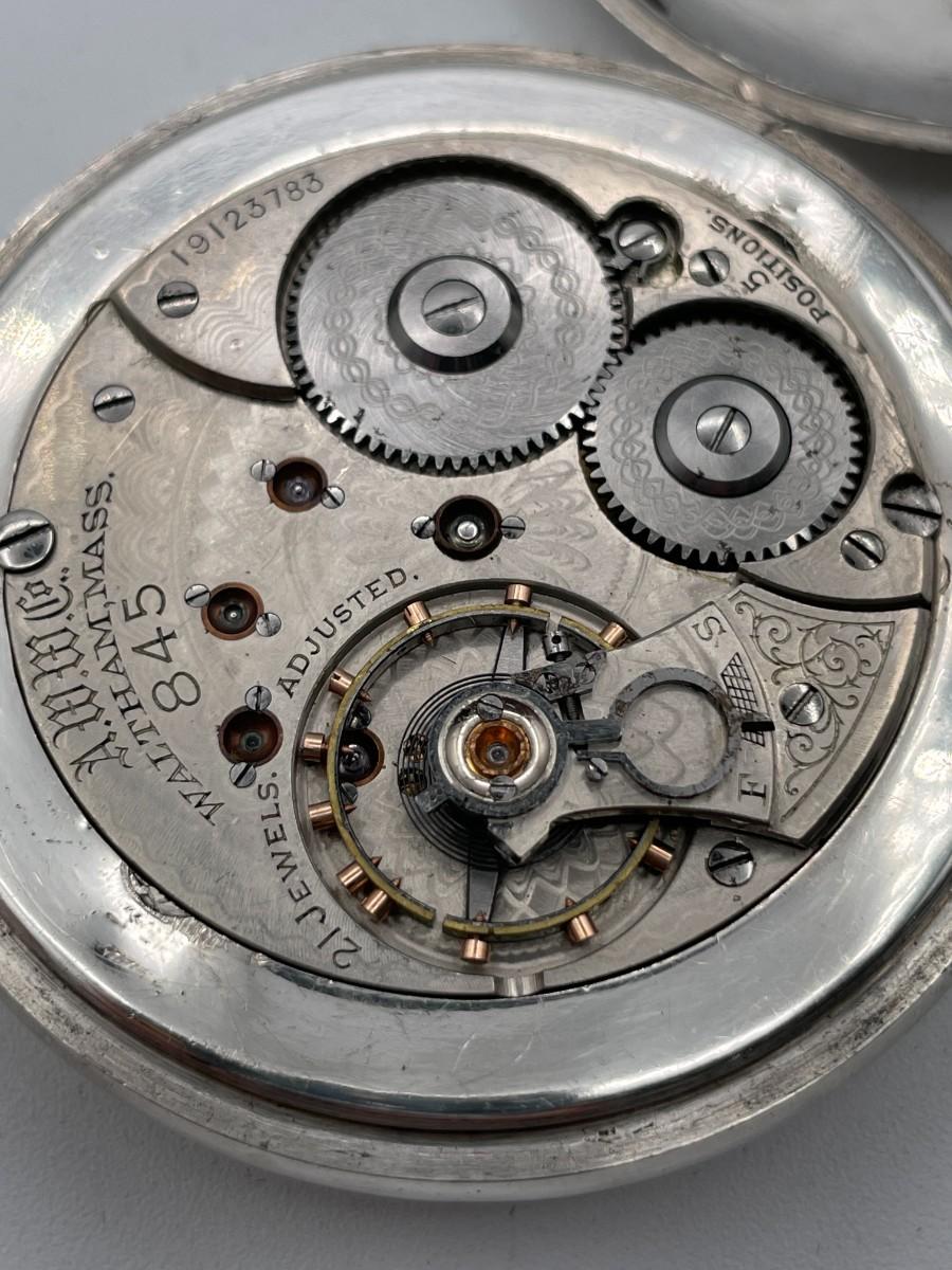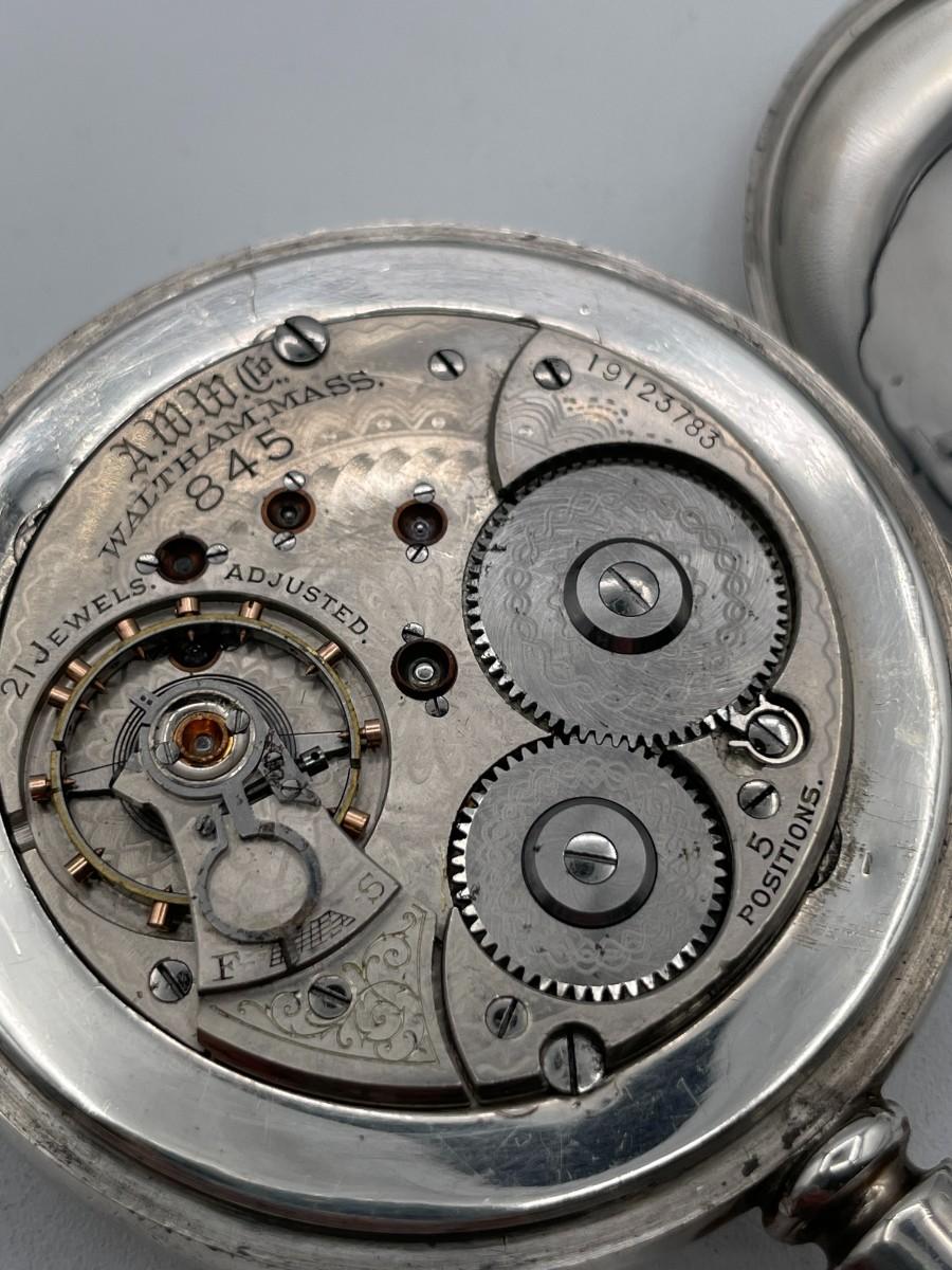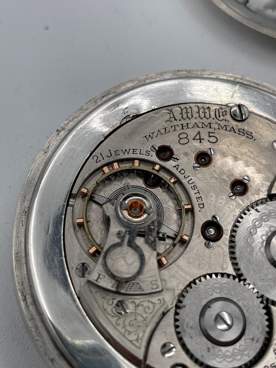 AWW Co. Waltham Pocket Watch 845, No. 19123783, Size 18s, Prod. Yr. 1913, 21 Jewels. Case: No. 173098, Regal Sterling Silver. Condition - Winder & watch are in working order. This is not a guarantee that all parts are original nor is the watch autheniticated.