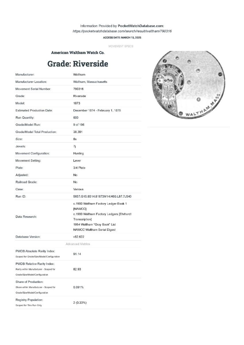 Waltham Pocket Watch, Cresrent St., No. 790316, Size 18s, Prod Yr. 1875, 21 Jewels. Case: Keystone No. 2575926, GF. Condition - Winder & watch are in working order. This is not a guarantee that all parts are original nor is the watch autheniticated.