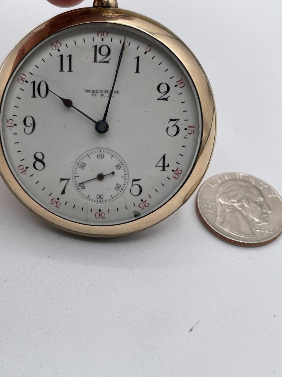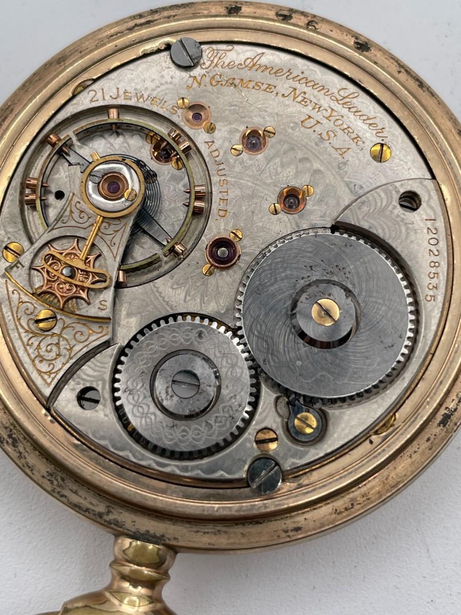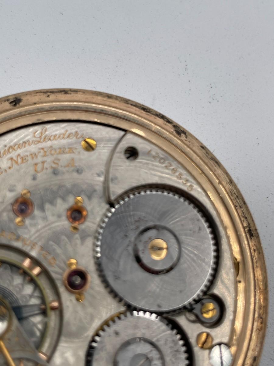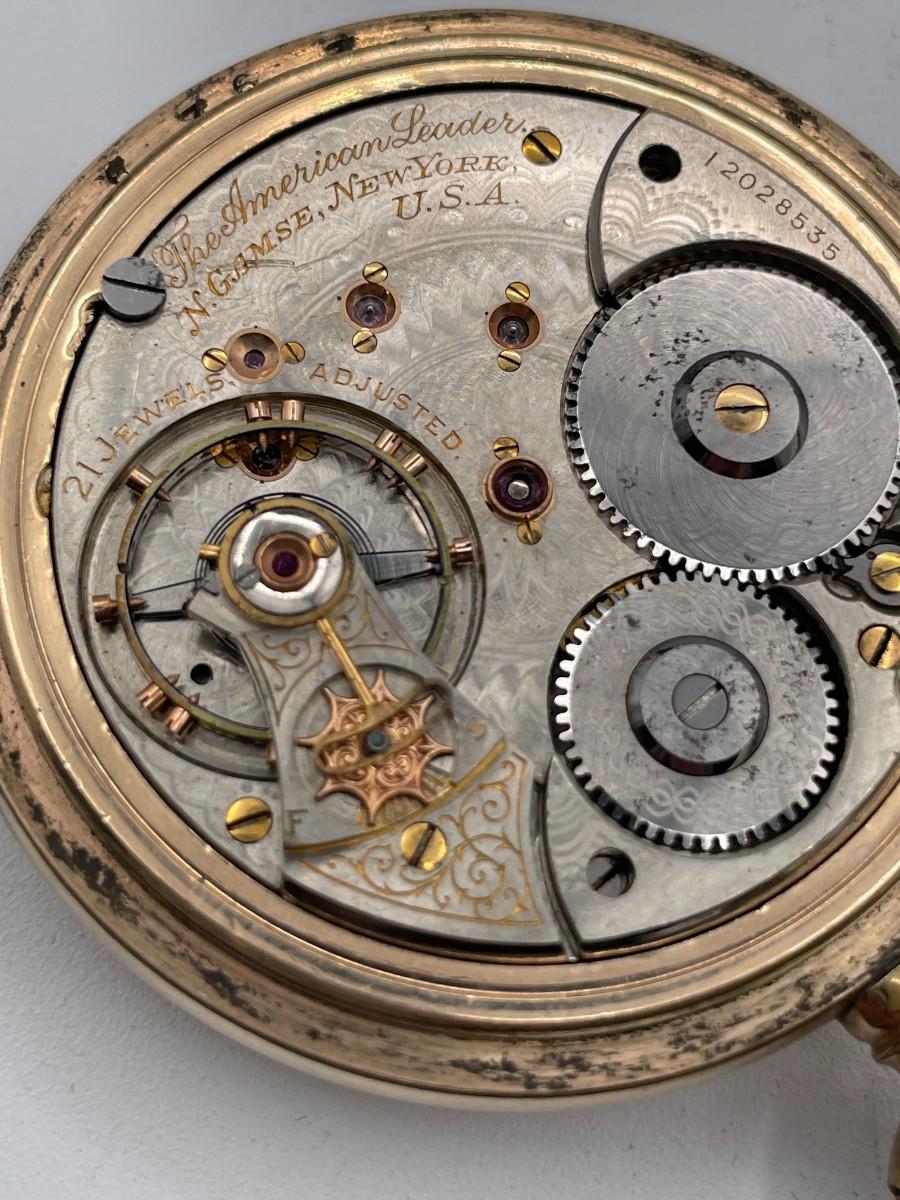 Waltham Pocket Watch, The American Leader, No. 12028535, Size 18s, Prod. Yr. 1902, 21 Jewels. Case: No. 716767, B & B Royal, Warr. 20 yrs. Condition - Winder & watch are in working order. This is not a guarantee that all parts are original nor is the watch autheniticated.