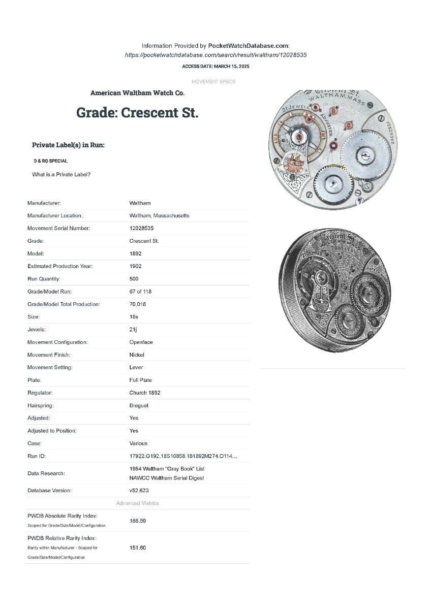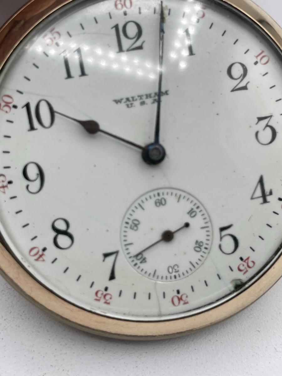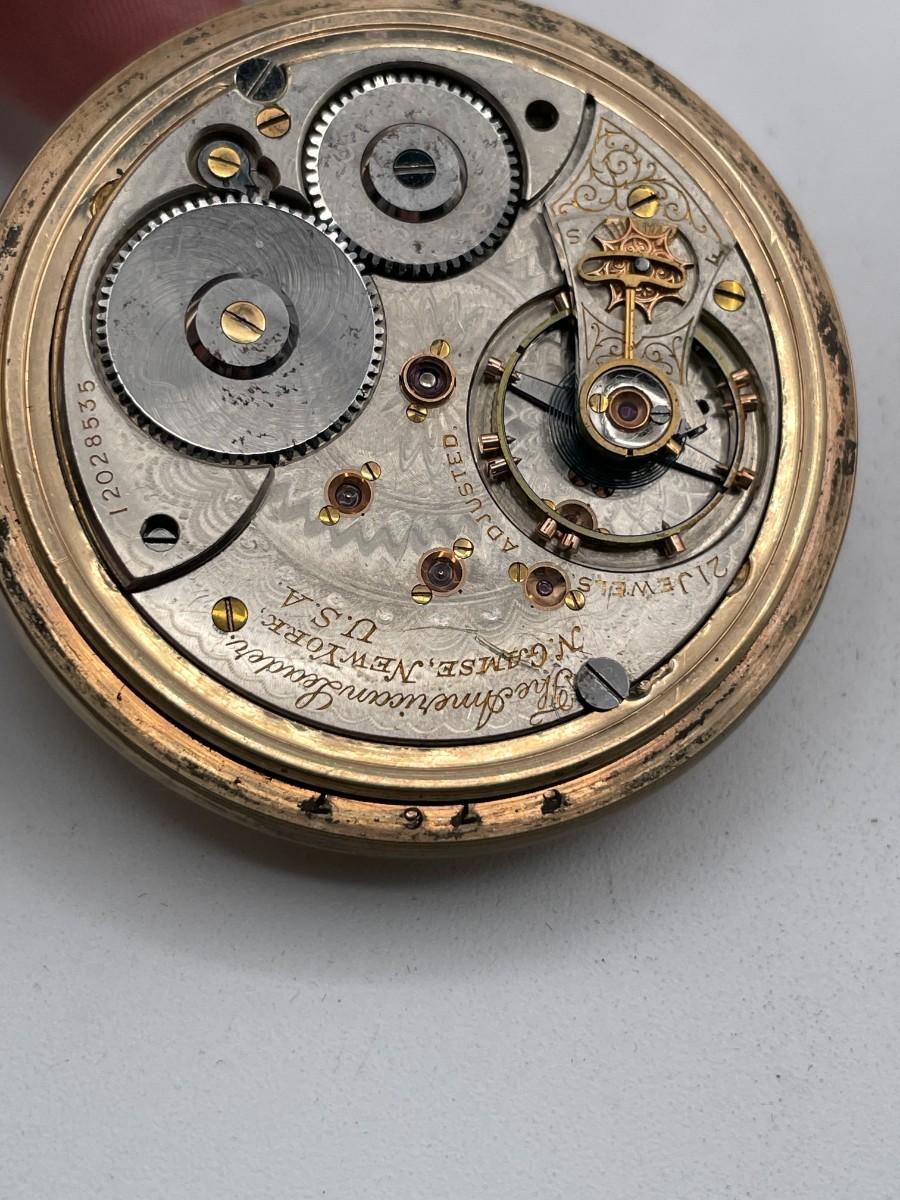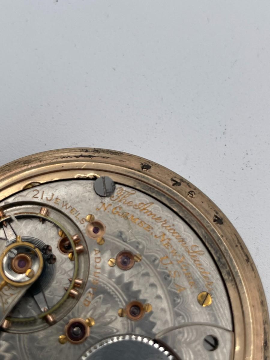 Waltham Pocket Watch, The American Leader, No. 12028535, Size 18s, Prod. Yr. 1902, 21 Jewels. Case: No. 716767, B & B Royal, Warr. 20 yrs. Condition - Winder & watch are in working order. This is not a guarantee that all parts are original nor is the watch autheniticated.