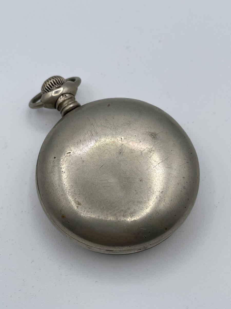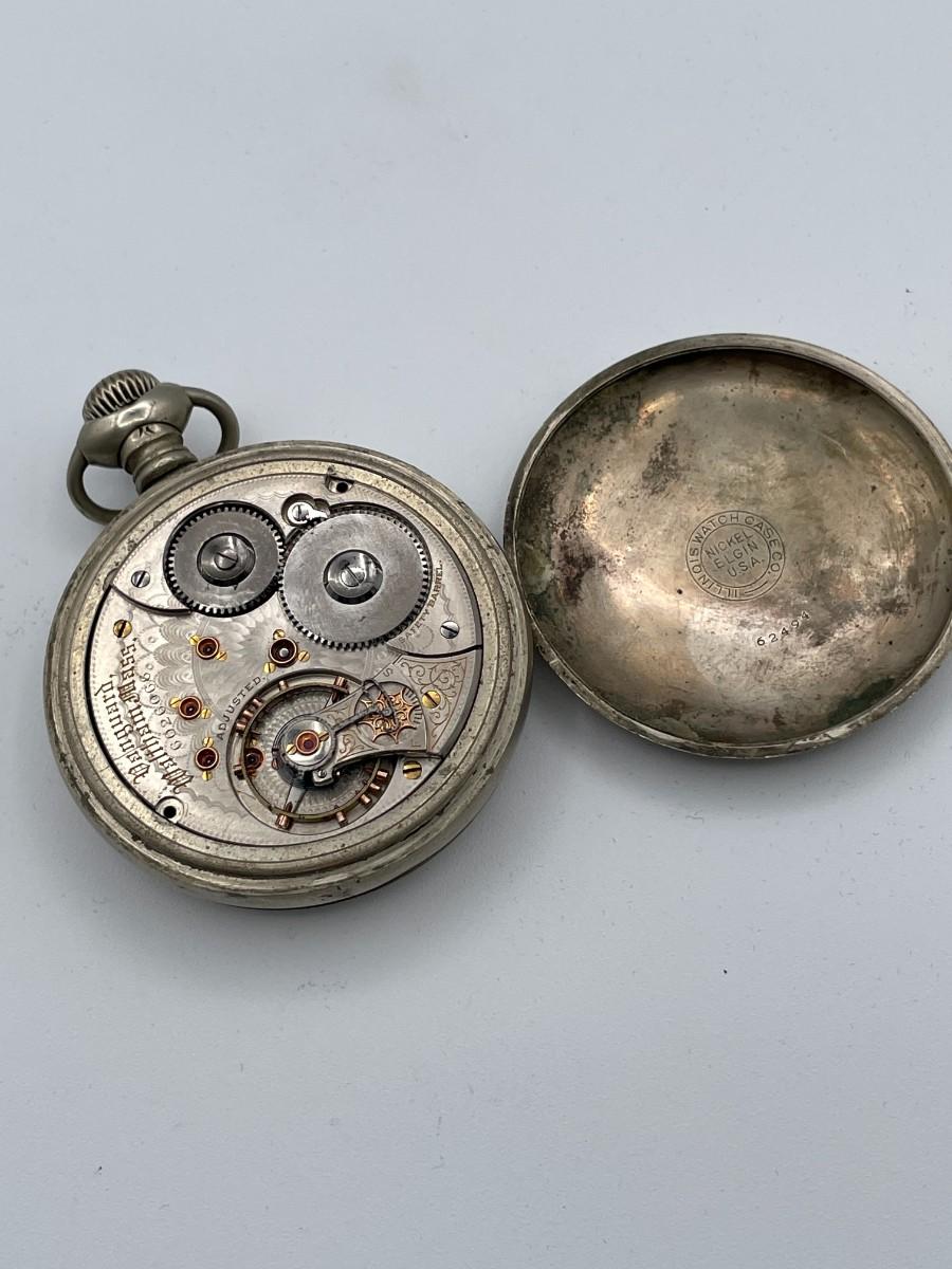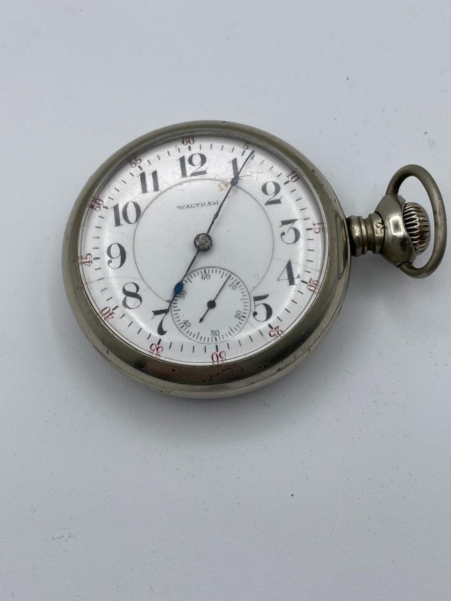 Waltham Pocketwatch - Silver Tone, Adjusted, Size 16S Number(6026066) with Elgin Nickel Case (Number (62494). Condition - Winder & watch are in working order. Glass is missing. This is not a guarantee that all parts are original nor is the watch autheniticated. Estimated Value - $590 - $785. Year 1892.