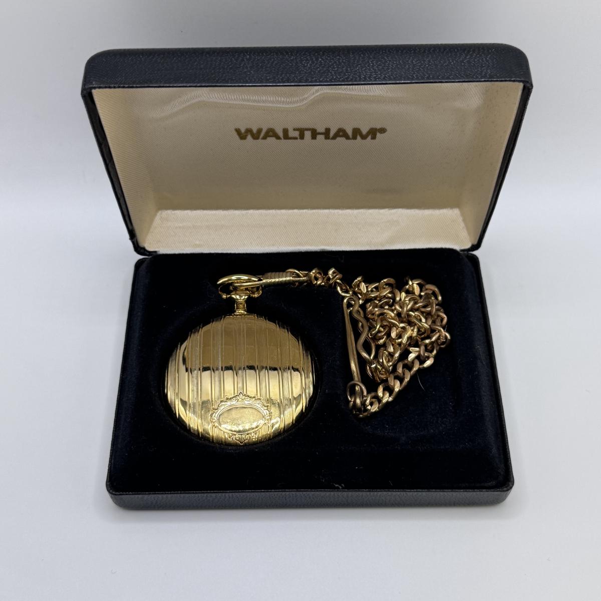 This lot includes one Waltham quartz pocket watch in a gold tone. The watch comes in its original box with a gold-toned chain attached. The pocket watch measures 2”D. Shipping available.