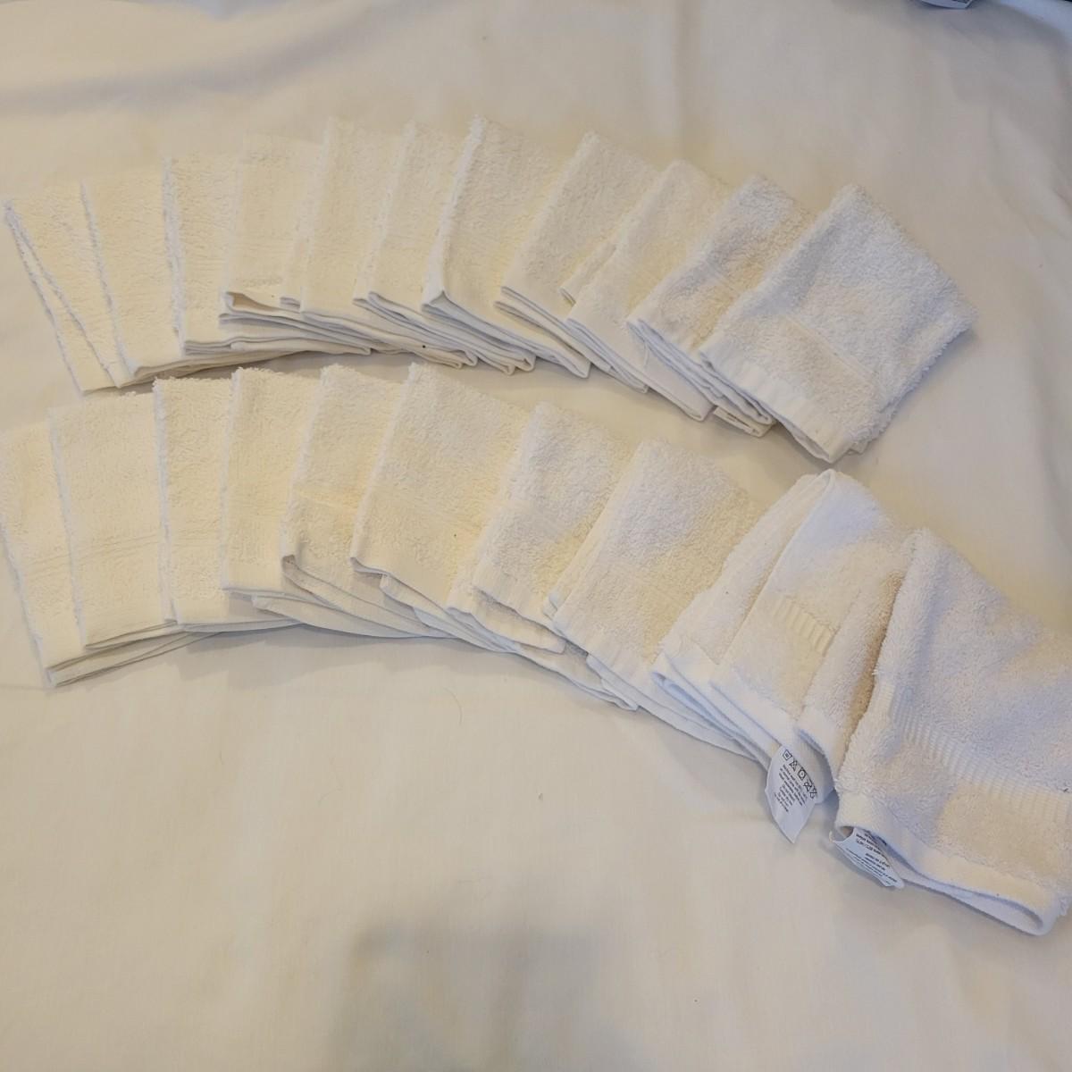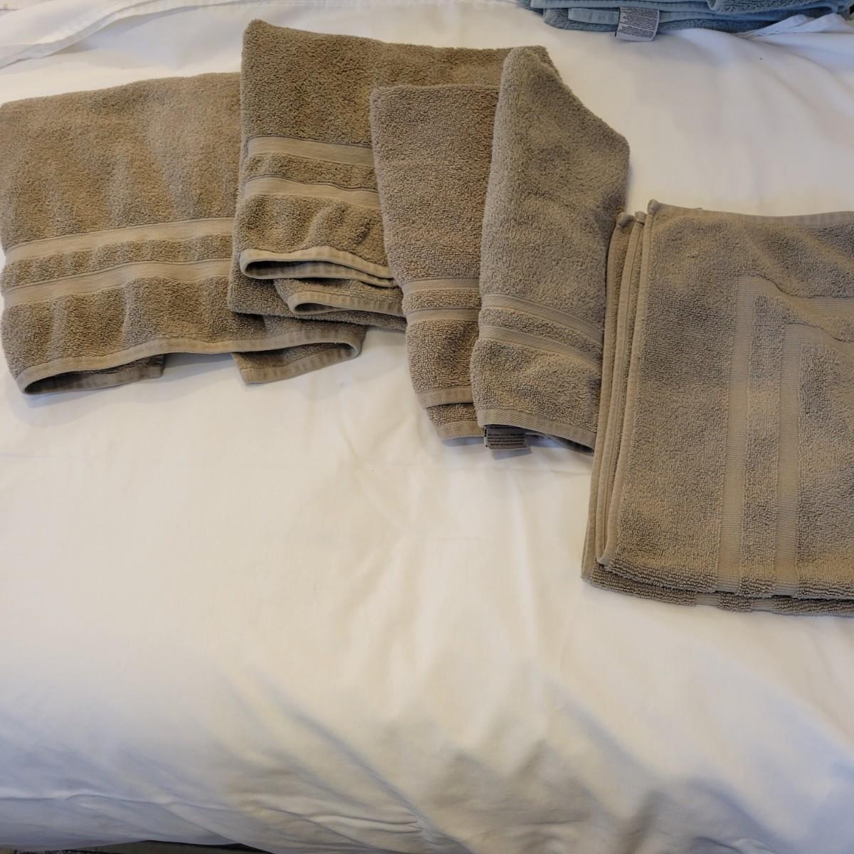Three sets of Wamsutta towel sets in three colors. The dusty rose color has two towels and two hand towels, the brown set has two towels and hand towels, and one bath mat. The blue/green set has four towels and hand towels and two wash cloths. Also included is a large assortment of white hand towels. Local pickup only