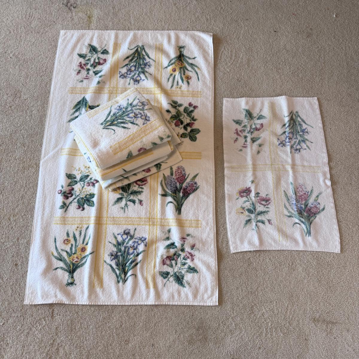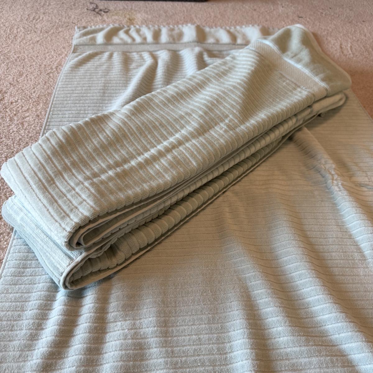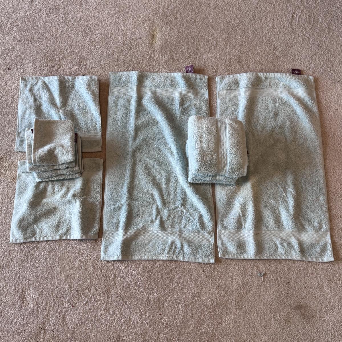 This lot of 100% cotton towels includes three light blue bath towels and one floor towel from Wamsutta, three blue bath towels, two washcloths, and one hand towel from Martha Stewart’s Collection, and two Utica hand towels. You’ll also find one JC Penny bath towel, five Biltmore hand towels and six Biltmore washcloths, and three light blue bath towels from Spa by Kassafina. Lastly, you’ll find four bath towels and one hand towel by LTZ at Home, and three bath towels, one hand towel, and six washcloths in light yellow by Pima Luxe. All towels are around the standard size. Shipping available.