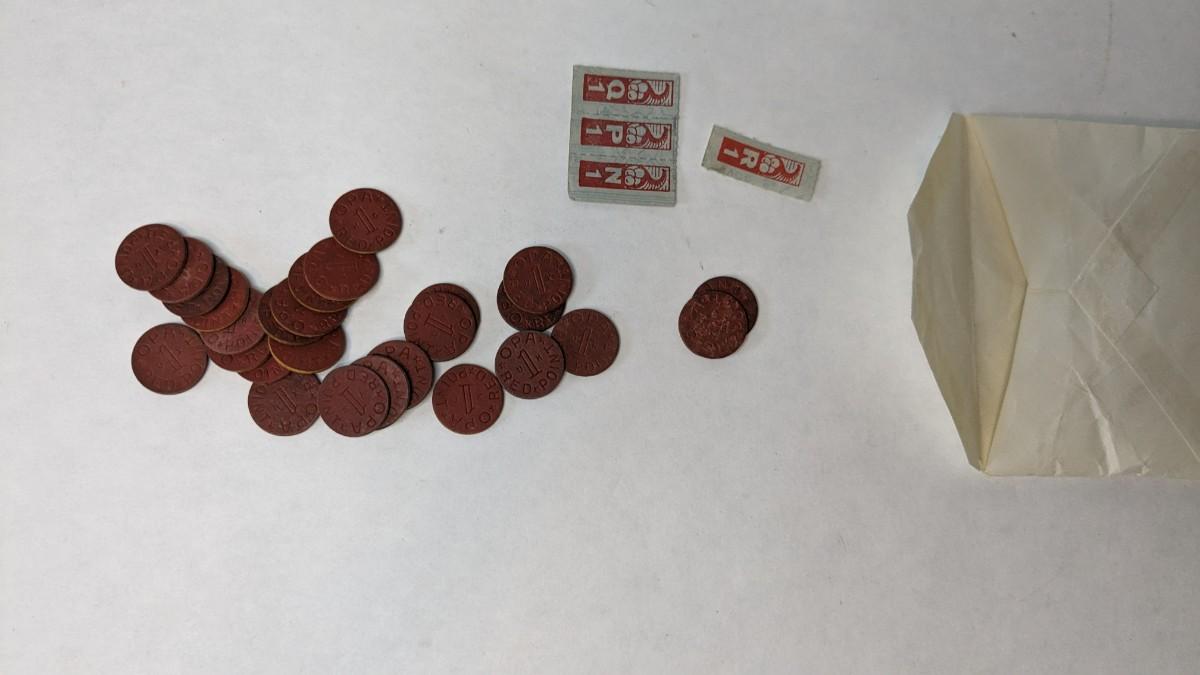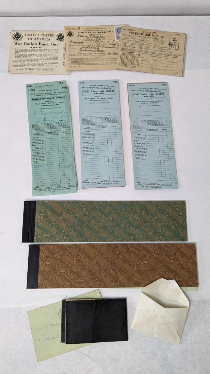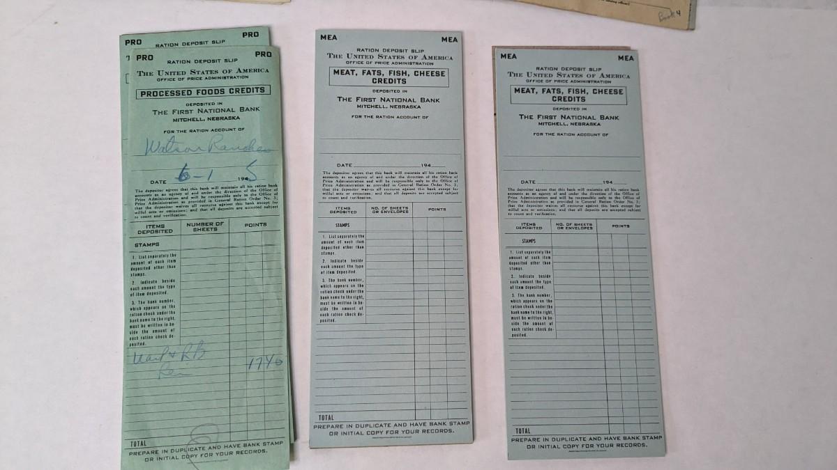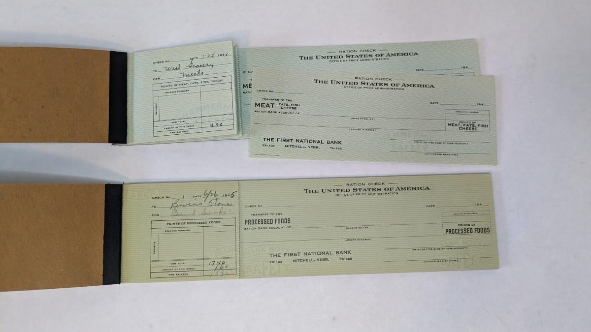 Books 1,2, and 3. Processed Food Credits and (2) Meat, Fats, Fish, Cheese Credits books. Transfer books for both of these categories, A used book with stubs remaining and small envelope of Opa red points.