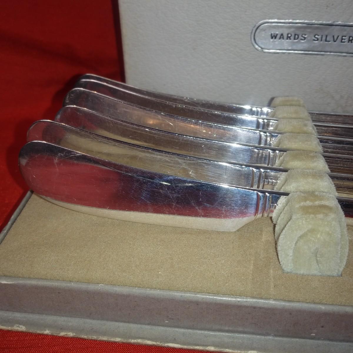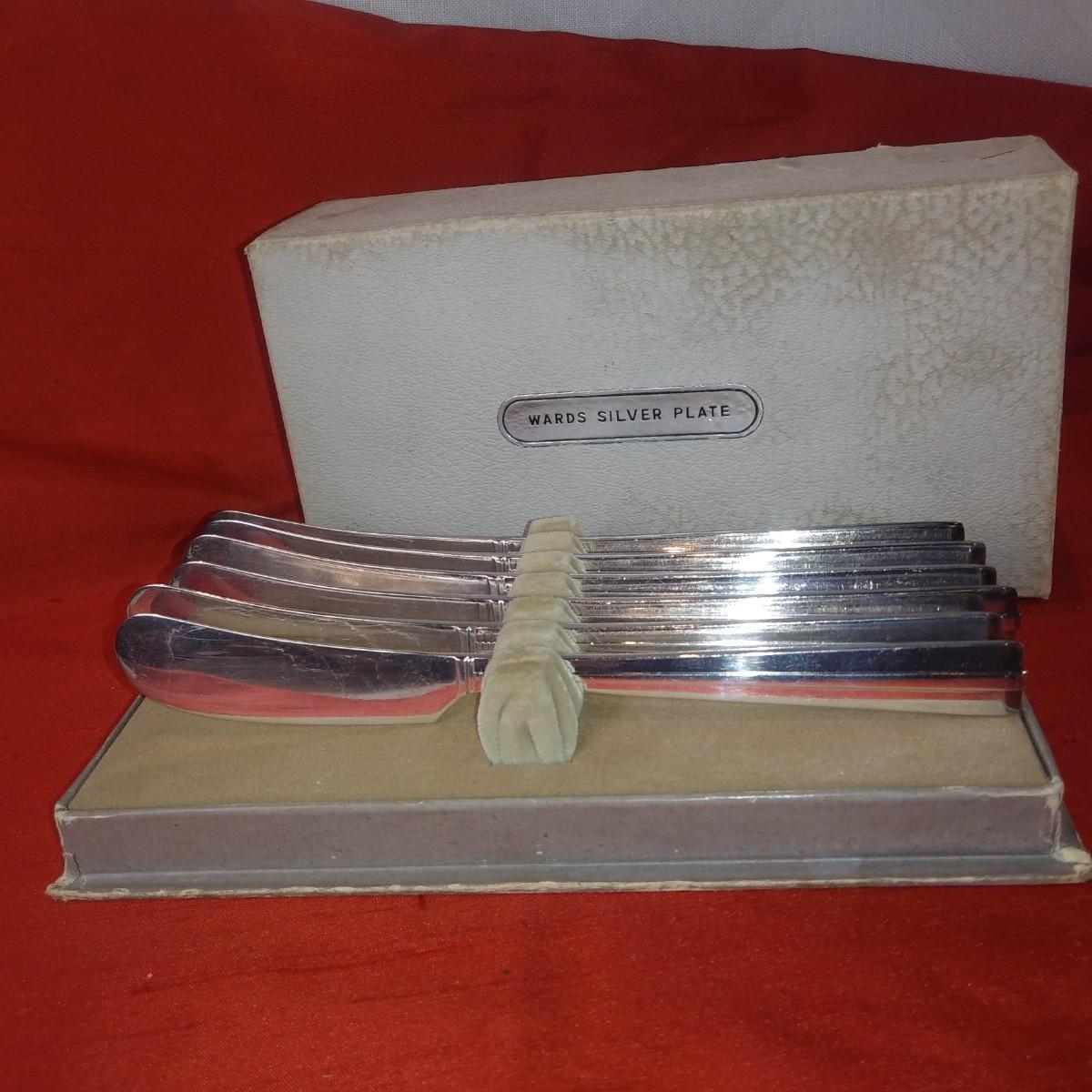 This auction lot is for a set of Ward Butter Knives. This is a vintage set of 6 silverplated butter knives/spreaders by Ward Silver Plate Co. in the original box. They have been used and therefore have some minor marks on a few of the blades.