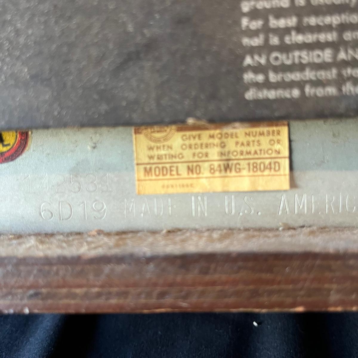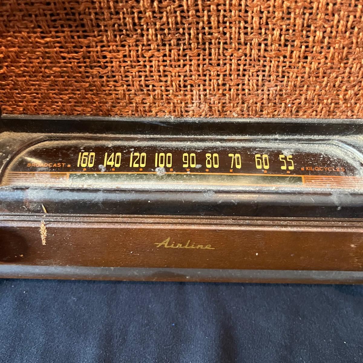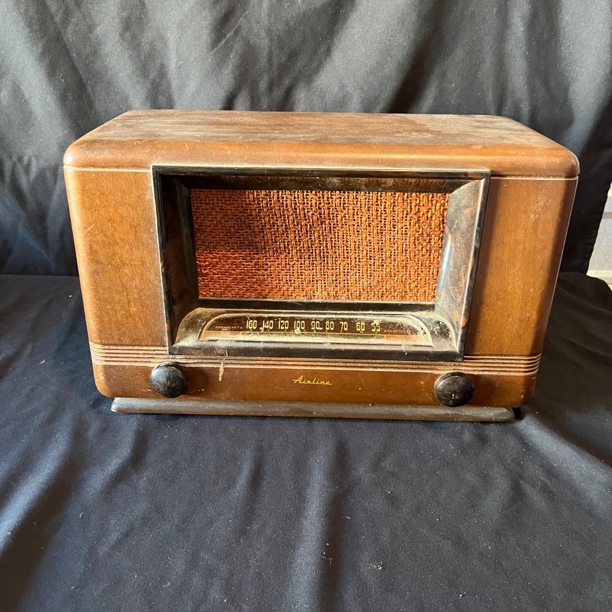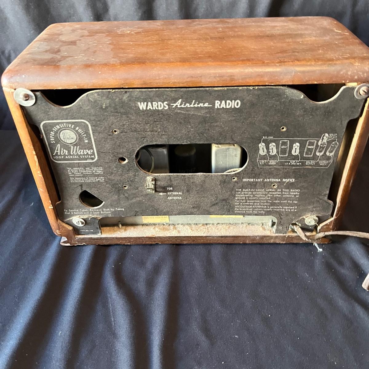 Lot includes a Wards Airline radio model# 84WG-1804D. Radio has a wood body and lights up and hums when powered on. Radio measures 13.5” x 16.5” x 8.5”.