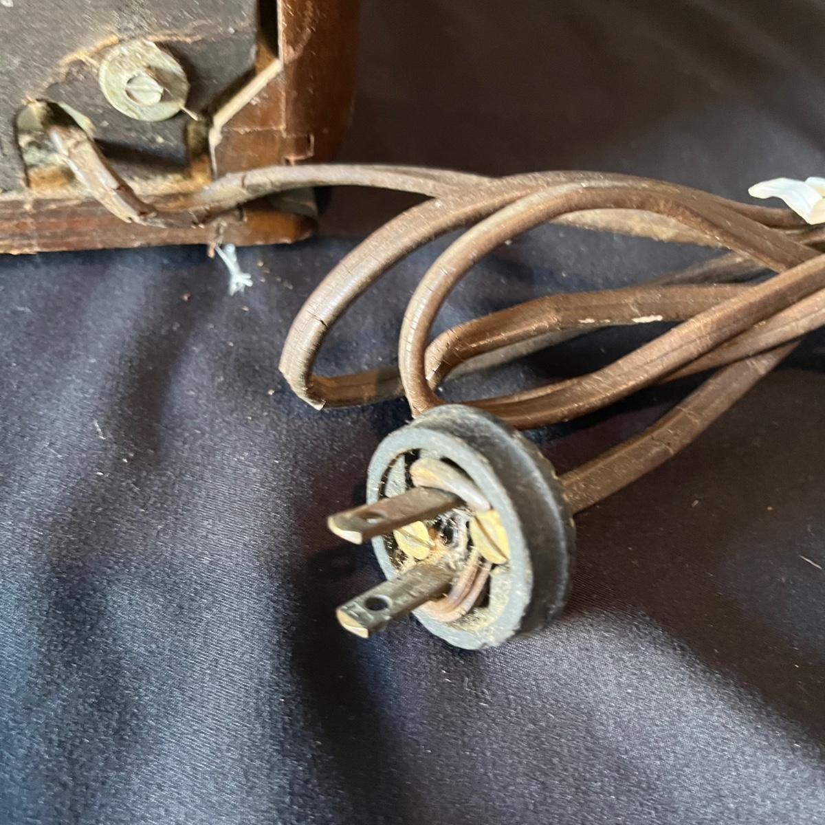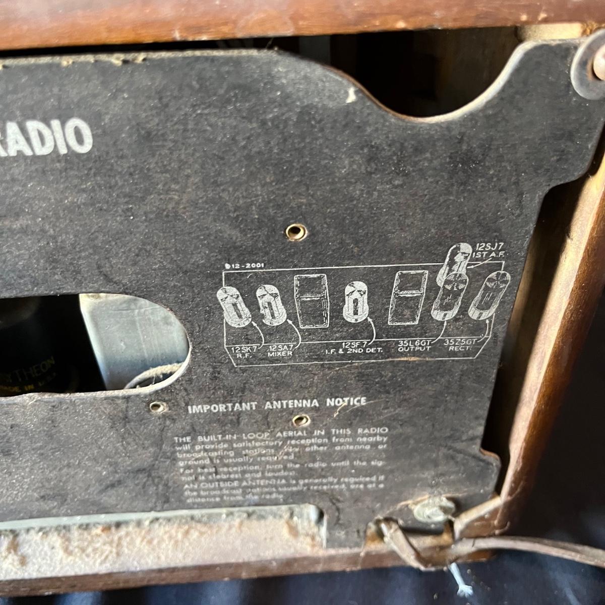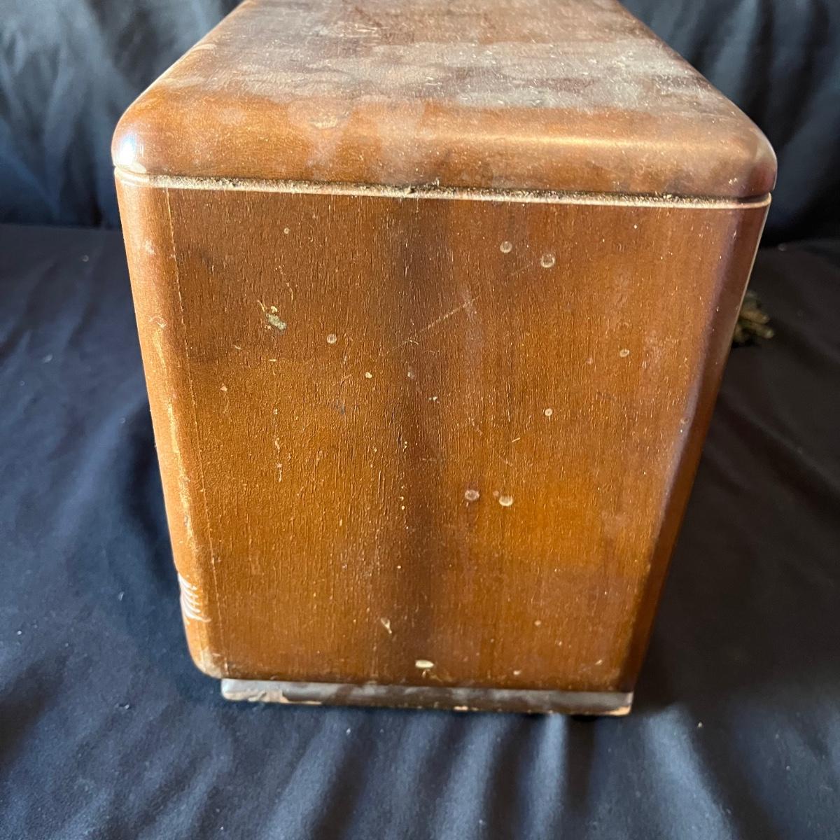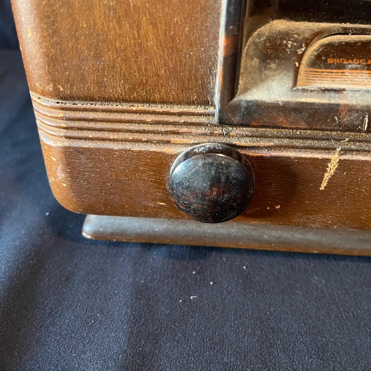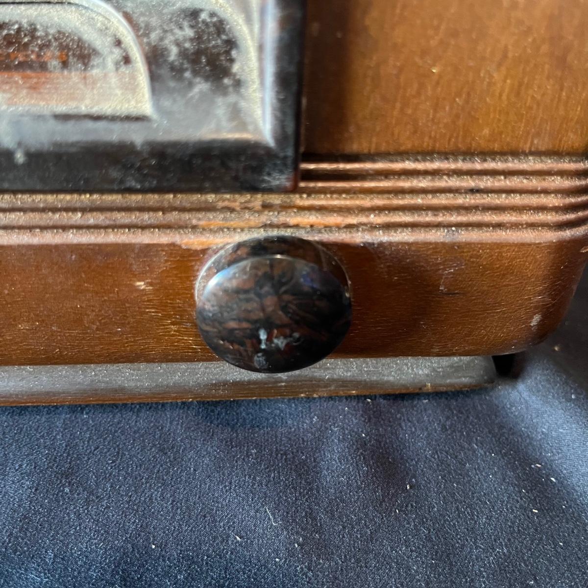 Lot includes a Wards Airline radio model# 84WG-1804D. Radio has a wood body and lights up and hums when powered on. Radio measures 13.5” x 16.5” x 8.5”.