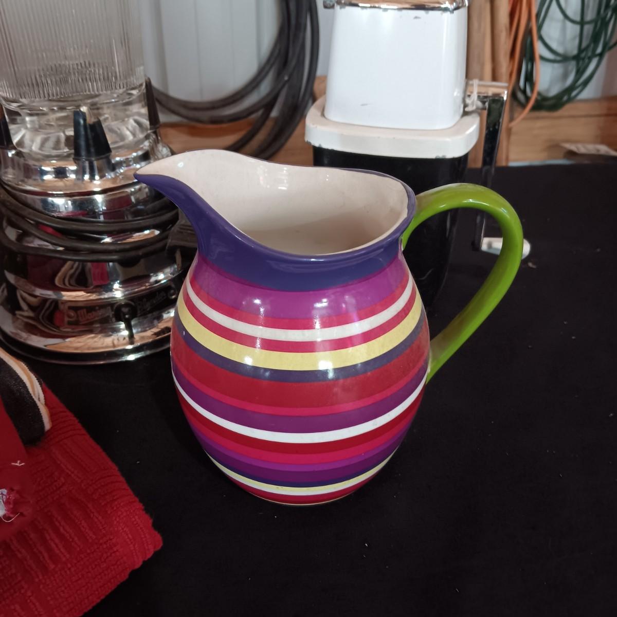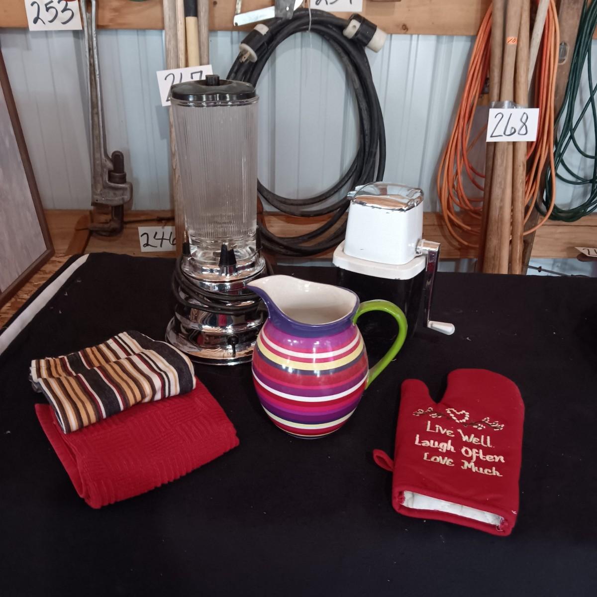 WARING BLENDER, CRANK ICE CRUSHER, LINEENS AND A PITCHER