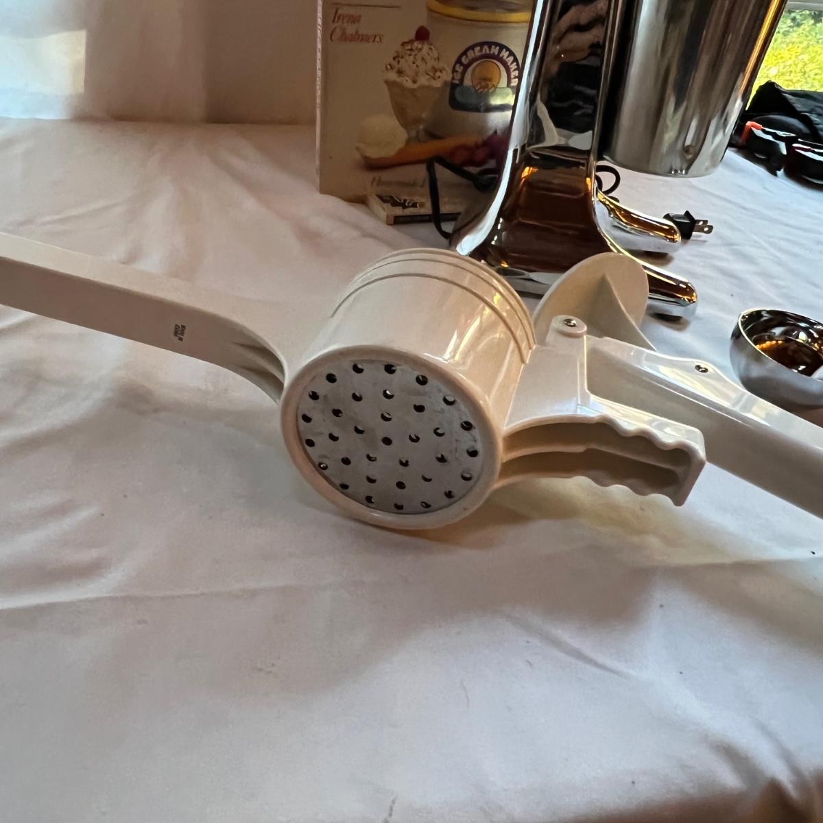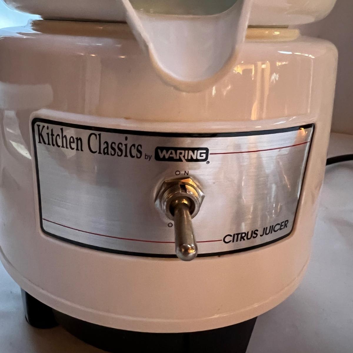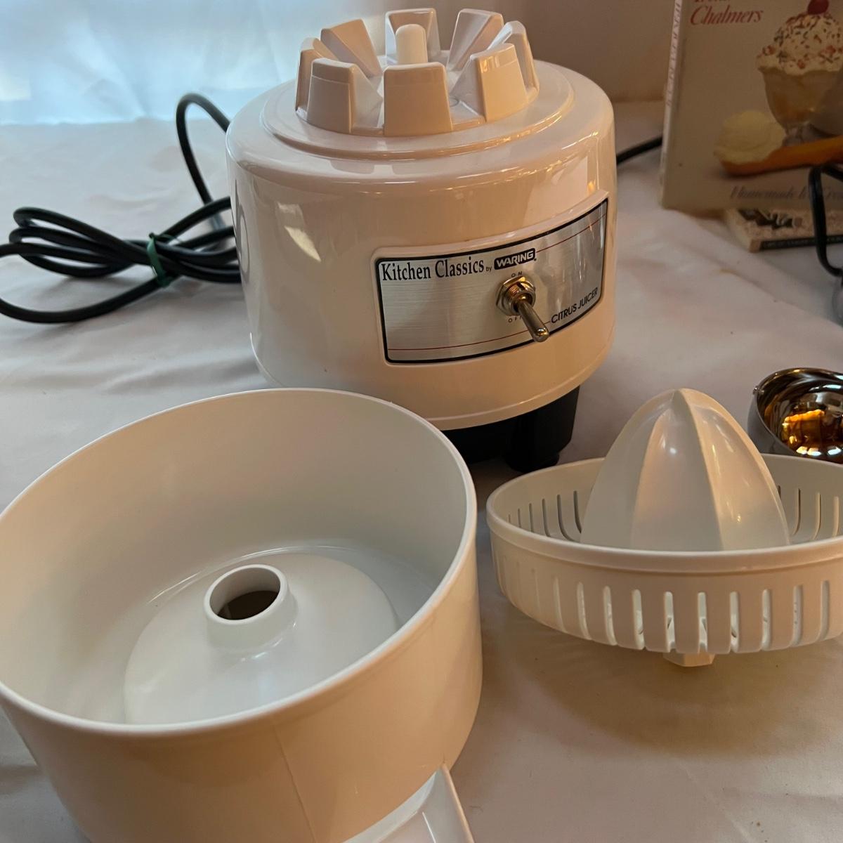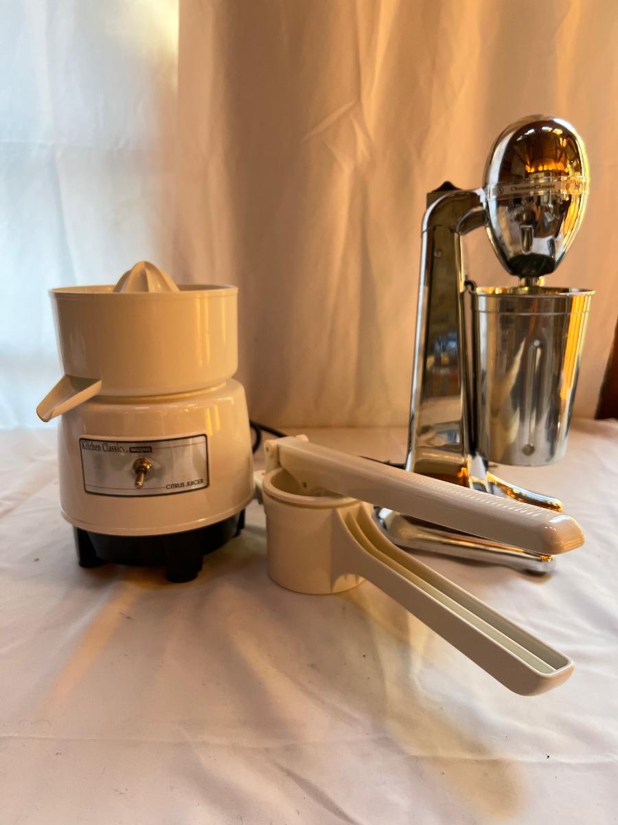 A waring “˜Kitchen Classics’ juicer is model 31JC28. Lot also includes a Hamilton Beach chrome classic drink mixer and a Metaltex potato ricer (that can work as a manual juicer). Items powered on when plugged in.