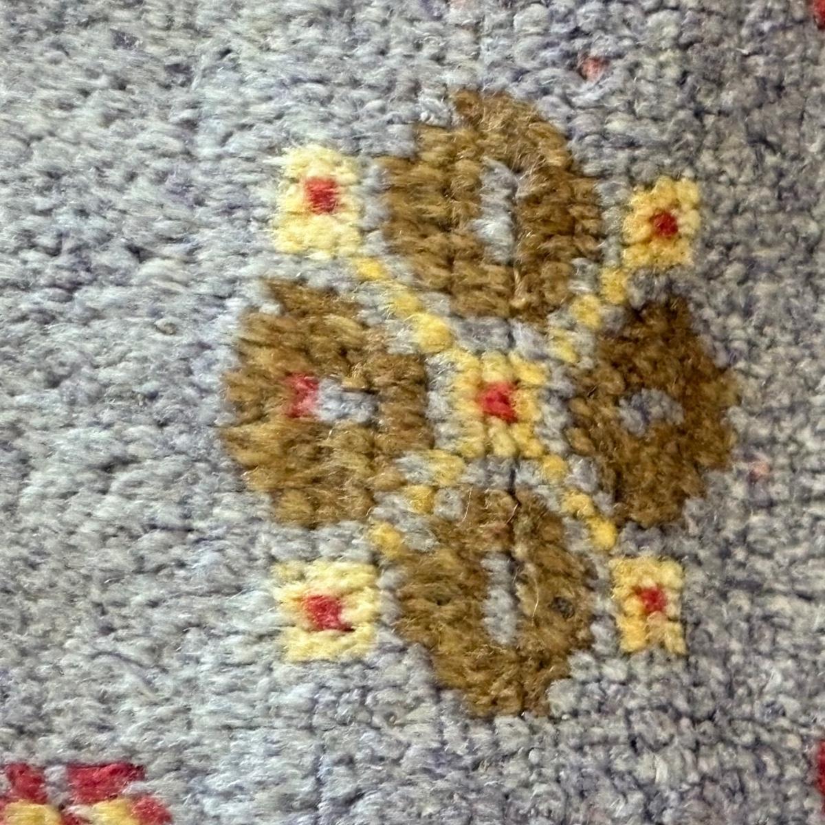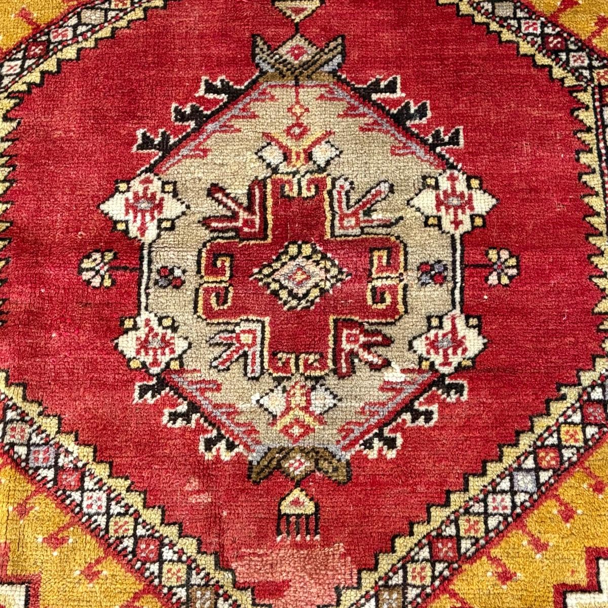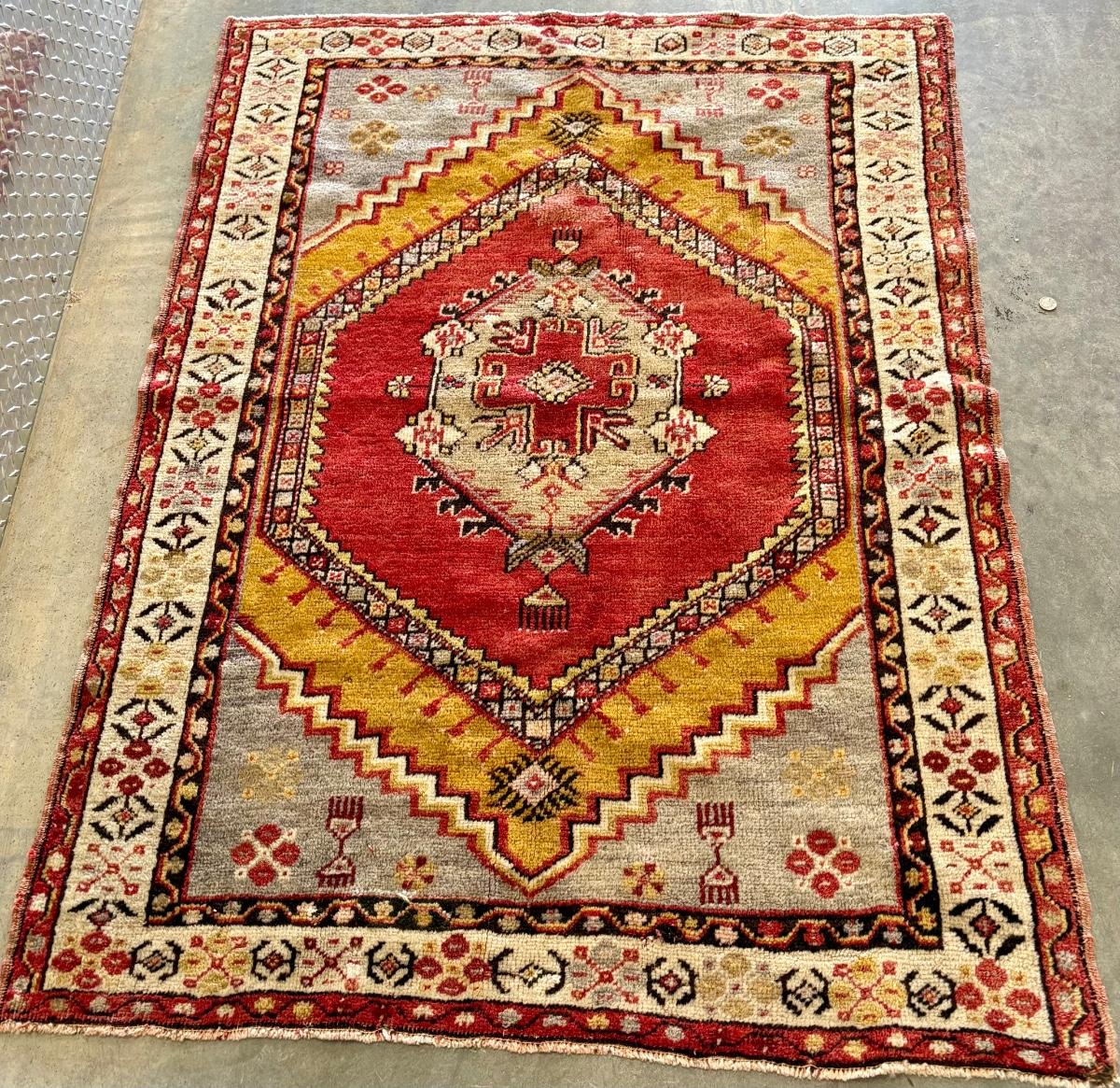 Lovely red and mustard geometric patterns with blue and cream accents. Appears to be handwoven and has a slight pile. Measures 3’5” x 4’7”. No apparent odors.