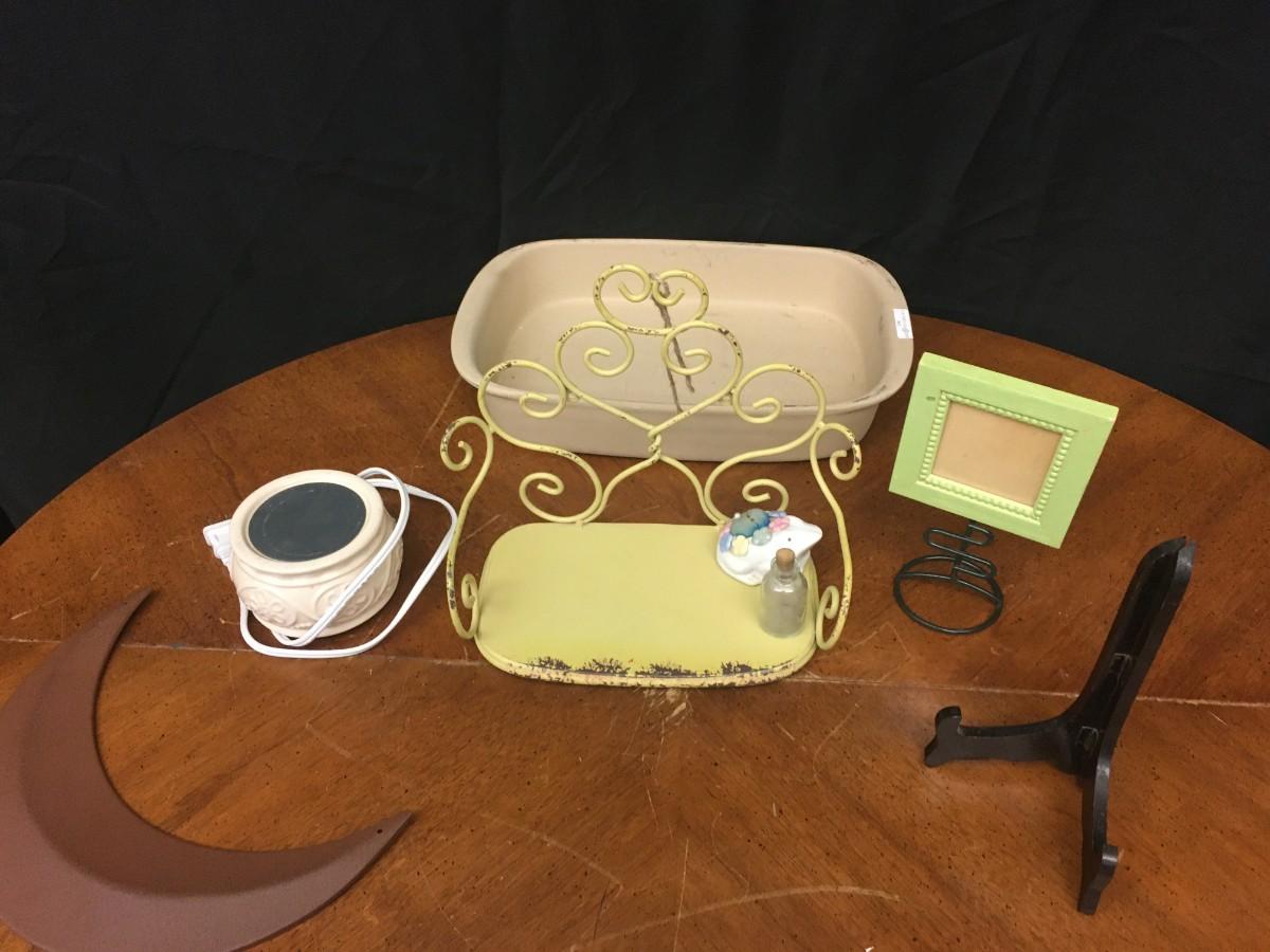 decor: warmer, moon decor, wire shelf, frame, easel, dish;
