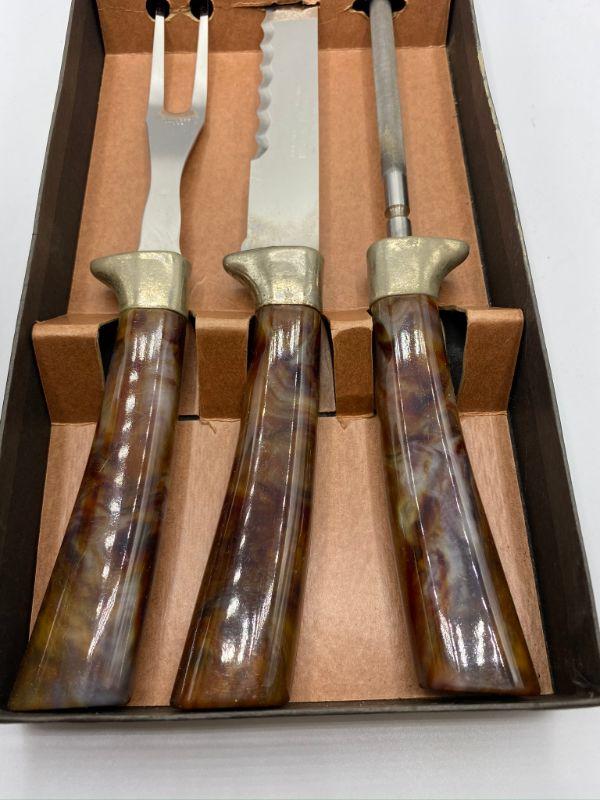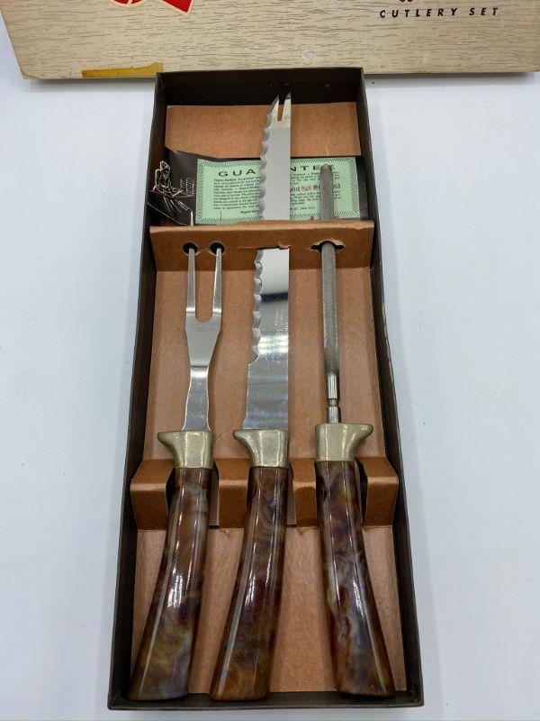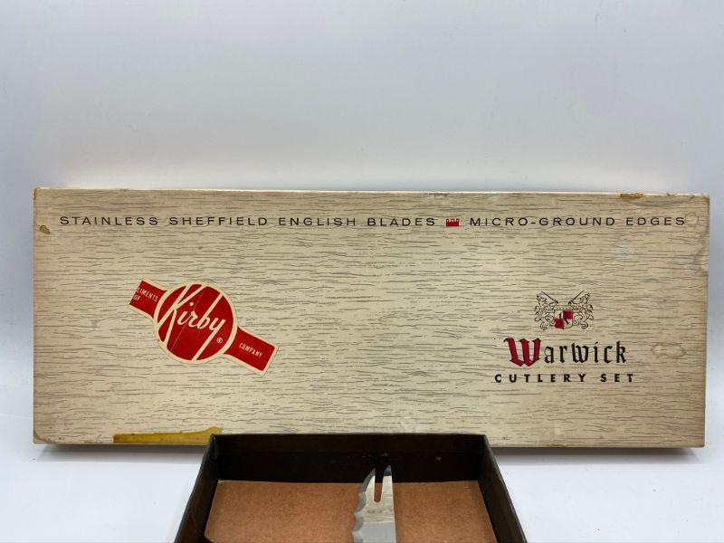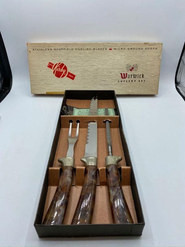 Warwick cutlery set. 3 piece set was a complimentary gift from Kirby vacuums. Looks unused. Some wear to the box.